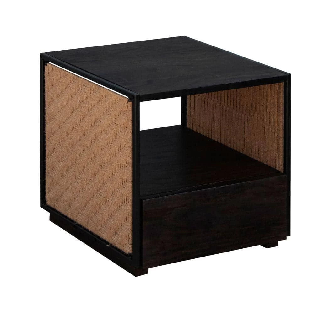 A cottage style meets the essentials of jute with this expertly crafted side table. Featuring a smooth gliding drawer to keep your essentials handy, it has an open cubby to keep books, decorations, handy accessories, and more. The woven jute side panels in natural tone add a unique character to the piece. Handcrafted from durable acacia wood and a sturdy metal frame, the dark brown wood finish compliments the black coated frame perfectly. Supported on a low, stable base, this clean lined table makes a gorgeous fit for your living room, bedroom, den or foyer easily.
