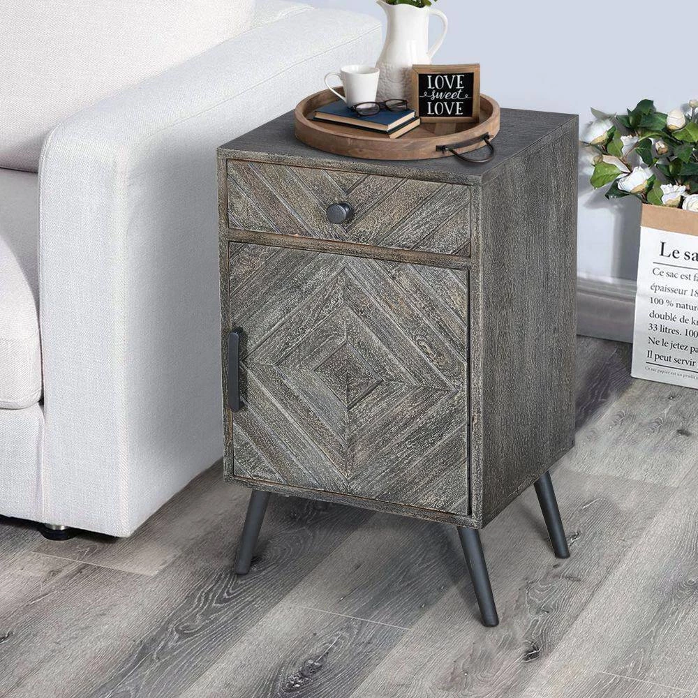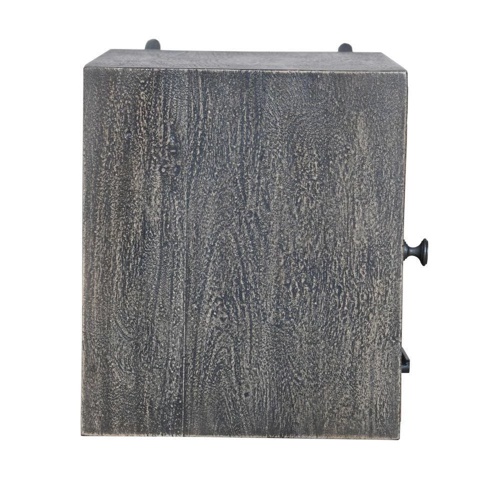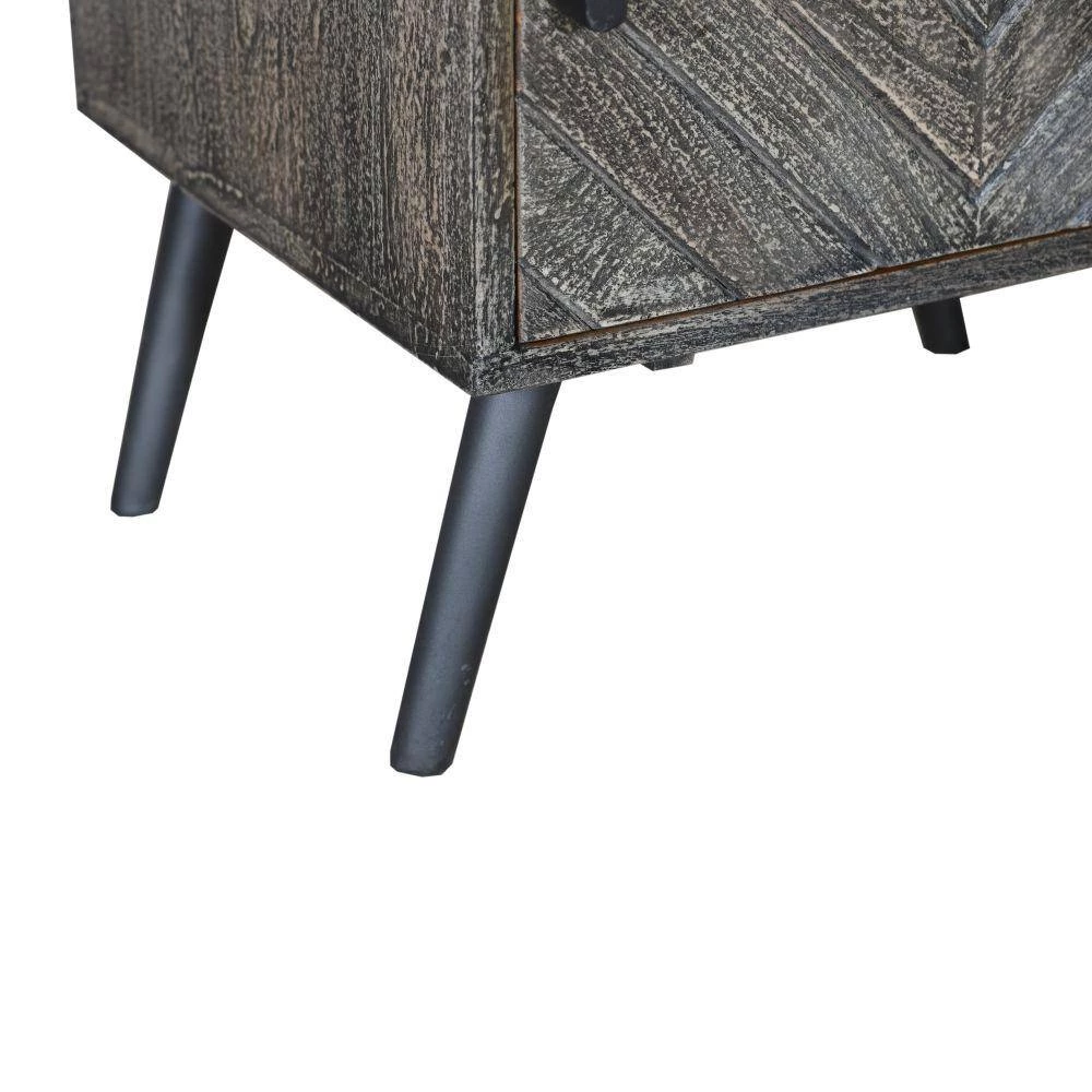 Quality craftsmanship blends with modern design to form this gorgeous transitional nightstand. Featuring an elegantly carved chevron pattern on the front panel, it comes with a smooth gliding drawer and a cabinet which opens to reveal a spacious storage compartment. Made from a combination of mango wood and composite wood, the frame is supported on knock down tapered iron legs. Accented with an elegant gray color coating, the aesthetically visible grain details impart an enchanting vibe to the piece.