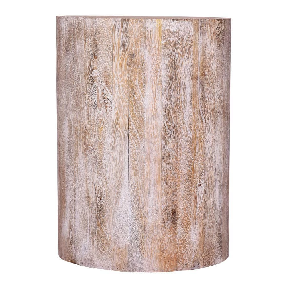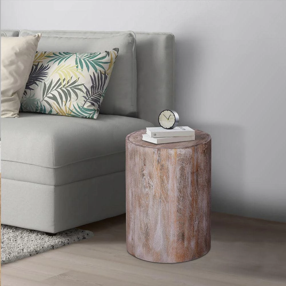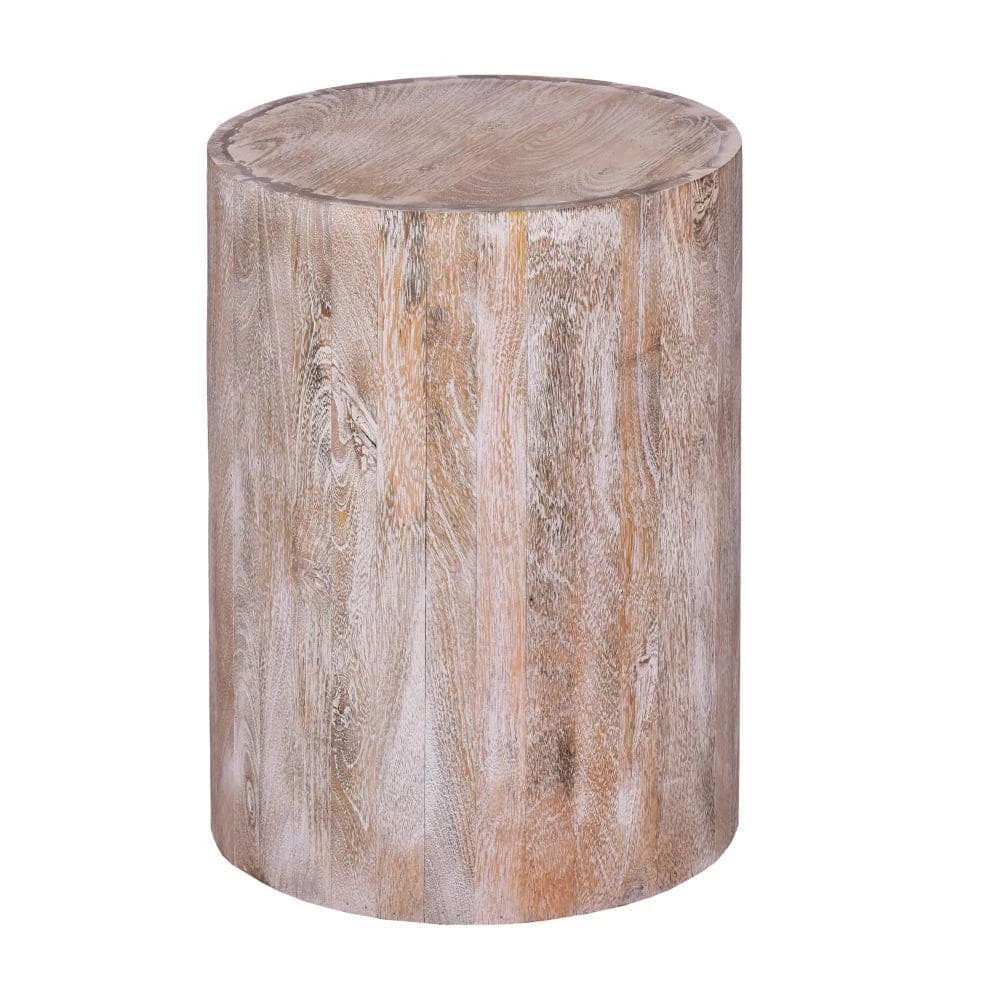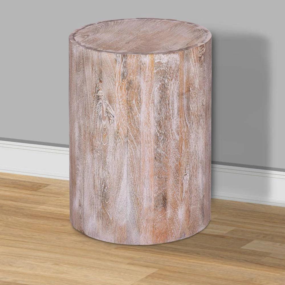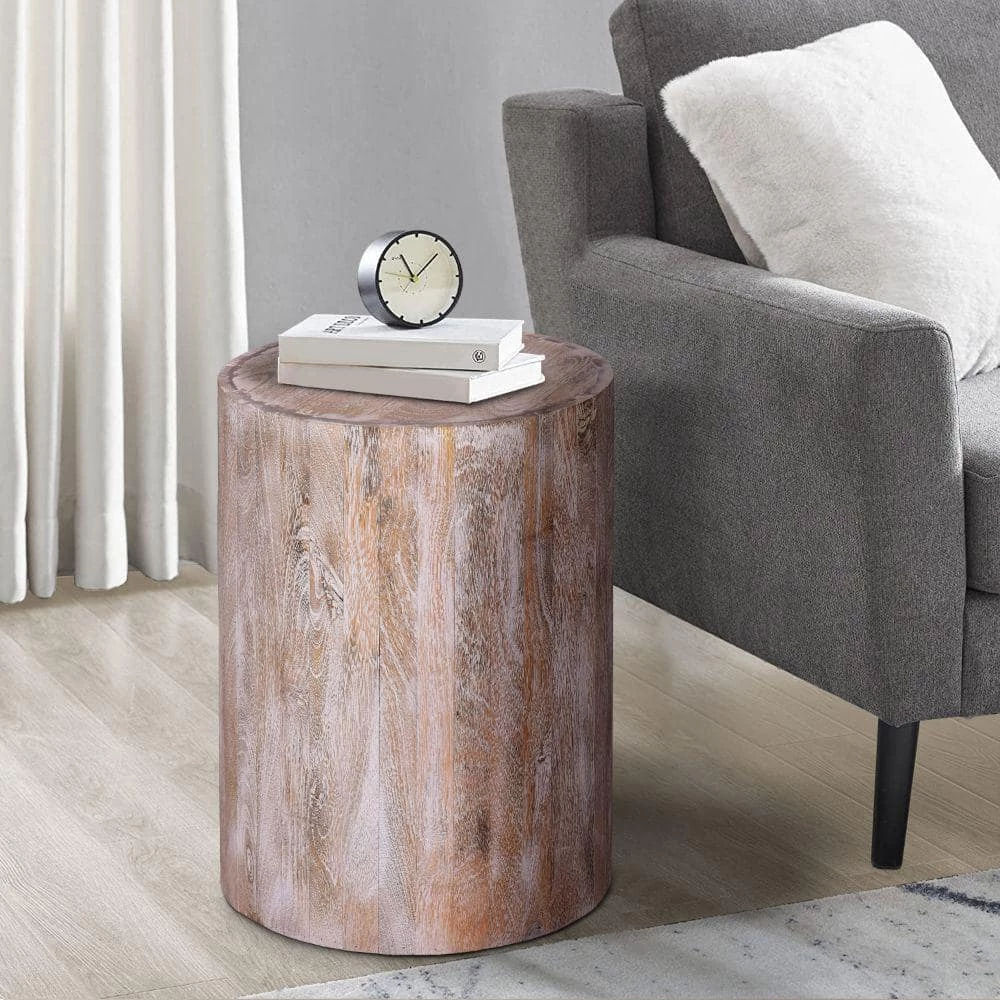 A fresh slice straight from nature, this drum shapes wooden accent end table with round top makes a delightful addition to your home decor. Depicting the clean and minimalistic natural wood grains, it is built with a simple but stylish round silhouette. Handcrafted from water resistant mango wood for lasting durability, the light natural brown accented top compliments the subtle grain finish of the wood. This table is a perfect accent for your living room, den, foyer, or bedroom. The piece, in its simplicity, is easily used as display top for your hand curated decor, potted plants, or books etc., sure to revamp your space and bring a confident, naturalistic style wherever you place it.