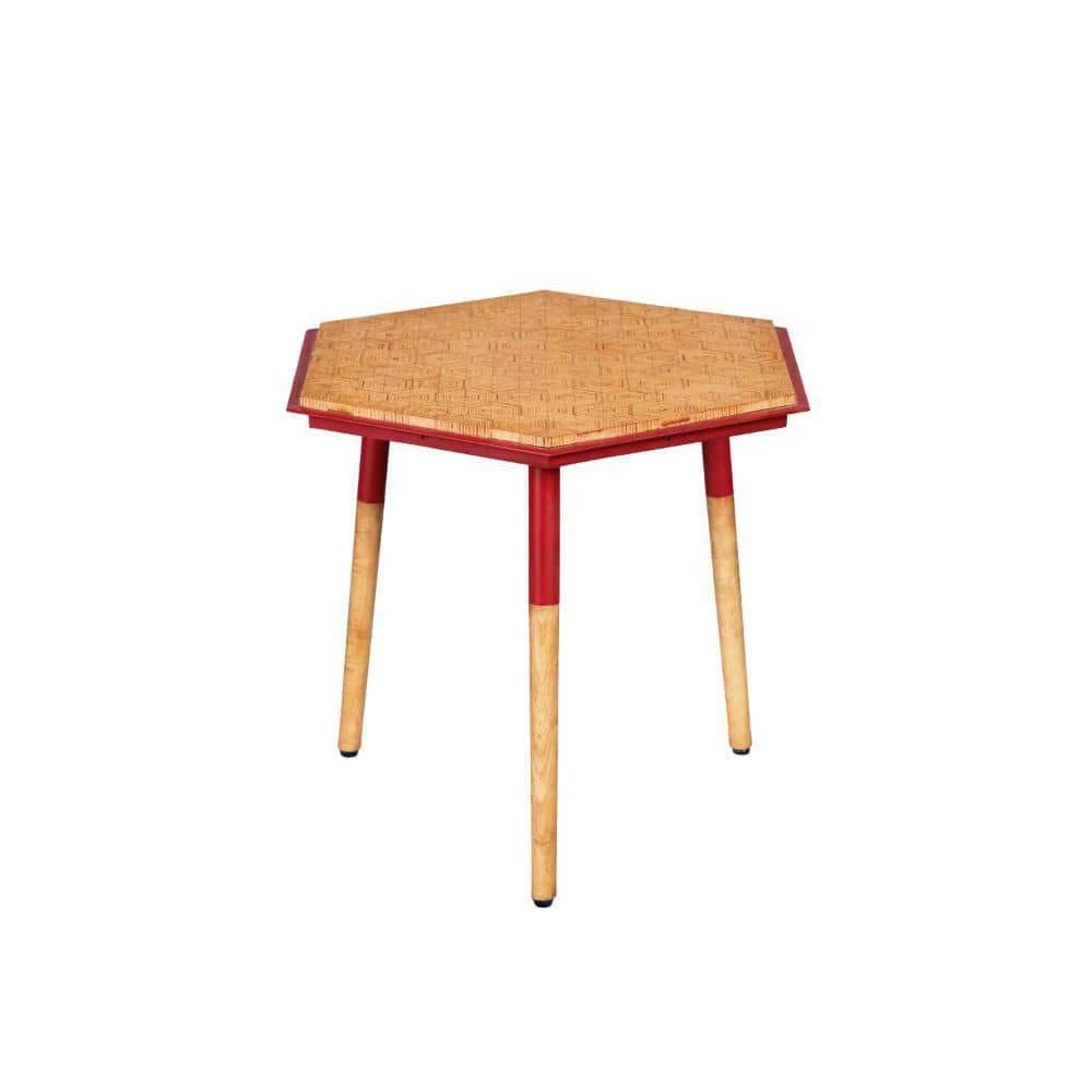 This unique handcrafted hexagonal metal side end table from the Paige collection is alluring to say the least. The red tone metal edges and capping on the legs compliment the brown finish of the hexagon pattern tabletop, resting on angled legs with floor protectors to prevent abrasion. This compact and stylish piece never fails to impress guests at your party.