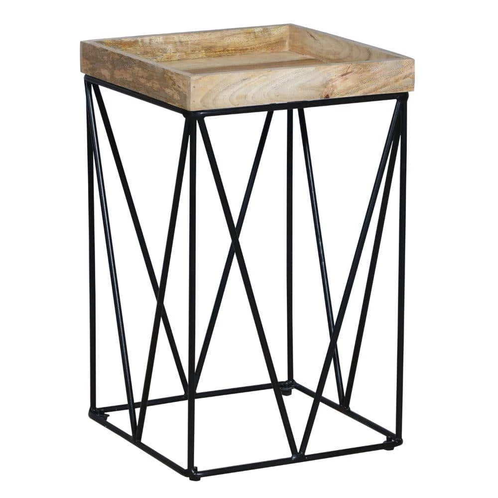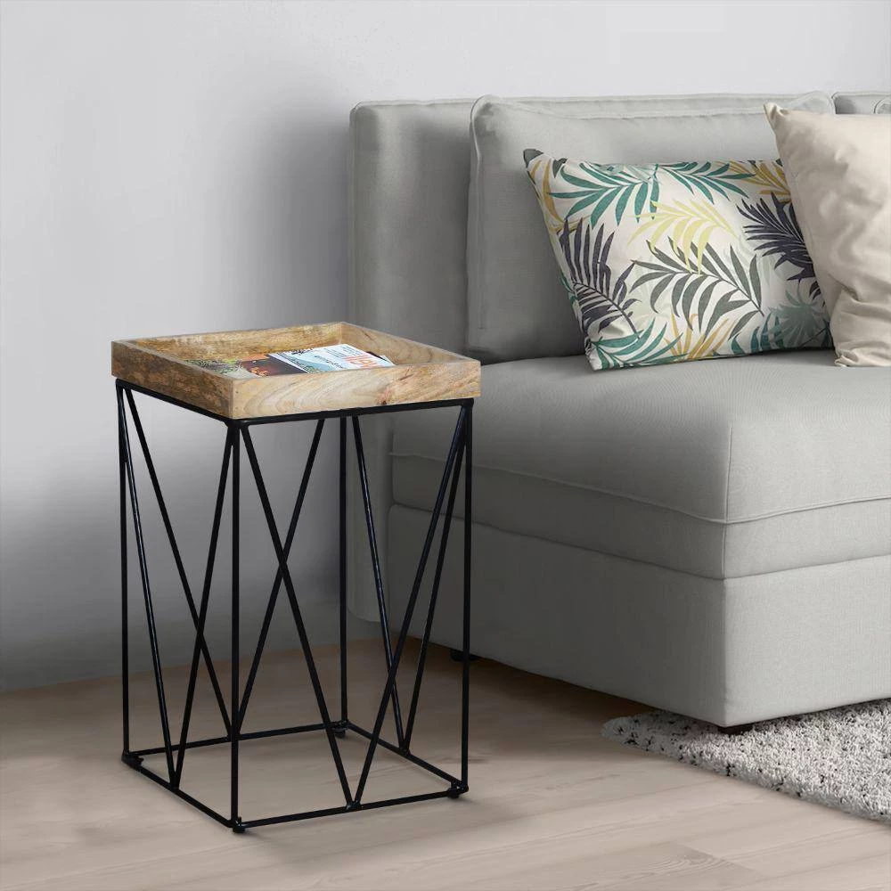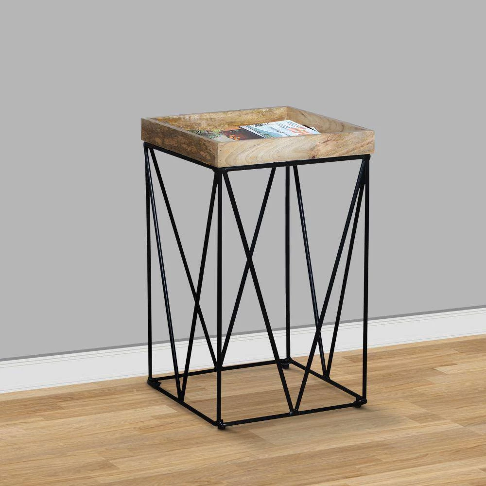Expertly crafted, this square end side Table is sure to add a charismatic flair to the aesthetics of your interior. Featuring a square tray style tabletop to prevent the items from falling off, it is supported on tubular frame with V shape bar accents. Handcrafted from durable mango wood and sturdy iron frame for lasting use, the natural brown accented tabletop compliments the striking black coated frame. The table not only offers a sophisticated abode to vases, showpieces, valuable collectibles and prized possessions but also adds a riveting character to your interior. The clean lined design allows this table to assimilate with a multitude of decor settings.