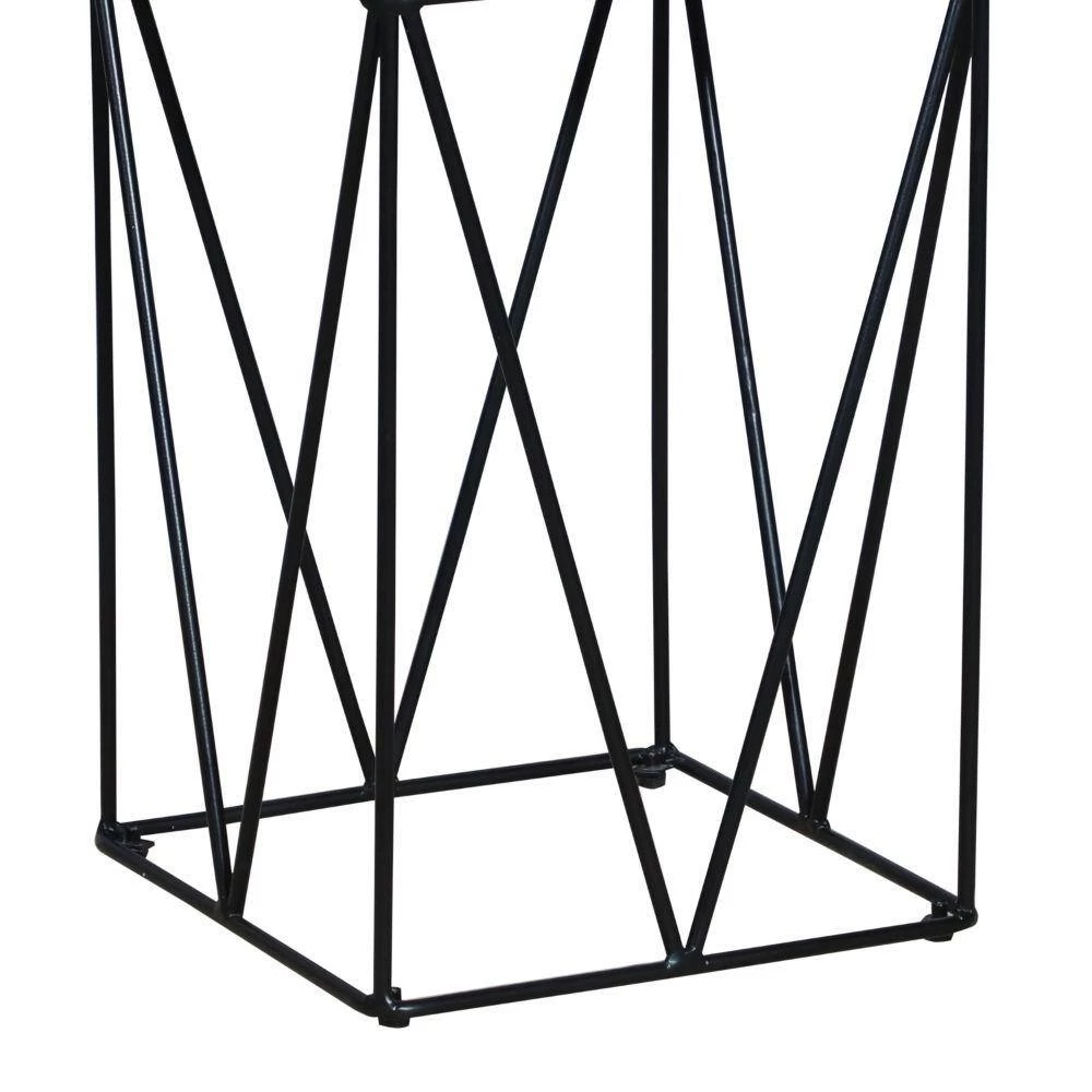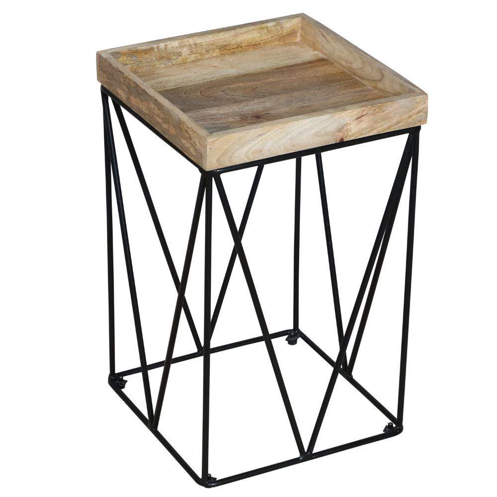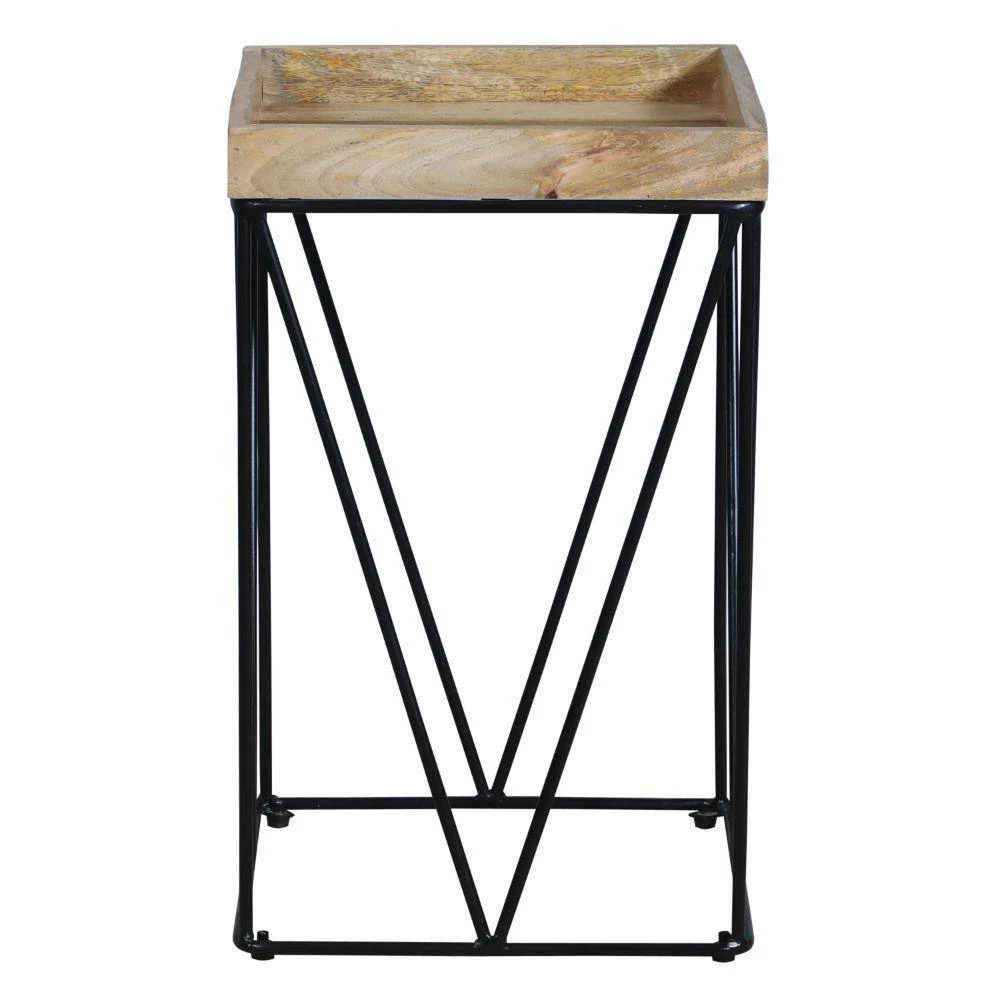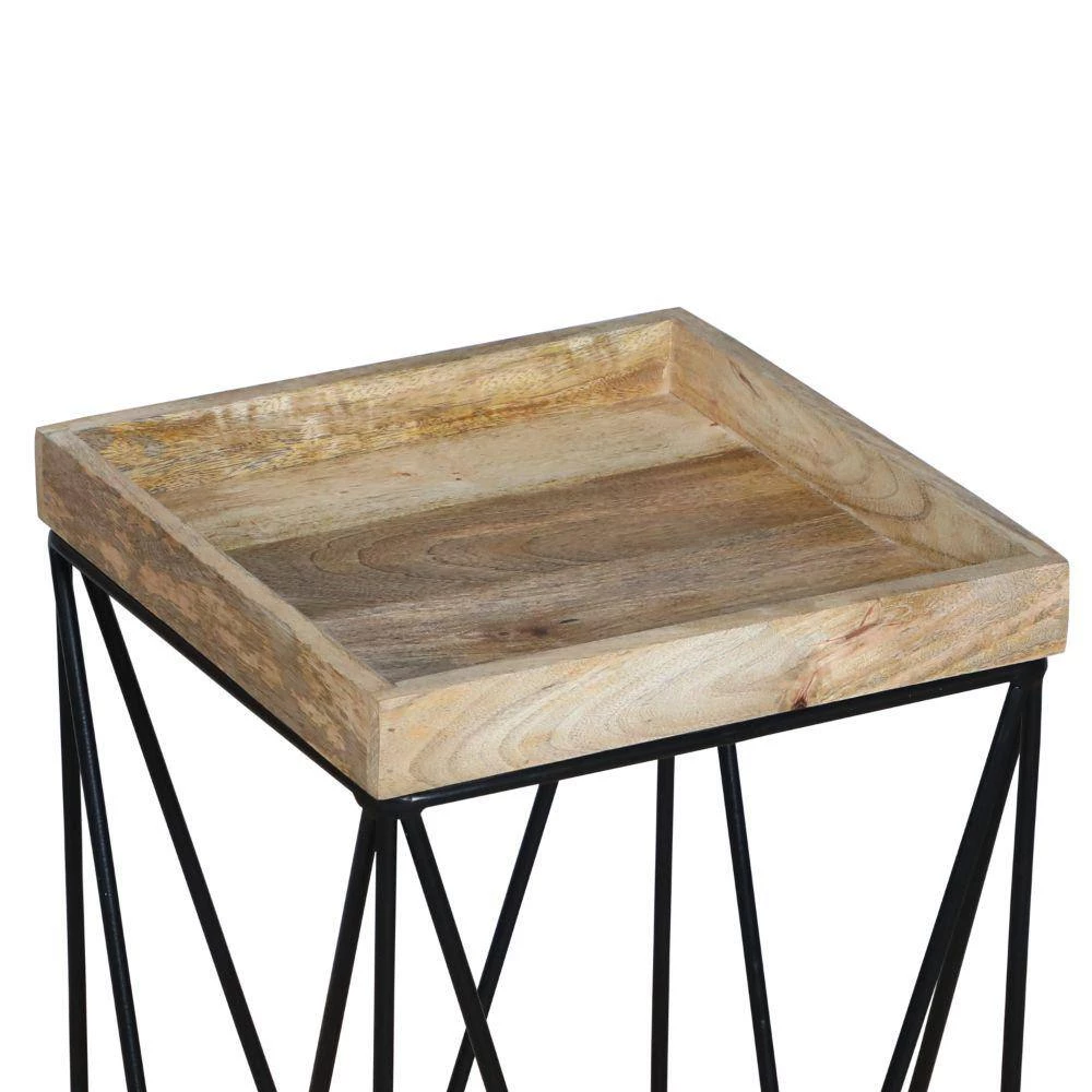Expertly crafted, this square end side Table is sure to add a charismatic flair to the aesthetics of your interior. Featuring a square tray style tabletop to prevent the items from falling off, it is supported on tubular frame with V shape bar accents. Handcrafted from durable mango wood and sturdy iron frame for lasting use, the natural brown accented tabletop compliments the striking black coated frame. The table not only offers a sophisticated abode to vases, showpieces, valuable collectibles and prized possessions but also adds a riveting character to your interior. The clean lined design allows this table to assimilate with a multitude of decor settings.