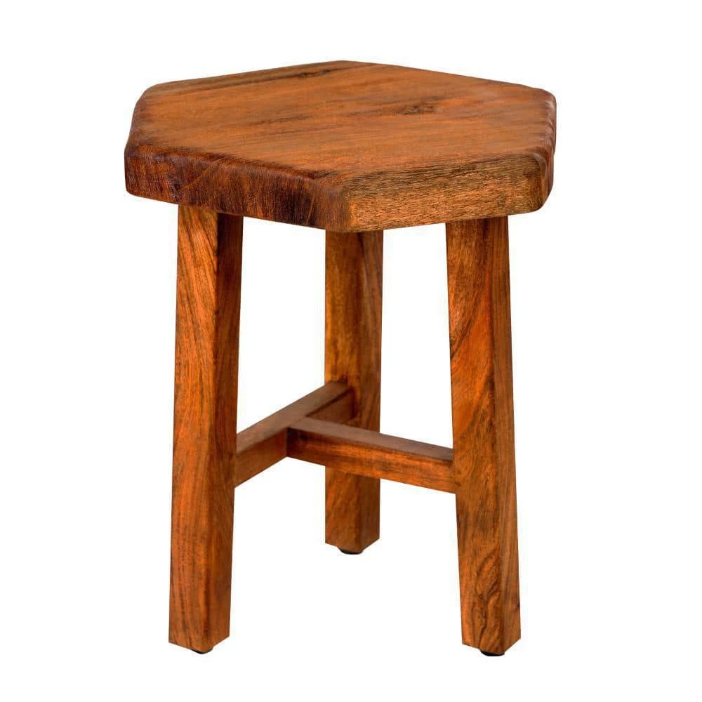 Inspired by the farmhouse style, this wooden side table depicts live edge details with a hint of rough saw hewn marks to add a natural appeal to your interior. Featuring a hexagon tabletop with replicated wood grains and knots, it is supported on 3-angled legs. Handcrafted from acacia wood frame in a warm brown finish, it is bolstered with rails for added stability. Reminiscent of a thick wood stump with stout edges, it is sure to add an interesting character to your place. From offering a convenient storage option within your arms reach while lounging on your sofa to providing a sophisticated abode to your collector items, this piece of furniture never fails to amaze you with its wide range of applications.