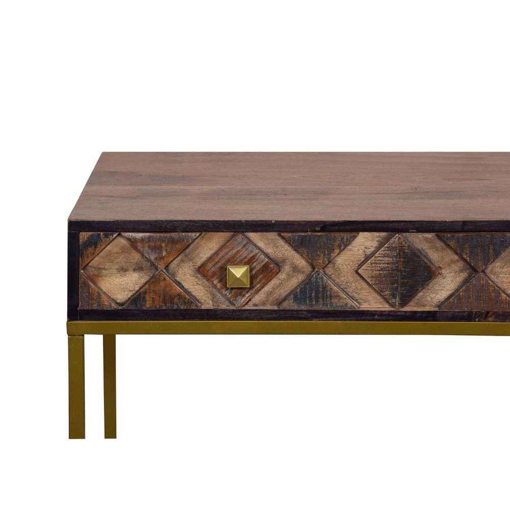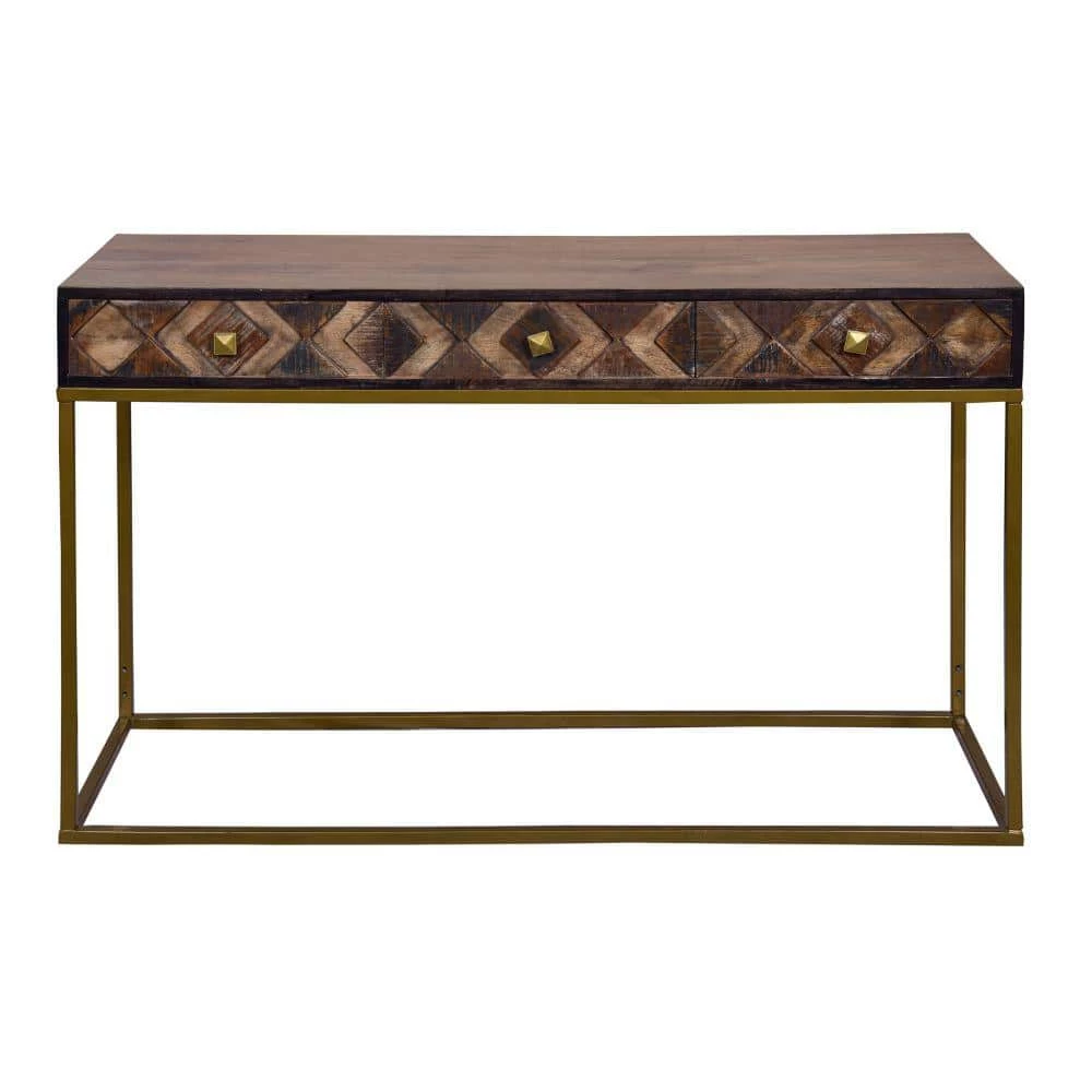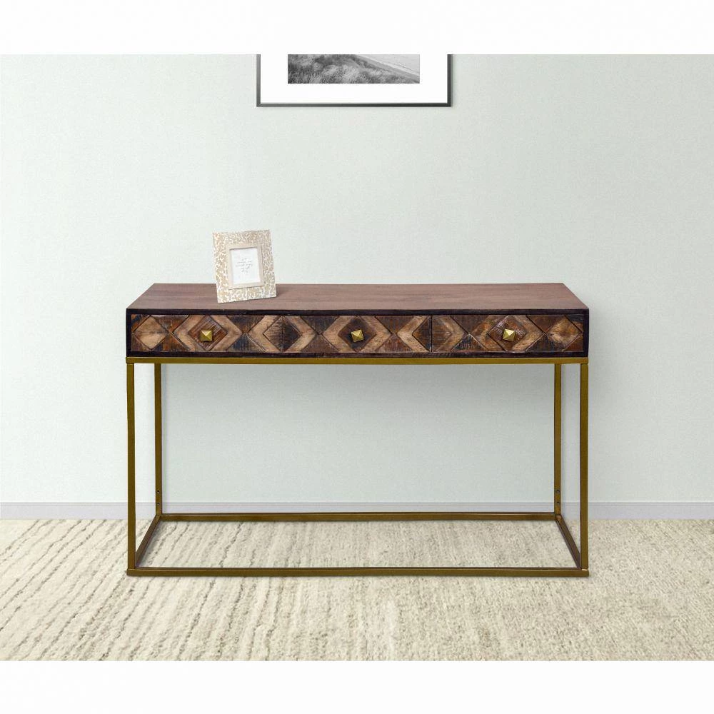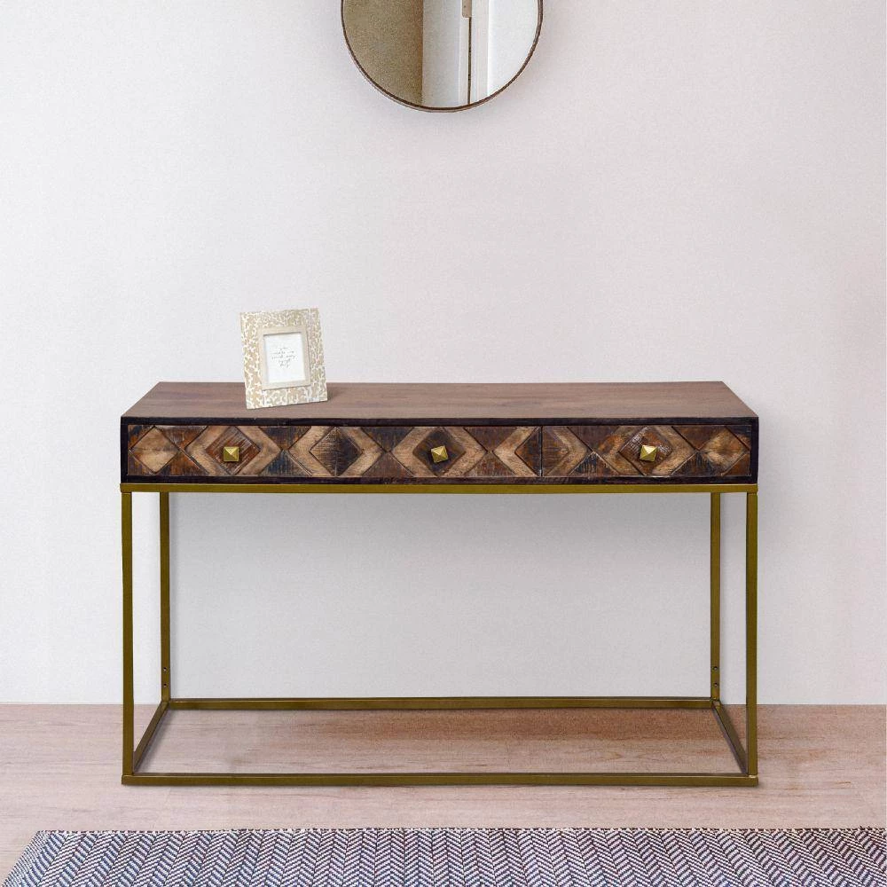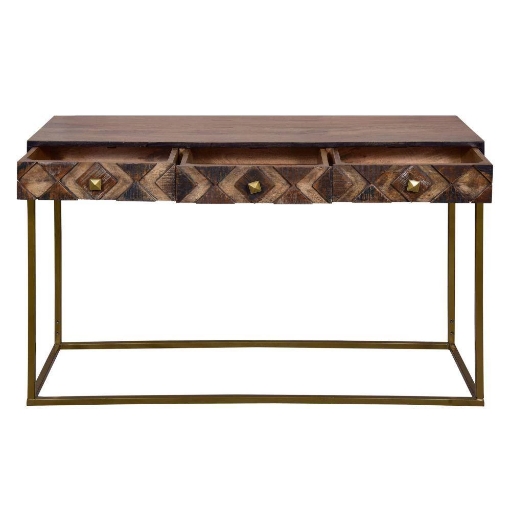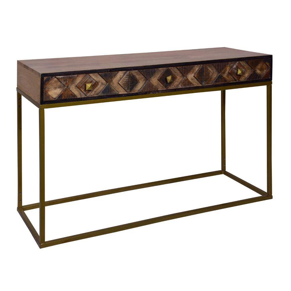 Upgrade the aesthetics of your hallway with the this expertly crafted yet simplistic style wooden console table with storage and metal frame. With three smooth gliding drawers that have a three dimensional diamond pattern on the panels, the piece has a captivating, luxurious attention to detail. Handcrafted from durable mango wood and recycled wood with a lightweight iron frame, the minimalist silhouette of the piece compliments its clean lined look perfectly. The medium brown accented wood body with weathered finish on textured panels and black border matches with the matte gold coated frame to create harmony and symmetry. Supported on a lightweight, durable metal frame with floor protectors to inhibit floor abrasion or scratches, the piece has subtle wood grain details that impart a nature inspired style to your hall, foyer, living room, dining room, or bedroom for years to come.
