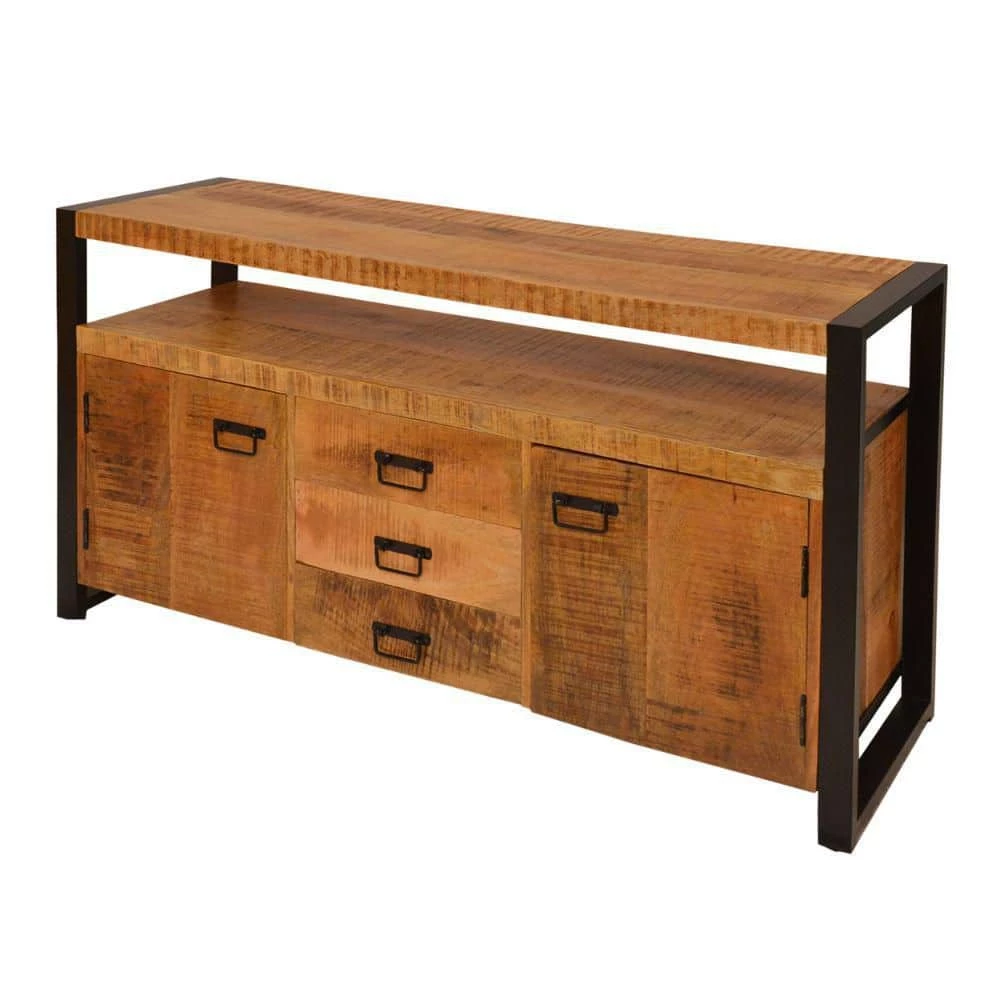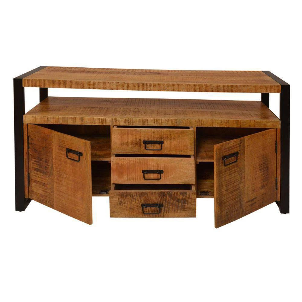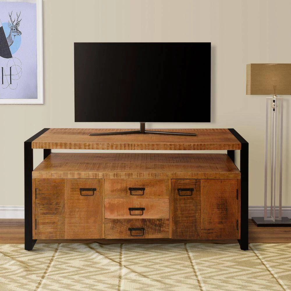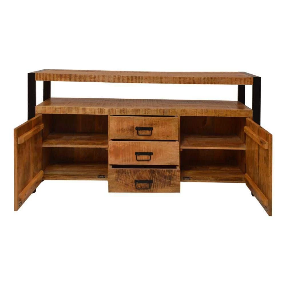Expertly designed, this media console TV stand makes a perfect fit for your living room or den. Featuring plenty of storage space with its 2-soft closing doors and three drawers, it has an open bottom shelf to keep your media devices. Handcrafted from a durable mango wood frame in a warm brown finish, it is supported on a sled-style iron base in a black powder-coated finish. Emanating a retro-style charm this TV stand blends in with a wide variety of decor styles. A perfect storage option for your media collections like CDs, DVDs, books, and more, it has floor protectors underneath the base to prevent abrasions.