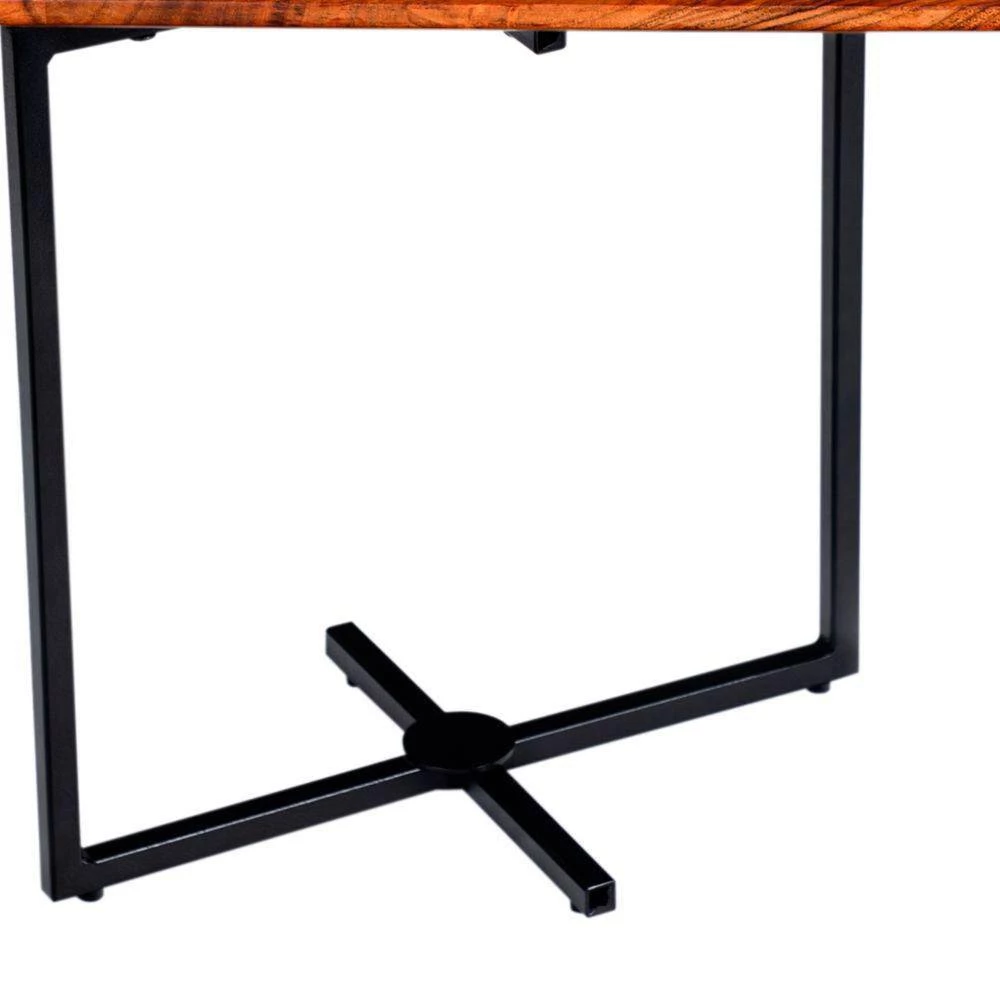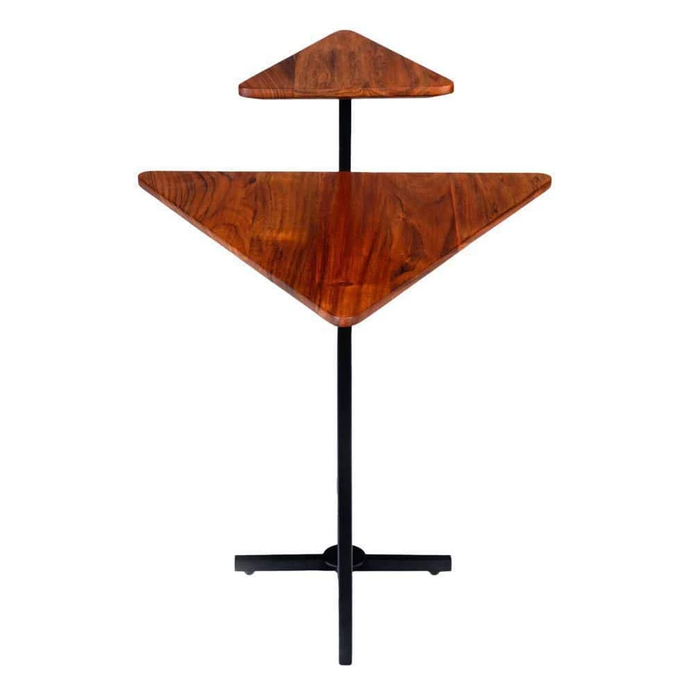 Intriguing geometric design meets industrial style with this accent end table from our Geo collection. With rich wood grain details for a natural appeal, the 2-tier triangular tabletops sit in perfect harmony with the lightweight but strong metal frame that extends to form a cross shaped support at the base. Handcrafted from real acacia wood and metal, the warm brown wood compliments the black powder coated frame. With clean lines and simple shapes, the design of this is fun to sit by with a drink or it is also perfect for showcasing collectibles or displaying books. In addition to being useful as an accent table, it makes a great compliment in your lounge or sitting area as a side table or end table.