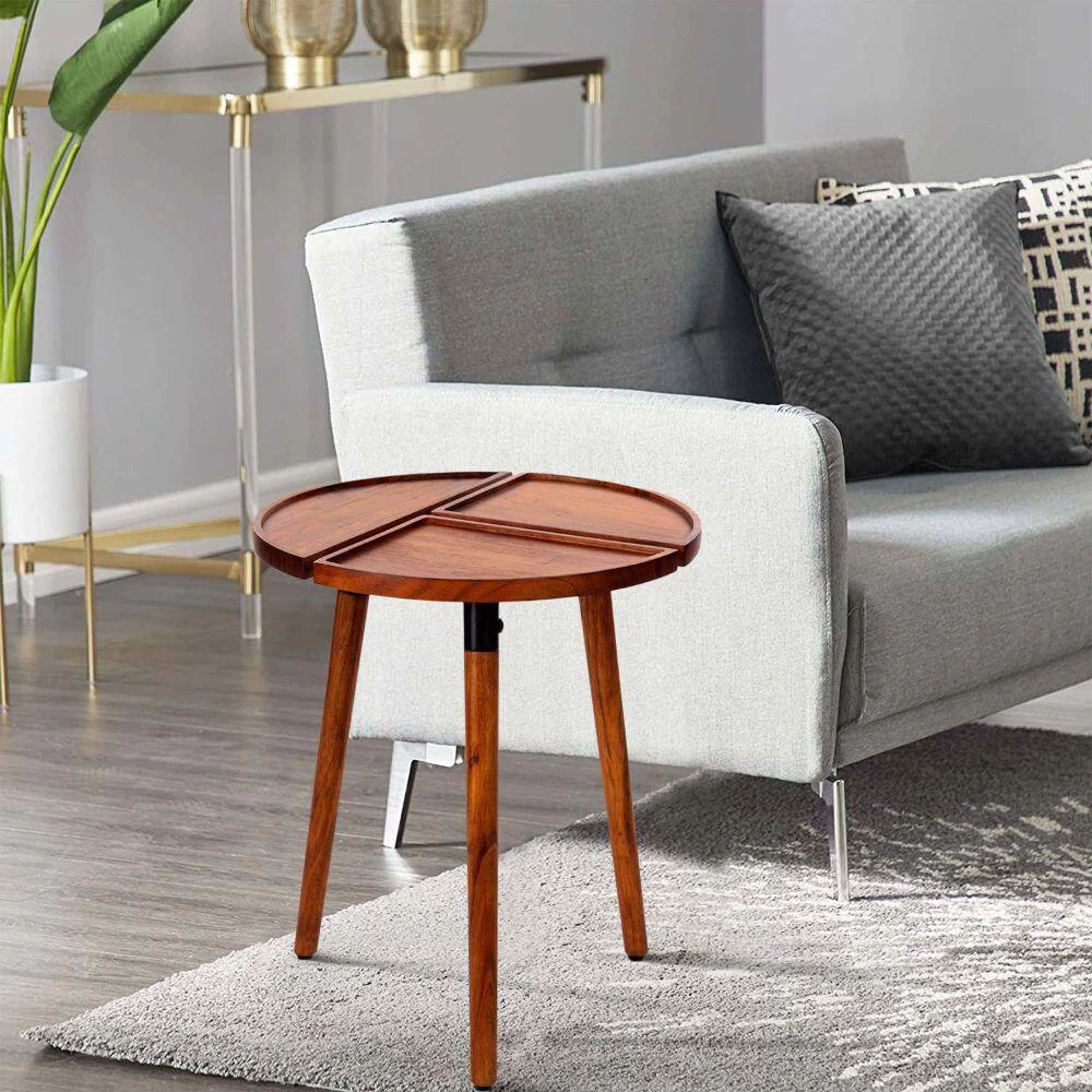Multi purposeful and unique, bring home this stylish wooden round side end table to bestow a specific space for decorative or valuable items. Handcrafted from acacia wood with metal fittings for added durability, it is supported sturdily on 3-angled legs with floor protectors to prevent abrasion. The warm brown tone of the solid wood resonates the black powder coated metal accent supports. Each area is separated with exactly a 12 mm space, which is slightly raised to prevents items from falling off or rolling into one of the separate areas. A perfect end table or side table for your living room, foyer, office, or lounge, this useful piece will bring value to you every single day.