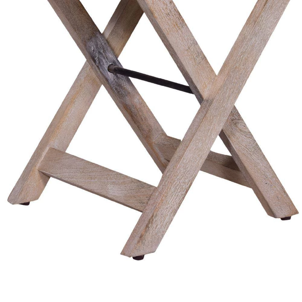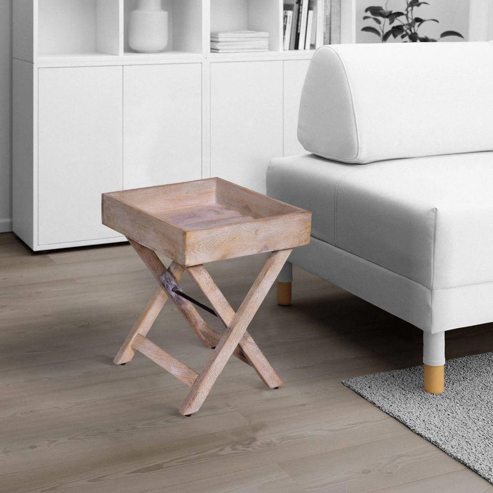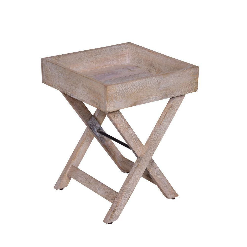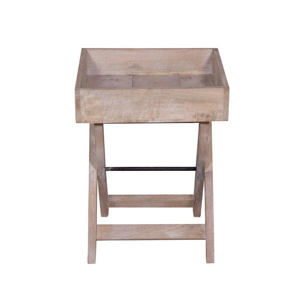 Reminiscent of rustic style craftsmanship, this wooden folding tray top end table adds a pleasant and homespun charm to your beloved interior. Featuring a square silhouette and raised tray like edges, this adorable end table is supported on an angled X-shape frame. Handcrafted from durable mango wood for lasting use and durability, it has a black accented iron stretcher that makes this piece easily foldable. The washed white accent in textured sand blast finish showcase subtle wood grain details, enhancing the rustic farmhouse appeal. The piece can also be used as a side or accent table to display your hand curated decorations, potted plants, household essentials, or collector items. The angled wood legs can be folded to save space when not in use. This lovely table is perfectly portable for use in your hallway, foyer, den, bedroom, or living room for years to come.