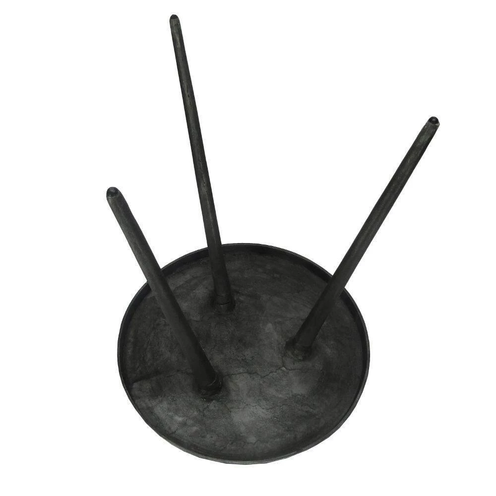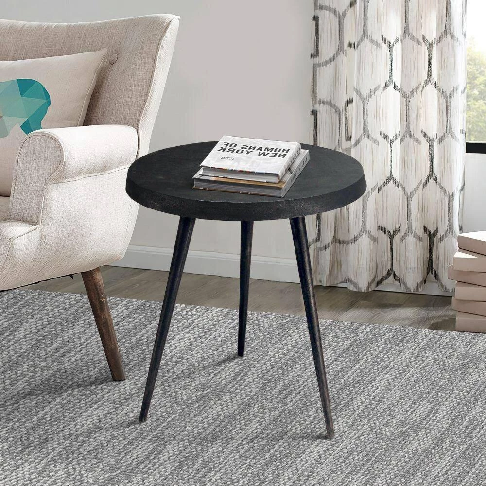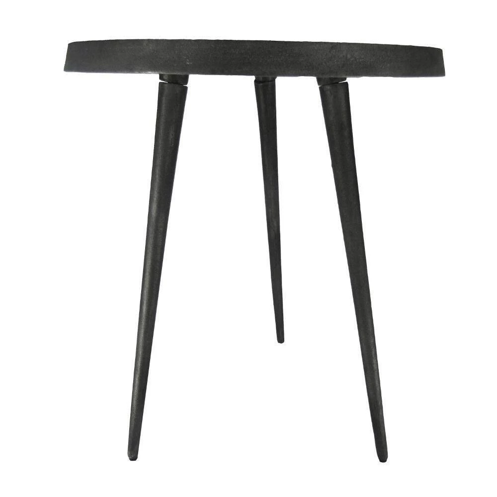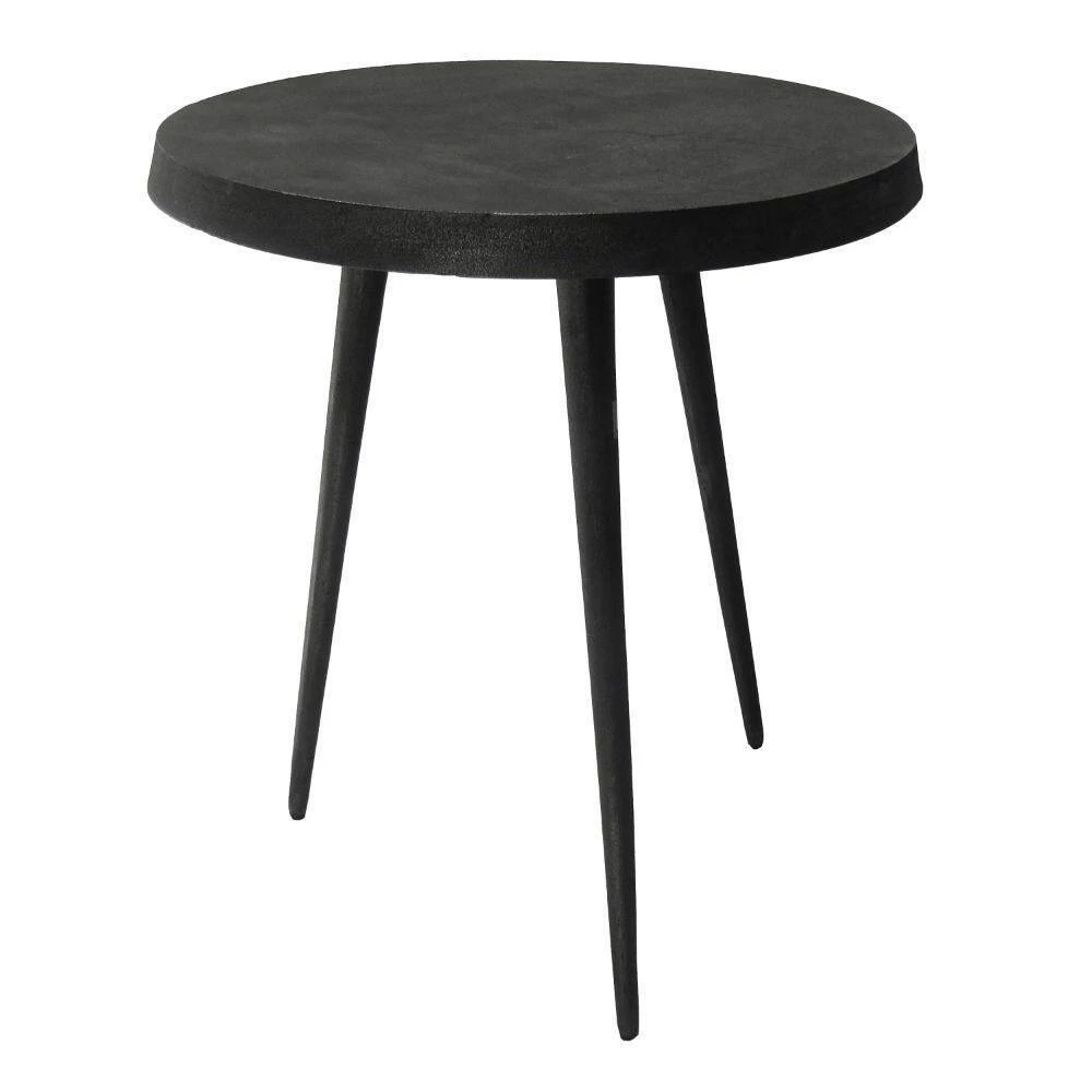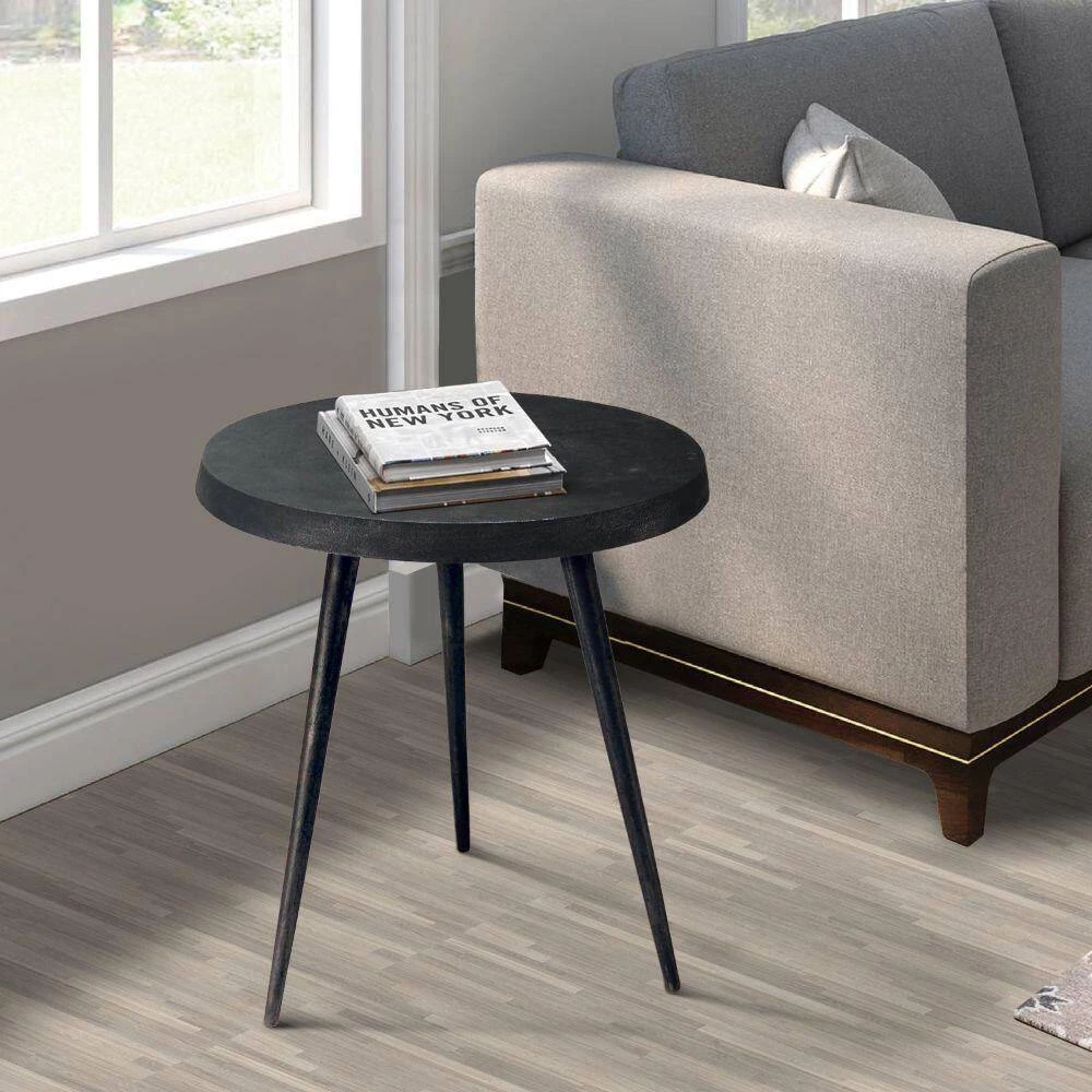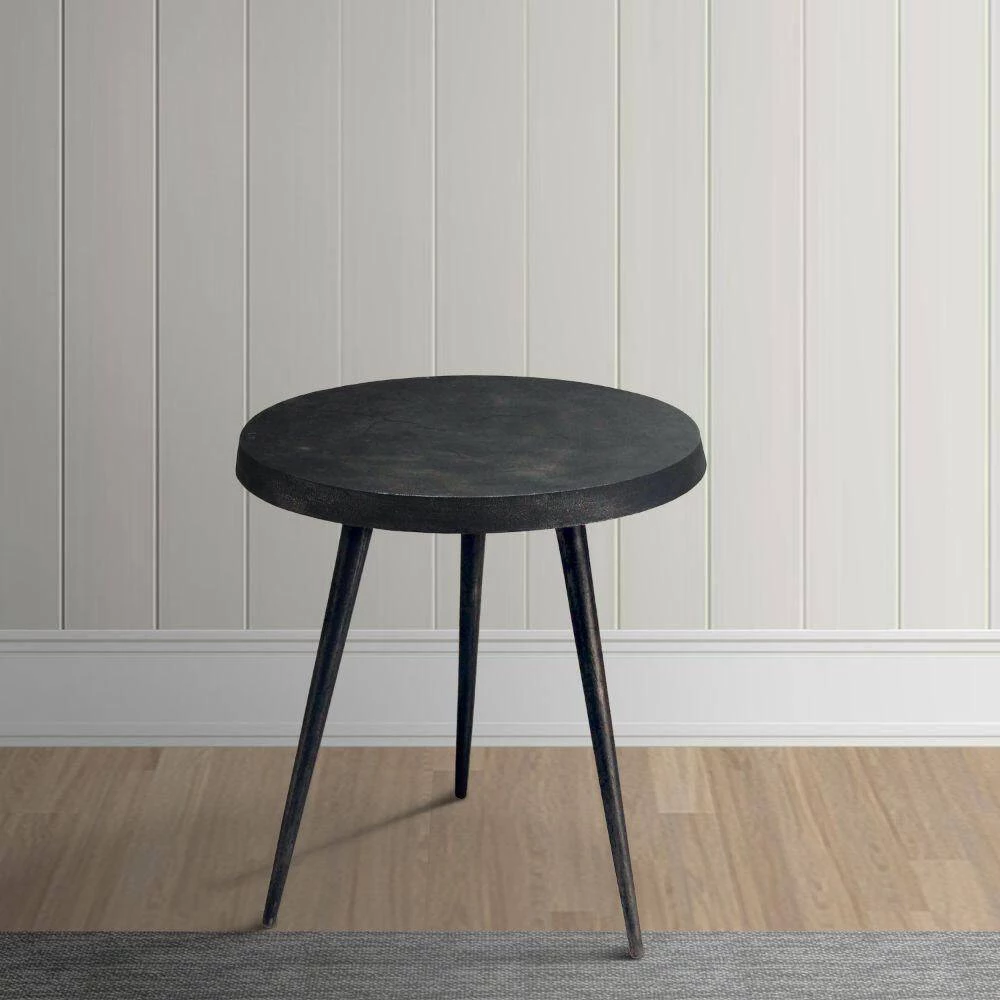 Expertly handcrafted, this modern round top metal side table features a subtle crackled design to grant a uniquely appealing character to your living space. With a round silhouette and a minimalist style, the piece rests on a knock down tapered tripod frame. Crafted from a lightweight aluminum frame for lasting durability, the charcoal black coating harmonizes perfectly with nearly any decor setting. From enjoying a cup of coffee to offering a designated space for keys, electronics and other items, this side table can also serve to showcase your exotic decorative, vases, figurines, or collector items. Be it your living room, bedroom, den, or office space, this accent side table adds an undeniable strong presence to your interior for years to come.