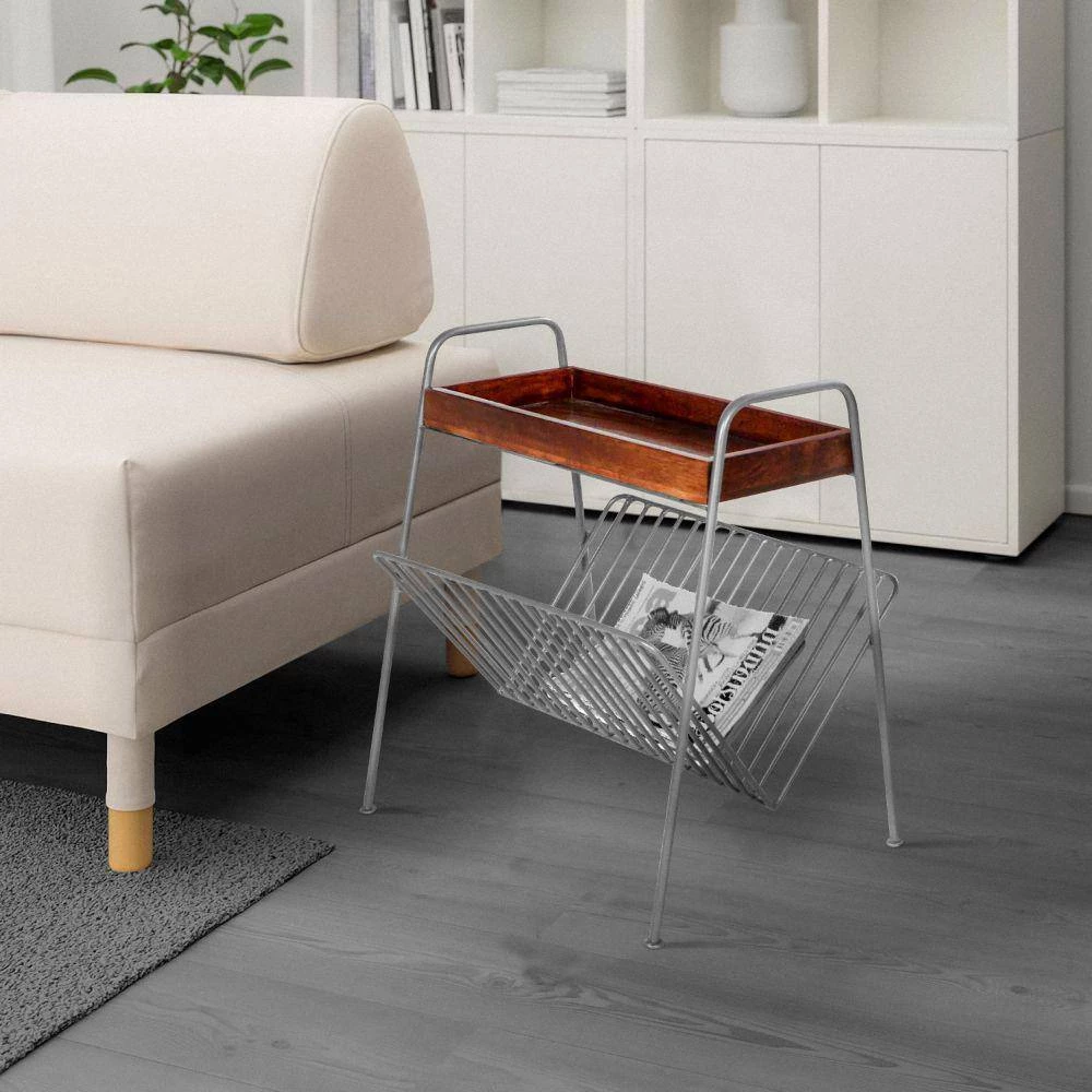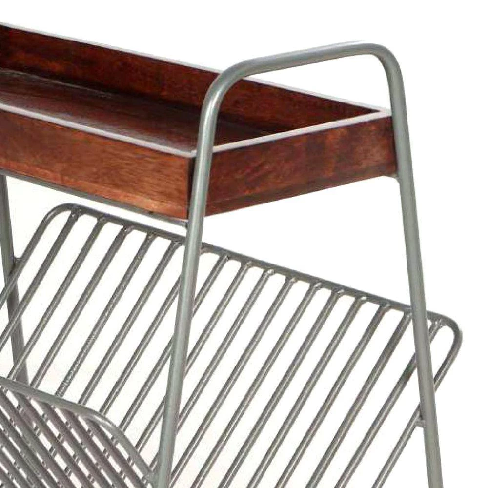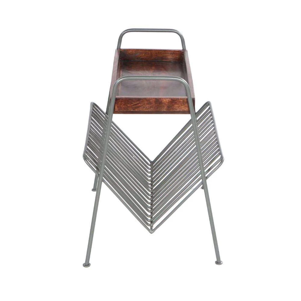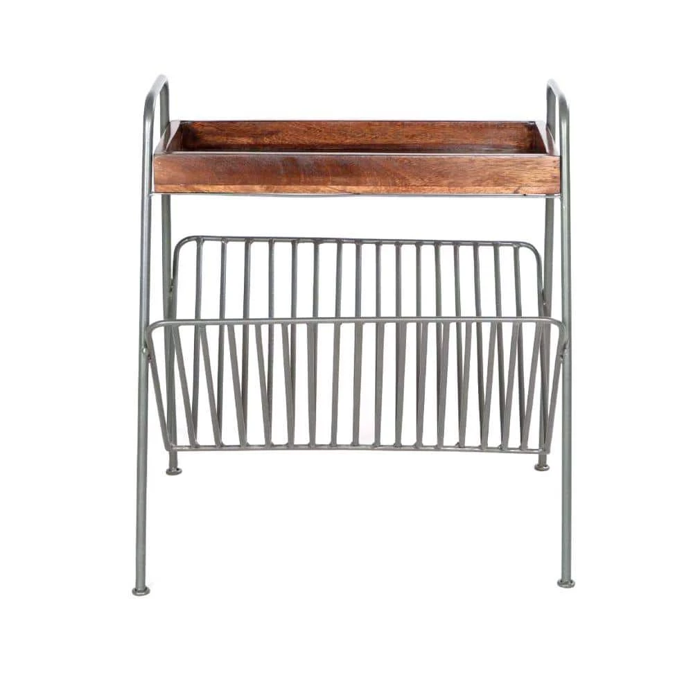 Depicting a timeless design, this expertly crafted wooden side table with magazine rack and storage makes a gorgeous fit for your entryway, foyer, lobby, or lounge. Featuring a top-shelf with raised tray-like edges to keep keys, mail, and other related items, it comes with a slatted shelf to keep your magazines organized. Handcrafted from durable mango wood and a sturdy iron frame, the dark walnut brown wood finish complements the pewter gray coated frame. Supported on sleek flared legs with floor protectors to prevent abrasions, the tray top exhibits subtle wood grain details for a nature-inspired charm. This meticulously designed table blends in with a wide variety of decor styles.