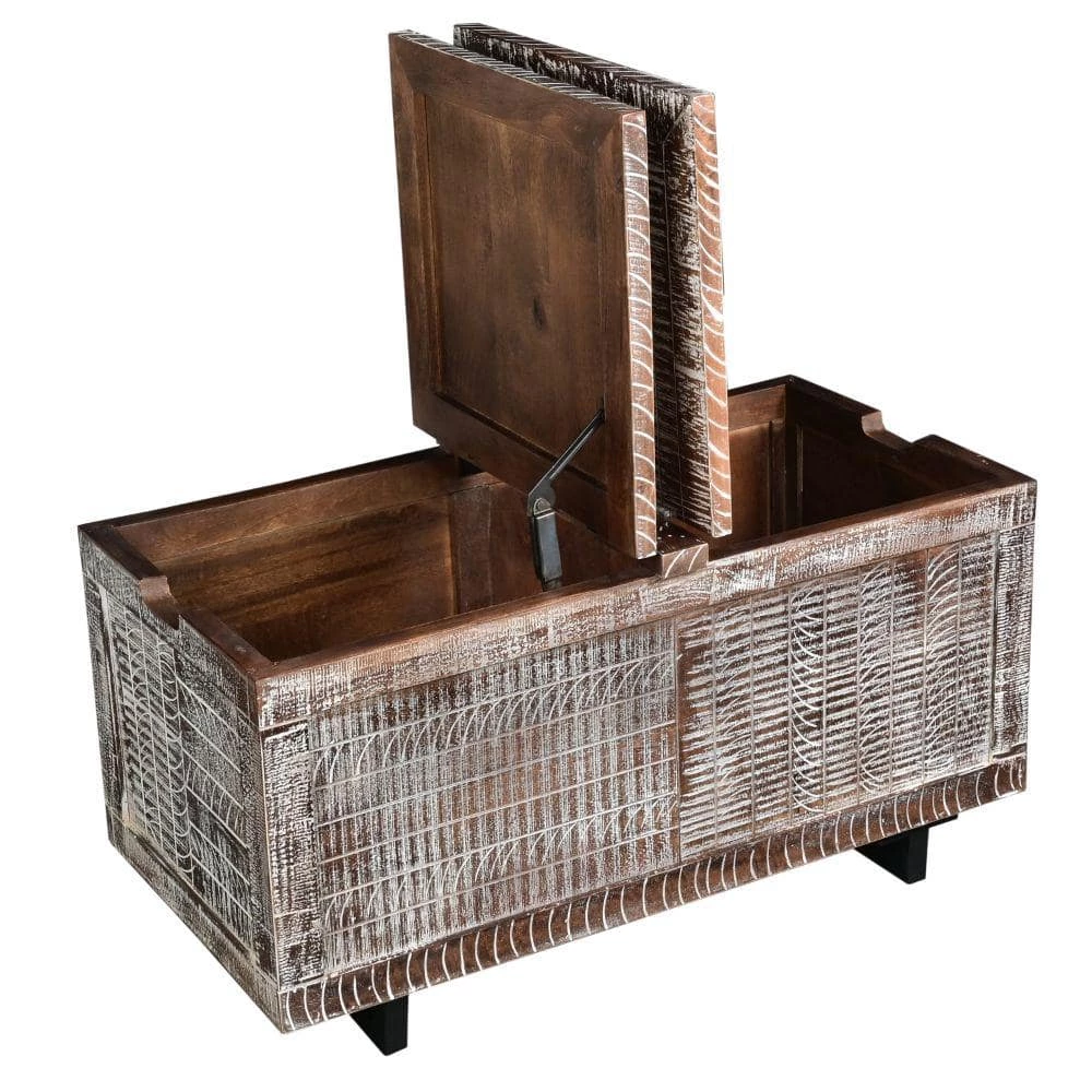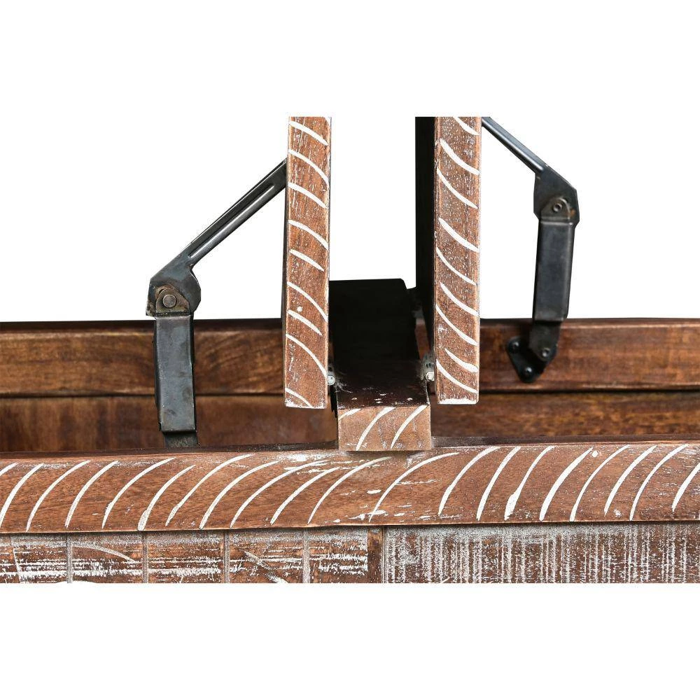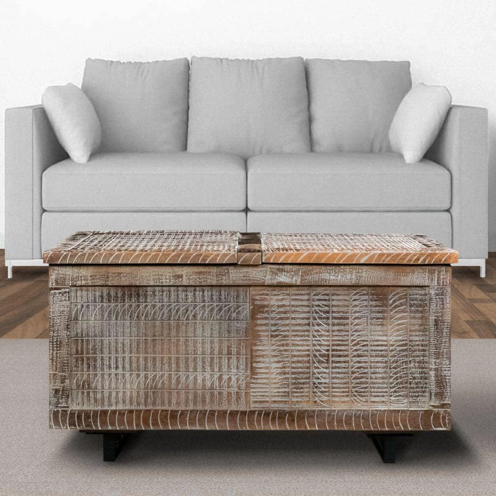 Add a rustic flair to your living room, lounge, lobby, or den with this salvage inspired coffee table trunk. With a firm, rectangular shape, the top lifts to reveal spacious storage for accent pillows, blankets, and linens, while a sturdy acacia wood frame provides the piece with lasting durability. It is supported sturdily on a metal sled base for stability and a distressed brown accented wood finish complements the black coated metal legs.