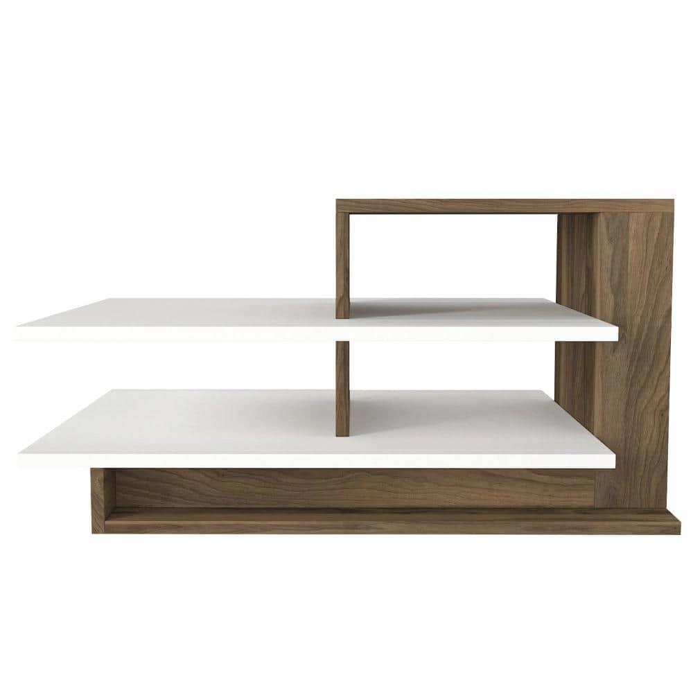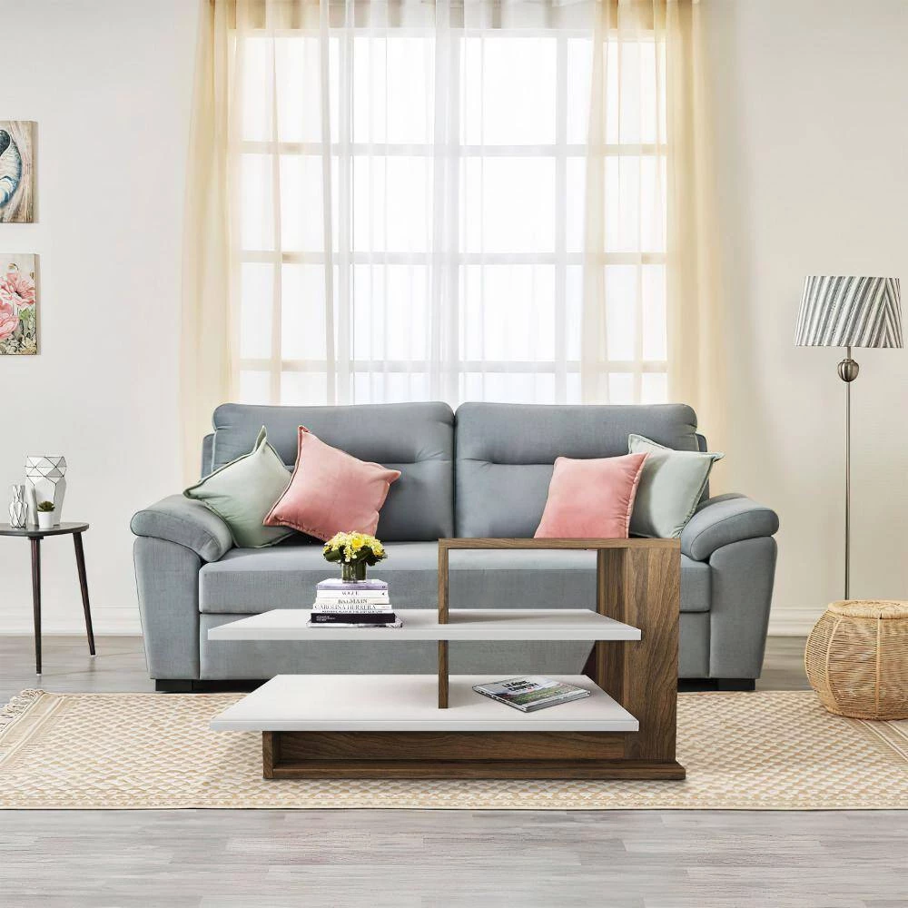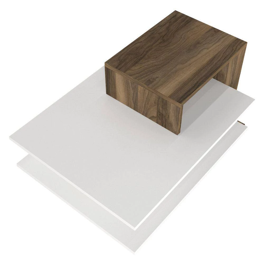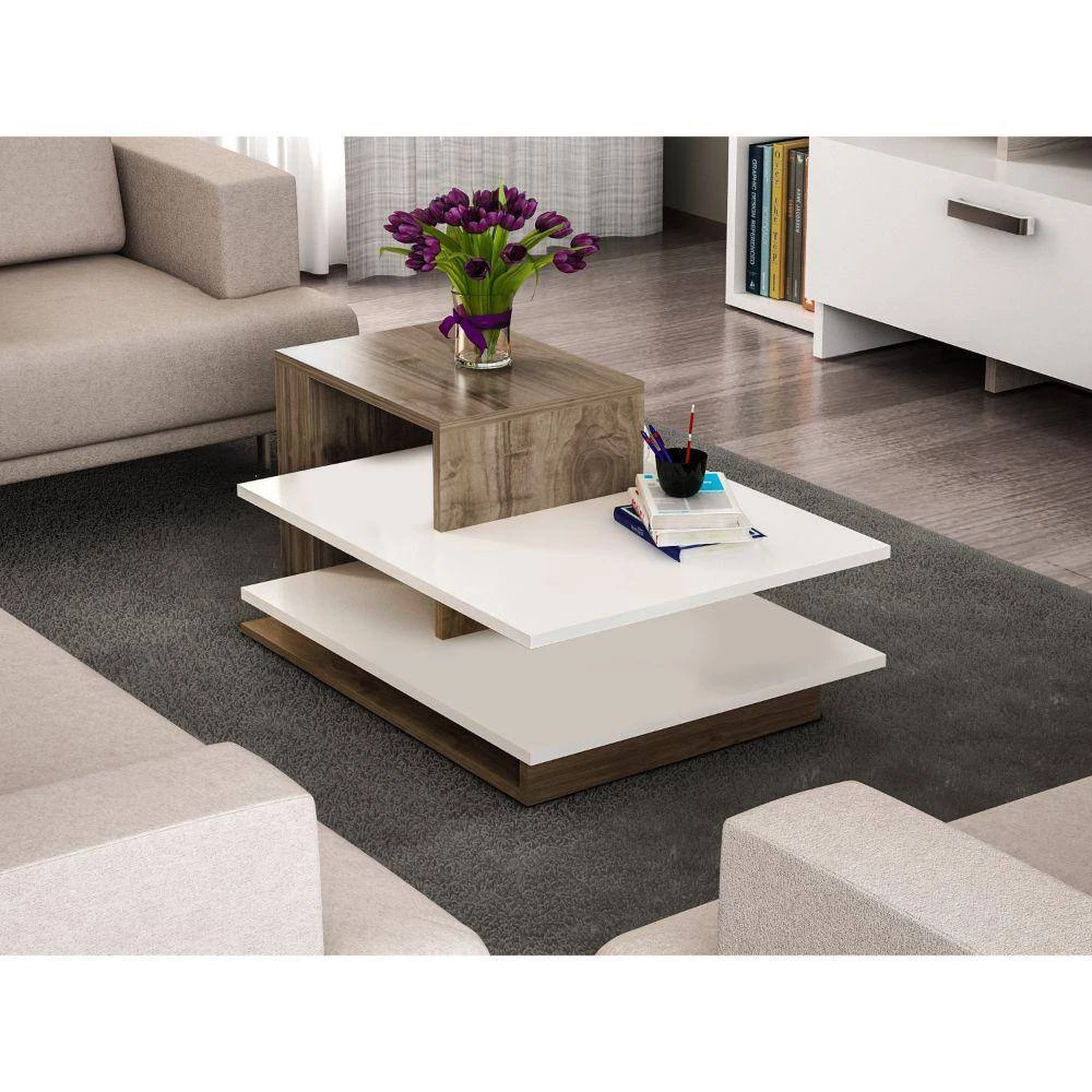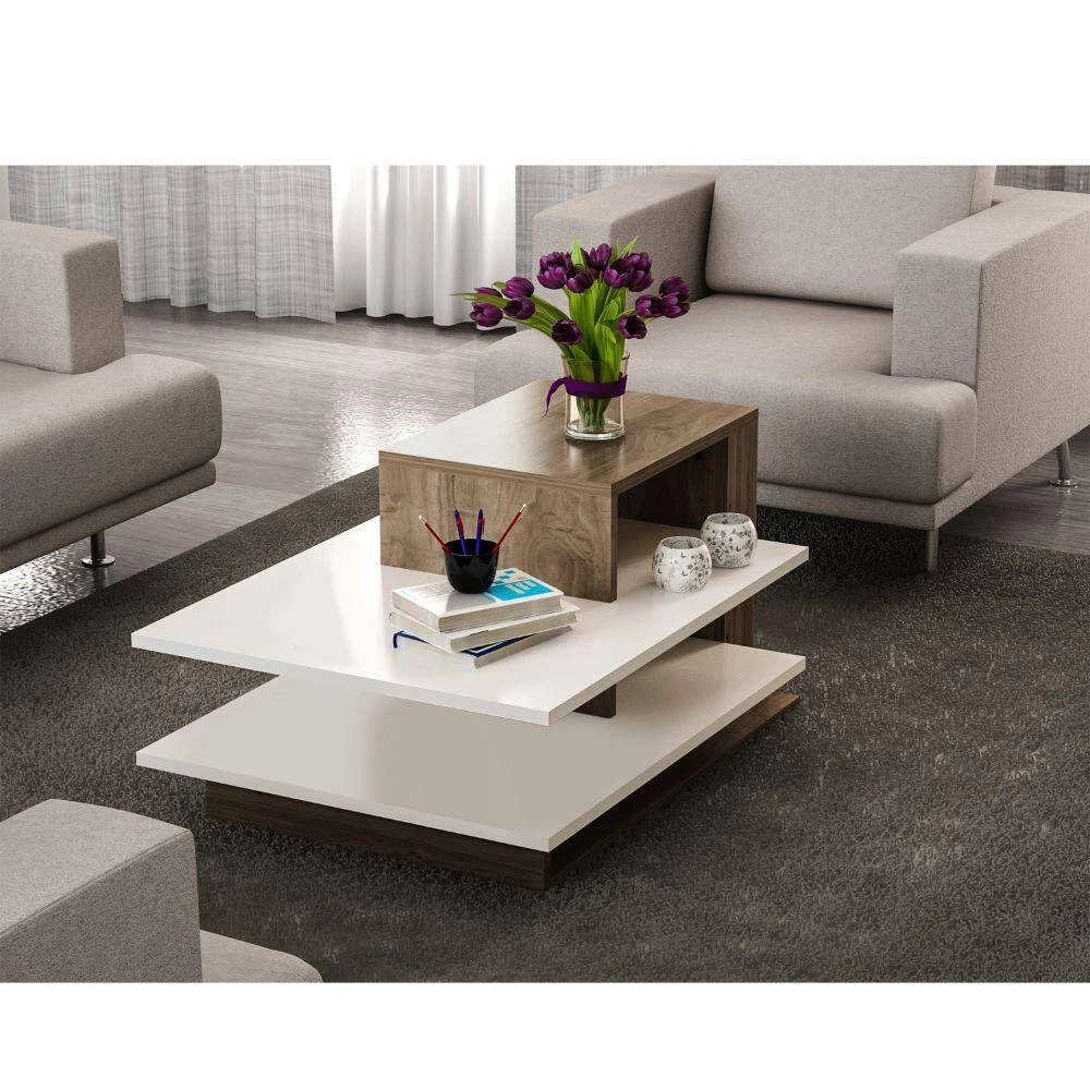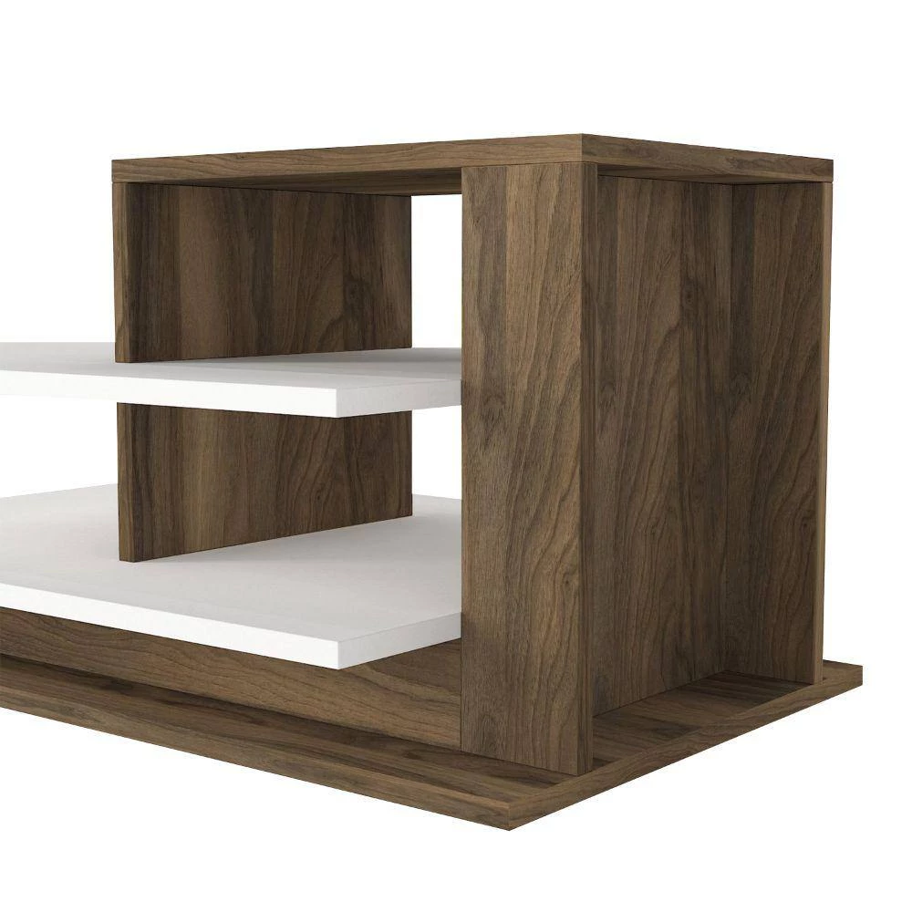 Contemporary in style with a clean lined, modern design, this rectangular wooden coffee table with shelves from our premier Belle collection exhibits a unique tier design with excellent craftsmanship. All three beautiful tiers are handcrafted from durable, premium quality particle board, allowing for easy and accessible storage, while the melamine coating protects the surface from hot or cold items, when placed over it. The elevated natural brown accented top offers a sophisticated space for exotic vases and potted plants, while the glossy white coated rectangular shelves offer space for curated display of accent figurines and sculptures, as well as living room essentials such as glasses and electronics. The bottom shelf serves as a perfect home. for your magazines and books, or other handy nearby items. Bring a new unique style to your living space with this amazing modern coffee table.