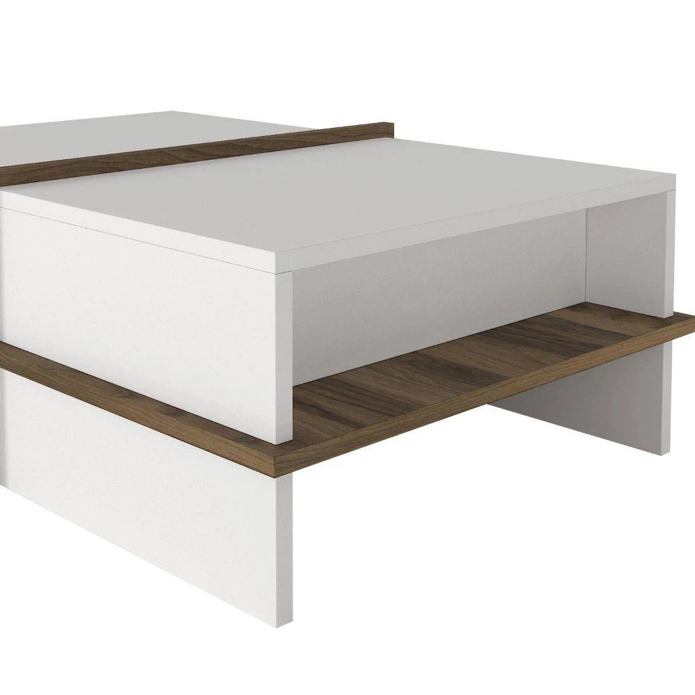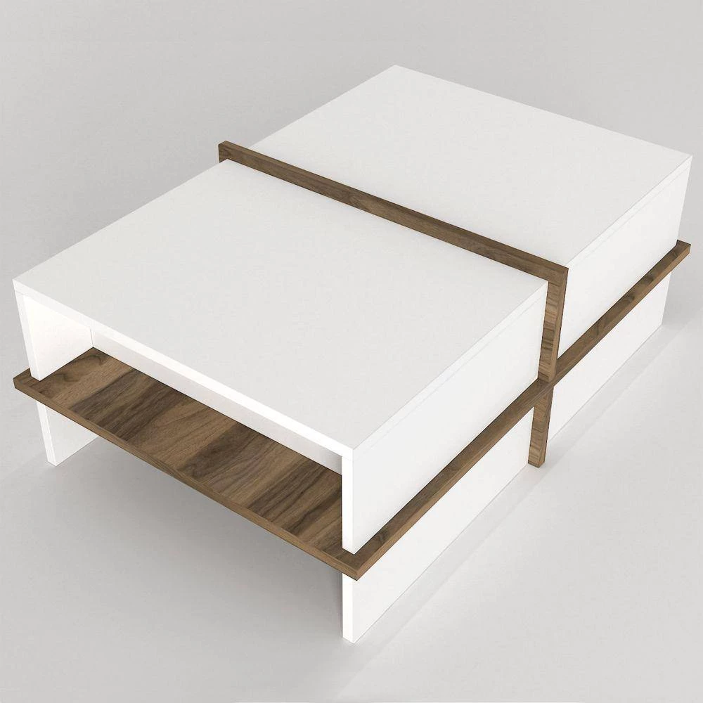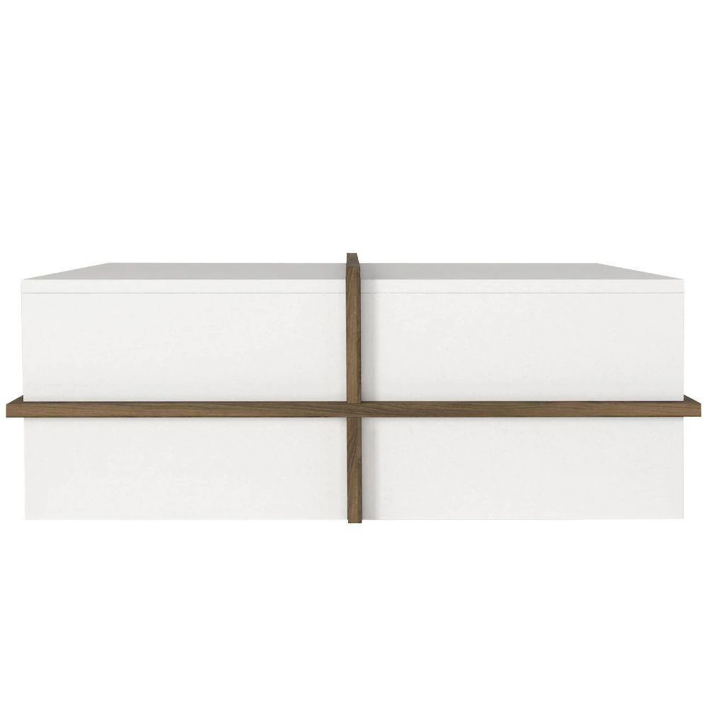 Sporting a sleek, geometric shape with a beautiful, symmetrical clean lined appeal, this Scandinavian style modern wood rectangular coffee table with side shelf is guaranteed to be a stylish addition to your living room, den, office, or lounge. The wood trim in natural brown visually separates the table top in an aesthetically pleasing way, giving this piece a classy yet modern appeal. Handcrafted from durable but lightweight premium quality particle board, the melamine coating protects the surface from hot or cold items when placed over it. The glossy white coating harmonizes perfectly with a variety of decor styles, and the accent side shelf serves as a sophisticated space to curate your hand picked decorations and photos. Check out more options from our premier Belle collection.