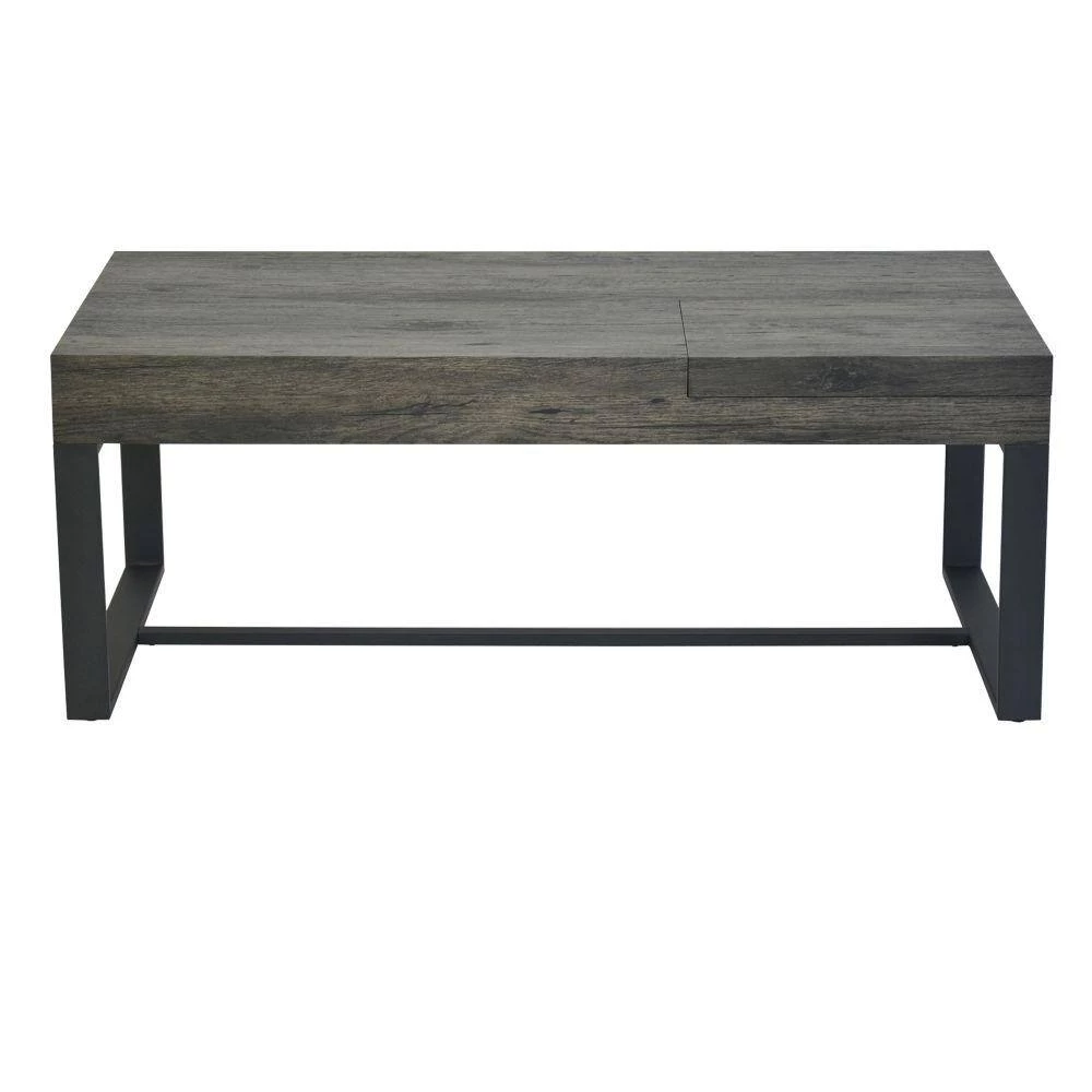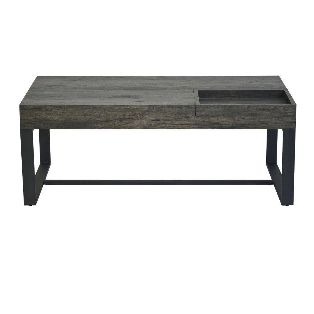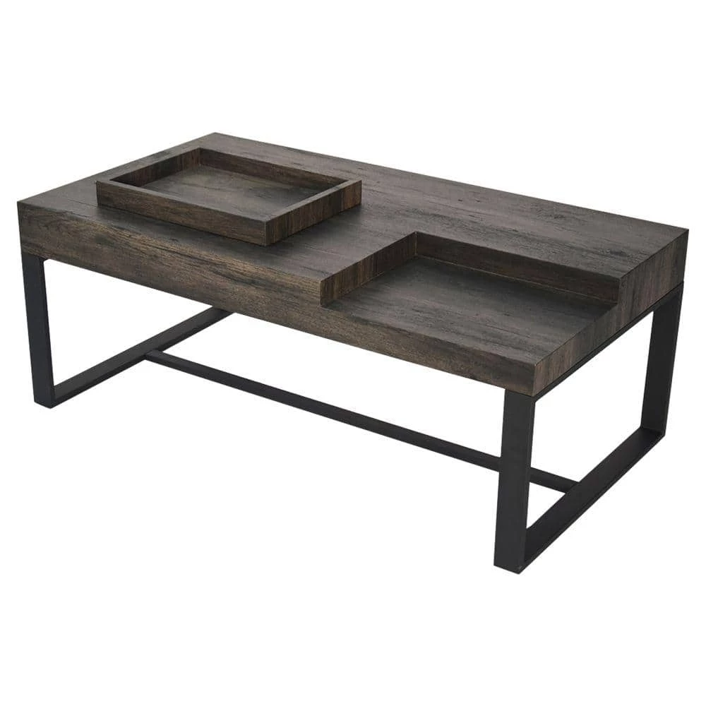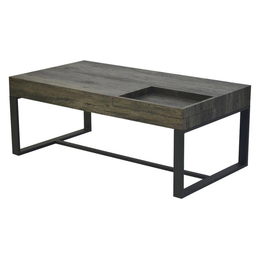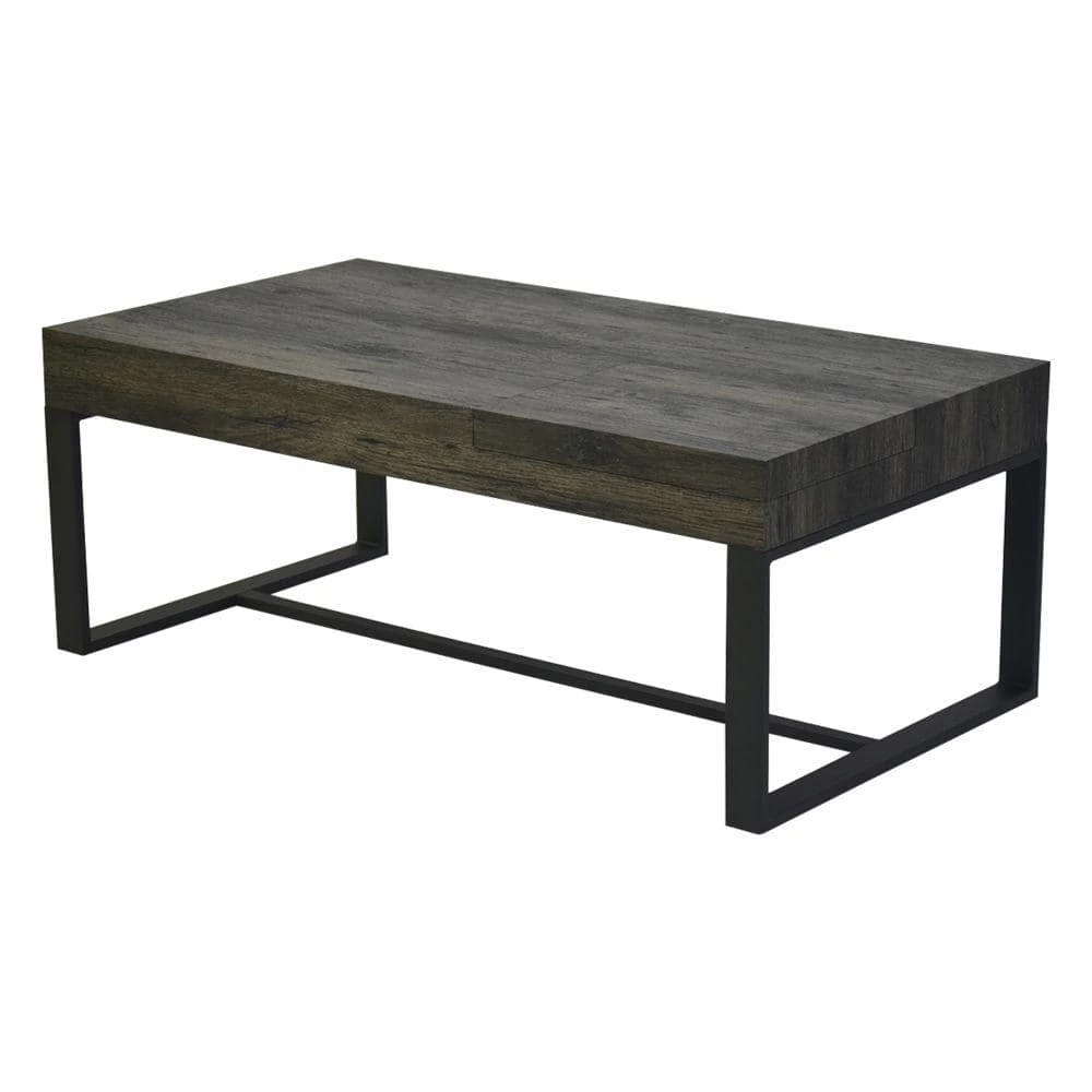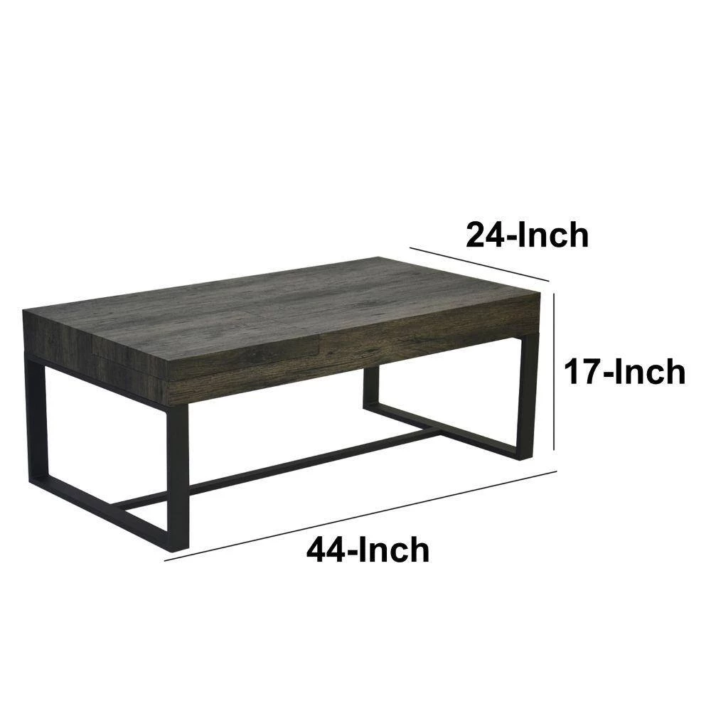 Inspired by the trending transitional style that never goes out of fashion, this striking Wooden Coffee Table comes with a hidden storage facility to keep your essentials organized. Featuring a wide rectangular tabletop to render services hassle free and conveniently, the aesthetically pleasing grain details add a p in. of nature inspired charm to it. Constructed sturdily from the combination of quality MDF and metal frame for prolonged durability, the gray coated wooden top compliments the striking black accented base. Depicting a blend of sled and trestle style base for utmost stability, this Coffee Table makes a perfect center table to your interior.