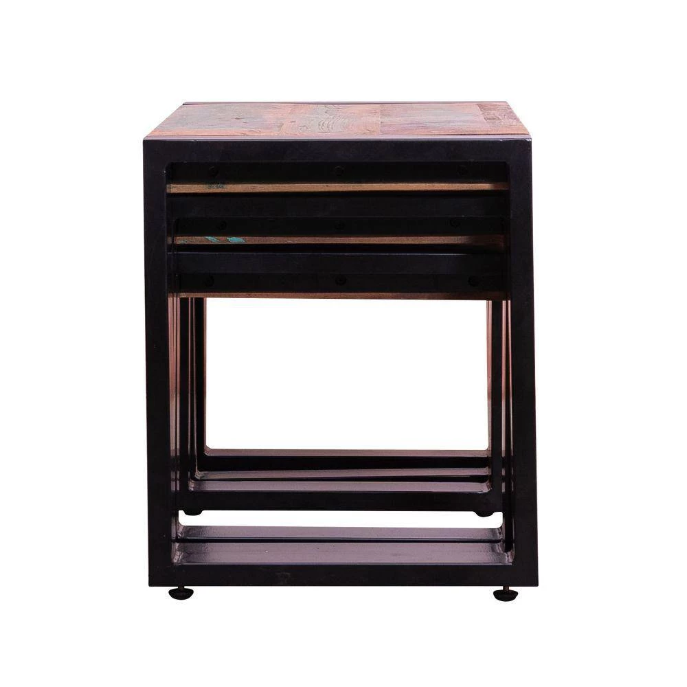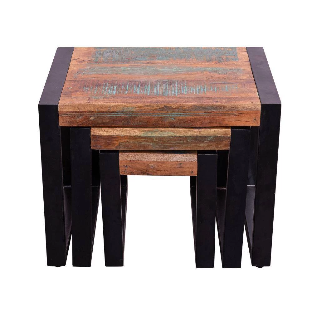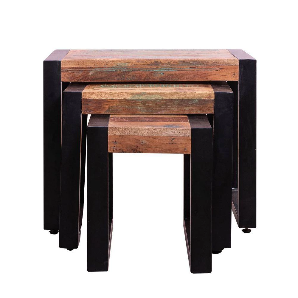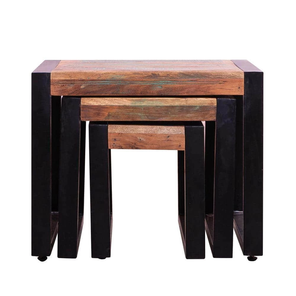 An epitome of quality craftsmanship, this 3 piece Nesting Table Set can set a redefined charm to the aesthetics of any kind of interior. Incorporated with a rectangular tabletop and aesthetically visible grain details, it is supported sturdily on a sled base. Constructed sturdily from the combination of wood and metal for prolonged durability, it is accented in a dual tone finish in the hue of brown and black. The nesting design proves to be a real space saver. Though inspired by industrial style, the clean lined design allows the set to readily blend with a variety of decor settings. Designed for multi purpose applications, the Table set will be a perfect addition to your place. Due to the handcrafted nature of the product, there may be variation in color, finish, wood grain and knots.