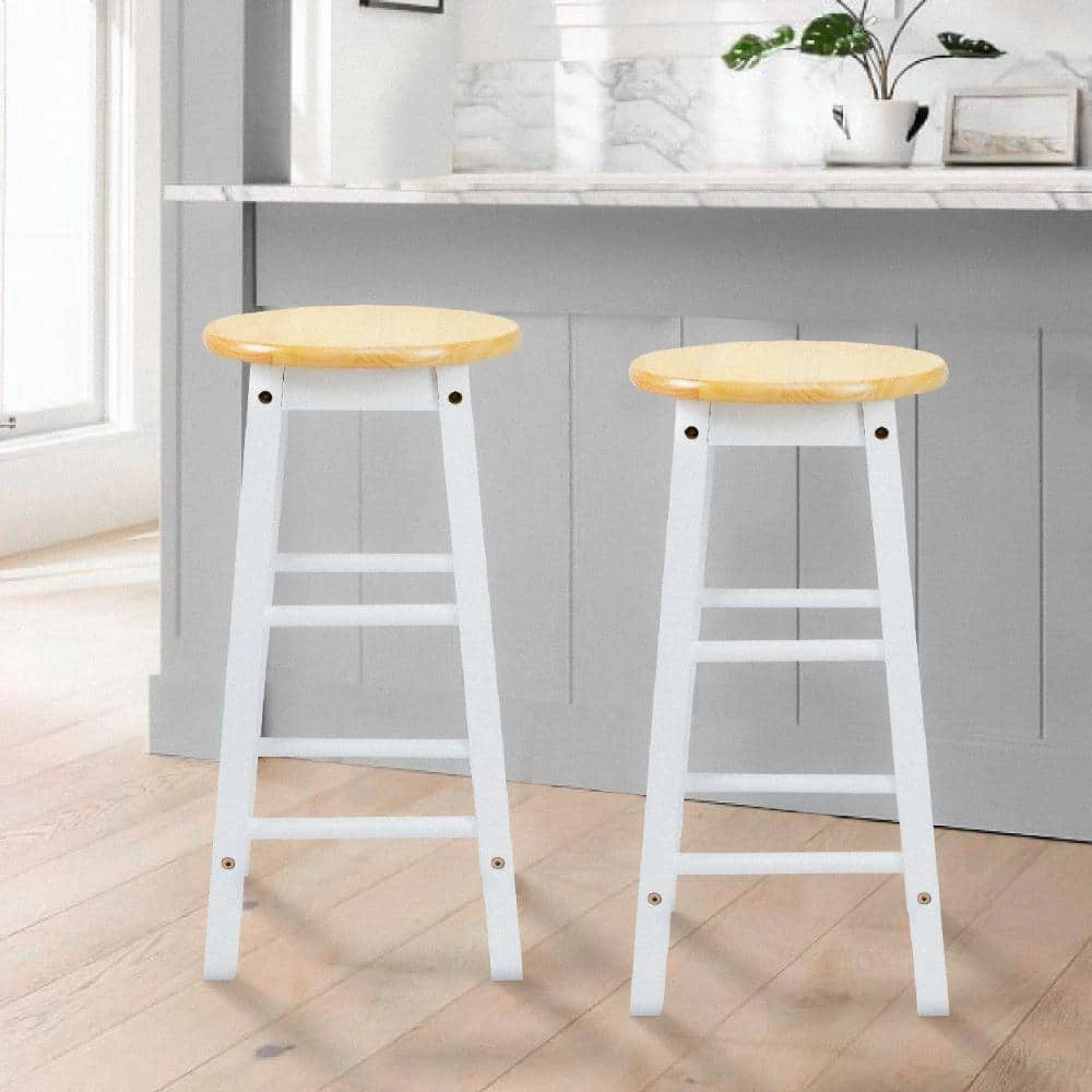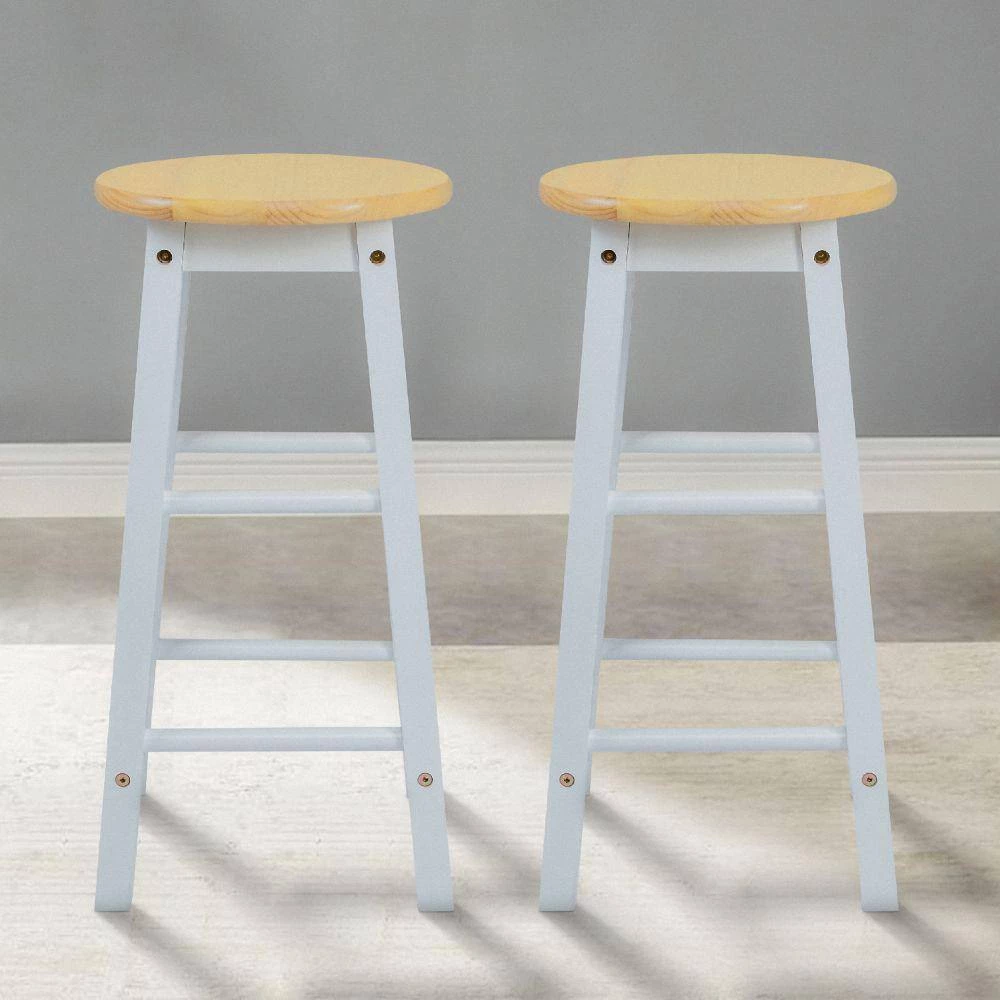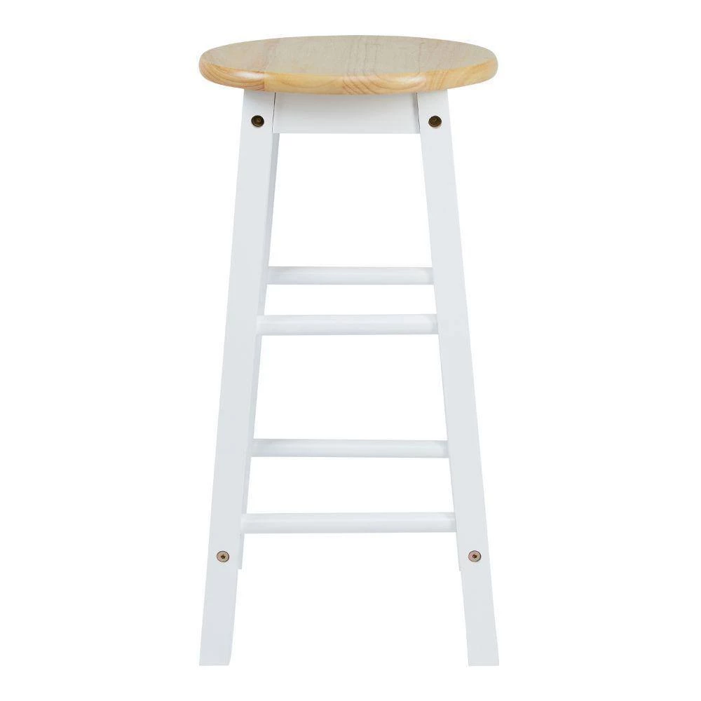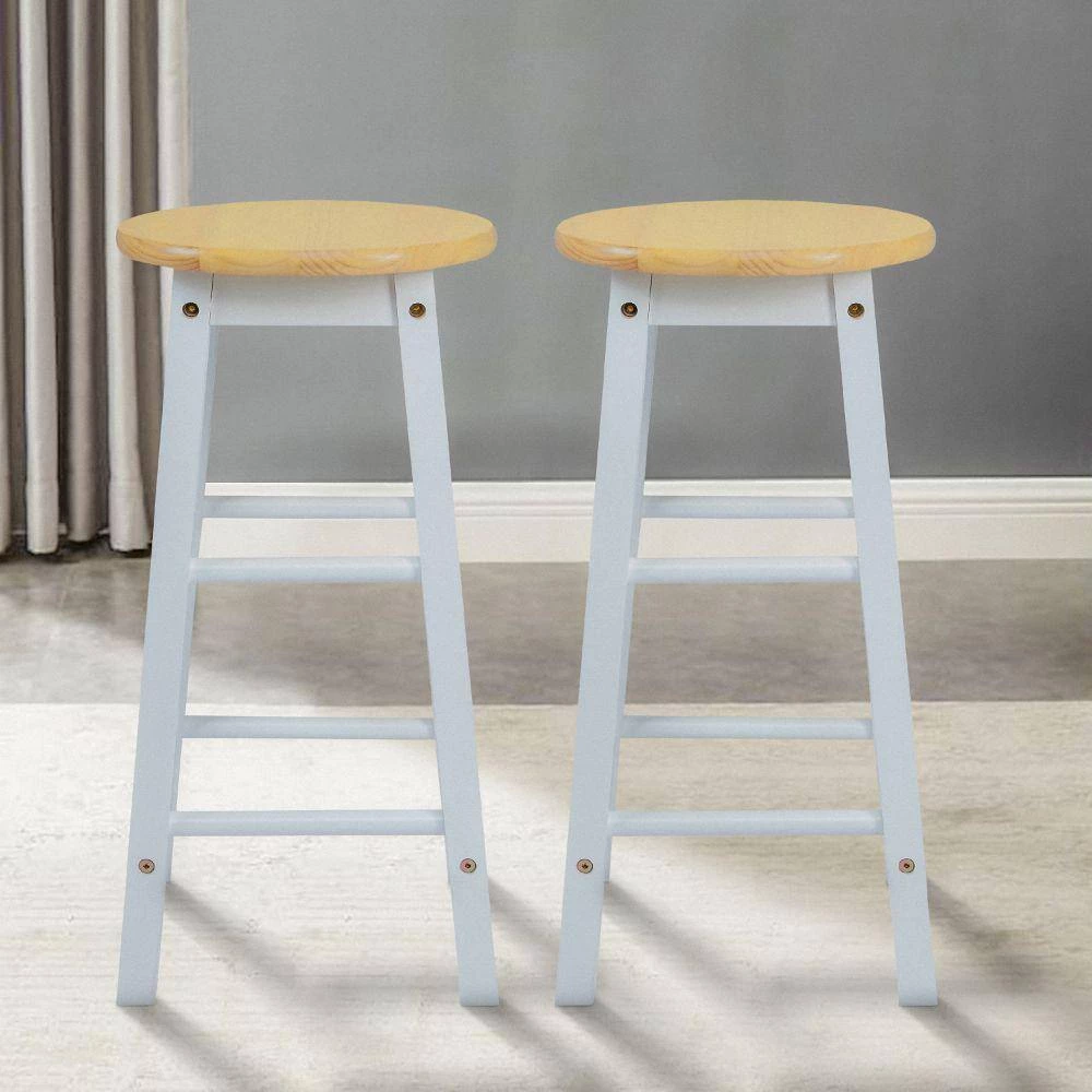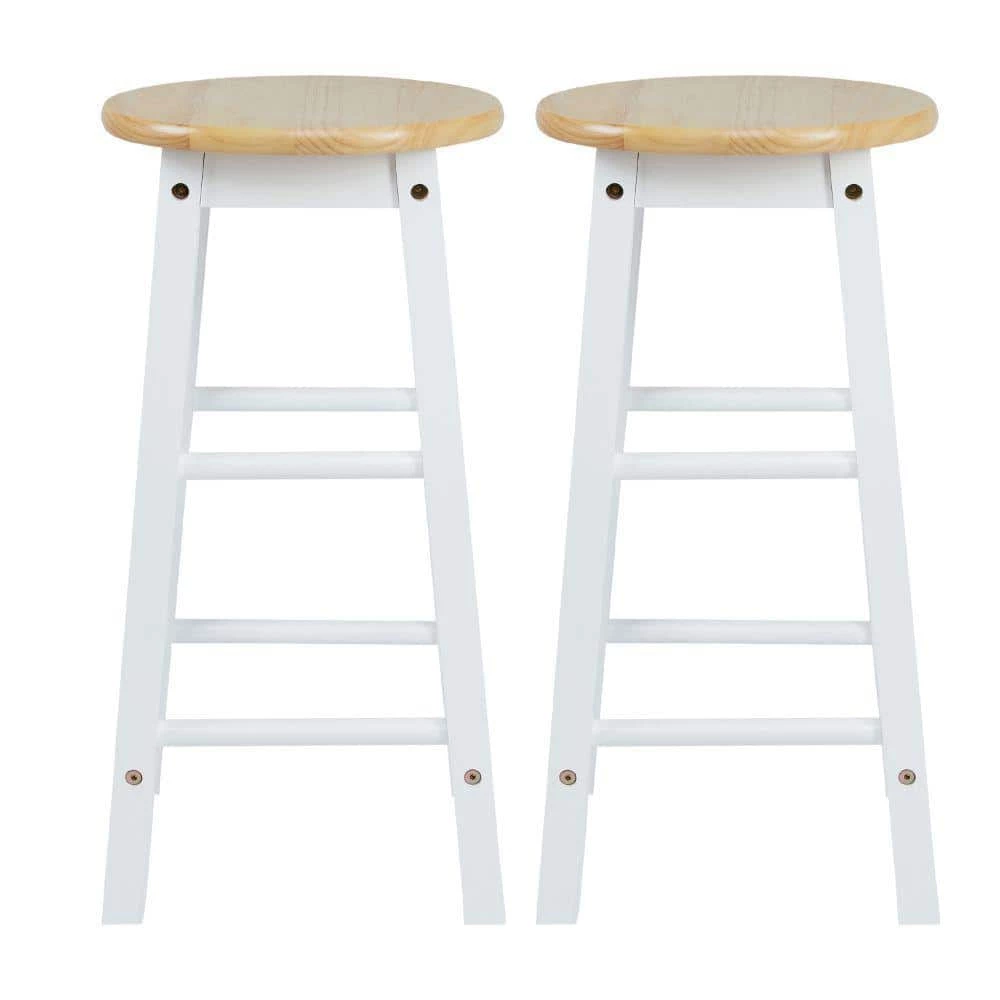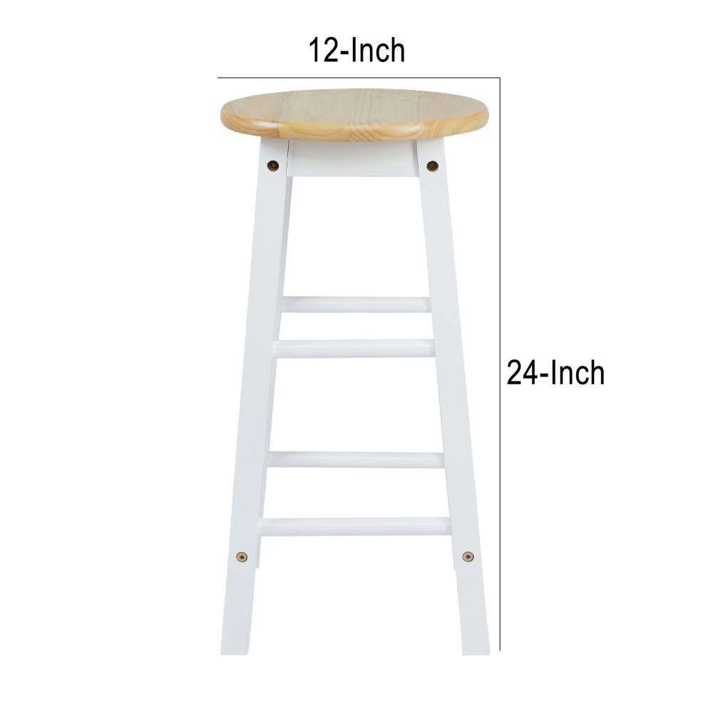 Revamp the aesthetics of your interior with the introduction of this exquisitely designed wooden counter height stool, available as a (set of 2). Featuring round seats, it is supported sturdily on angled legs for the utmost stability. The brown accented seats complement the white-coated frames, emanating a striking flair that captivates any onlooker. Handcrafted from rubber wood frames for lasting durability, this set makes a perfect addition to the counter dining space. Inspired by the coastal-themed style, this counter-height stool set readily assimilates with a multitude of decor settings without compromising the integrity of the interior.