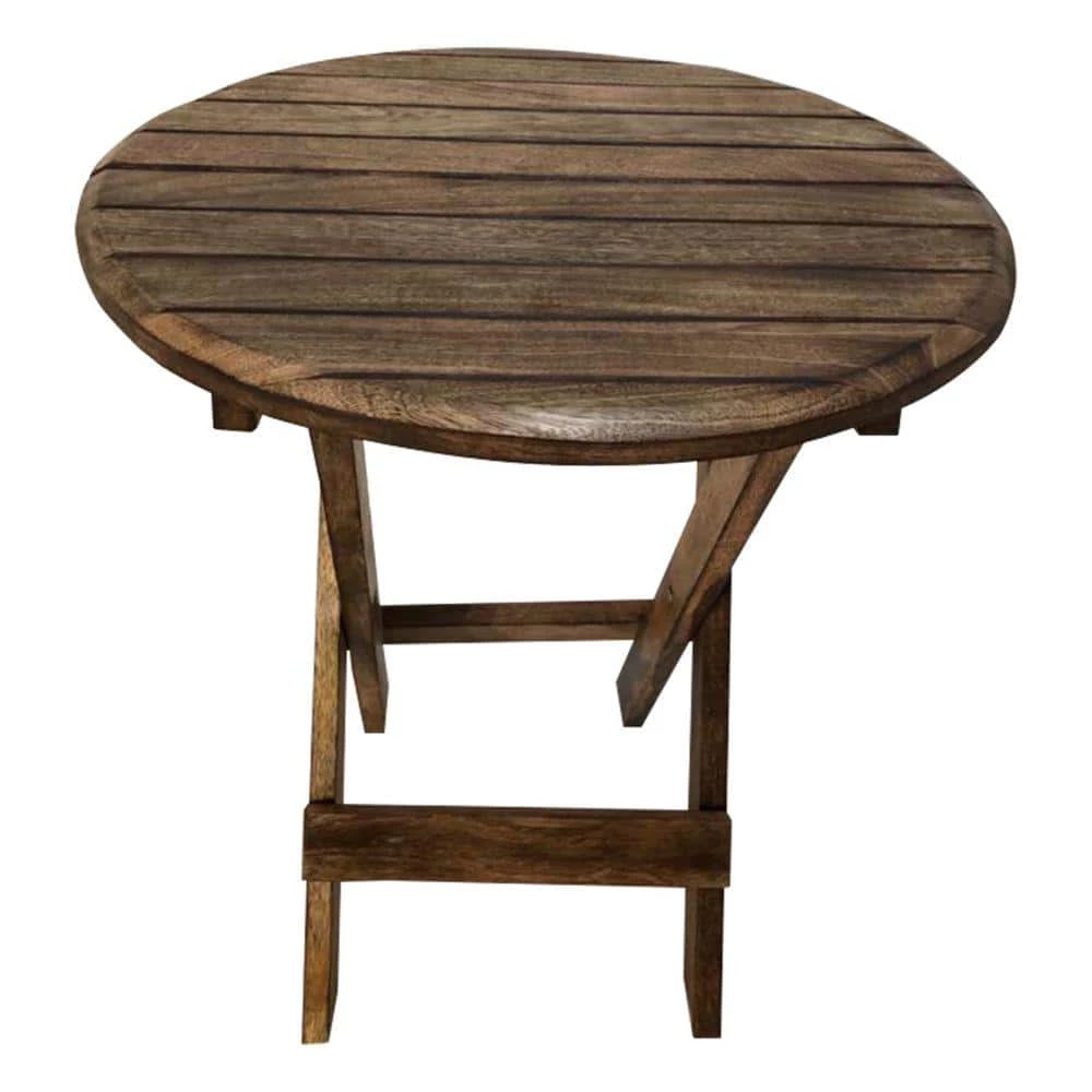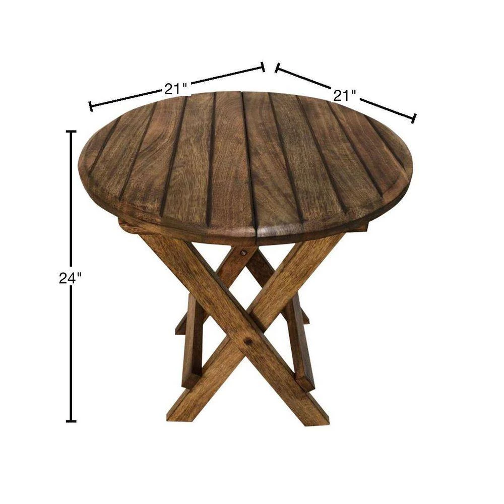 Inspired from farmhouse style this Round Folding Table comes with plank style top in a striking rustic brown color finish. Constructed from mango wood frame for prolonged durability, it can be used as an end table or chair side table. The folding mechanism proves to be a real space saver in order to keep your place organized. This product needs to be kept safely as it is not dust, water or UV rays resistant.