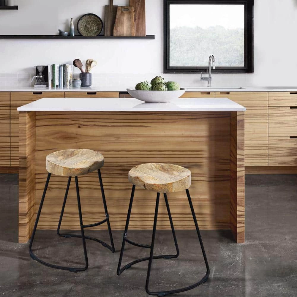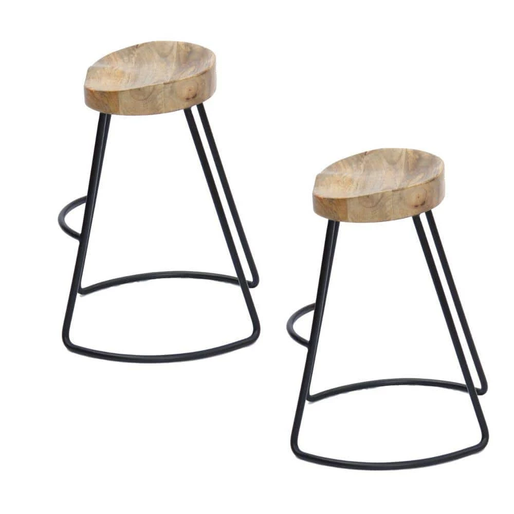 A unique blend of contemporary elegance and industrial style, this two piece counter height stool set from our best selling Ela collection makes a perfect fit for your counter height dining table or kitchen countertop. Each stool offers a curved saddle style seat with wood grain details for a nature inspired charm. Handcrafted from a water resistant mango wood seat and lightweight yet sturdy iron frame, the natural brown accented wood complements the black powder coated frame. Each stool is bolstered with rail that doubles as a footrest for additional comfort. A perfect addition to your modern, rustic, transitional, farmhouse or Scandinavian style interior.