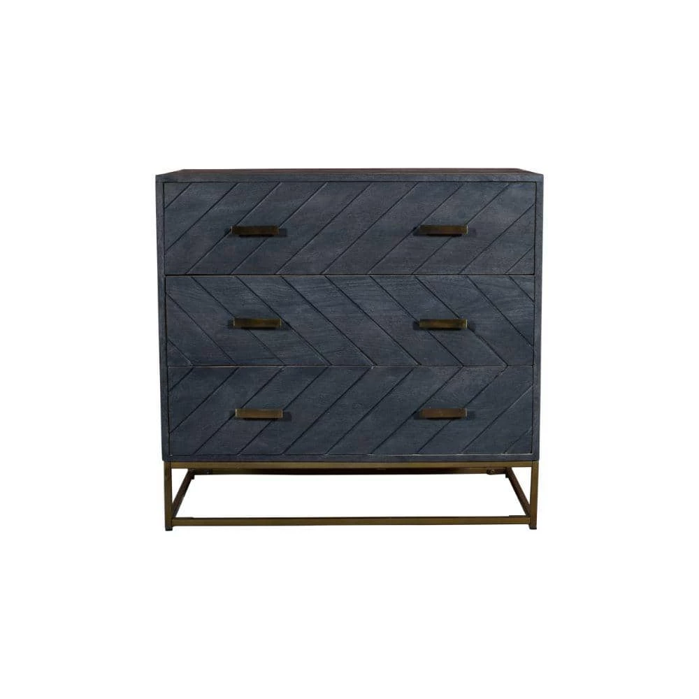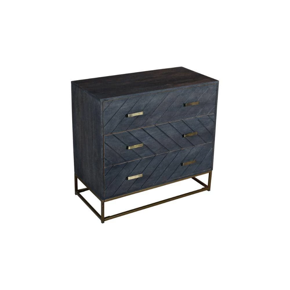 A perfect blend of cottage and transitional style, this storage dresser chest is handcrafted sturdily from a beautiful blend of warm gray finished mango wood and a rustic bronze metal frame base for lasting durability. The three easy gliding drawers offer a sophisticated space to keep your clothes, linens, and valuables organized, and the spacious surface can be used to for your cherished photos, lighting, or other decorations. The clean lined design allows this piece of furniture to readily blend with a variety of decor settings. Check out our Roy collection for matching pieces.