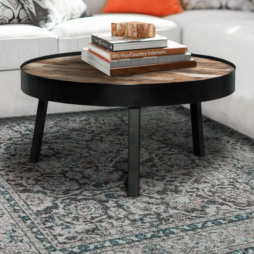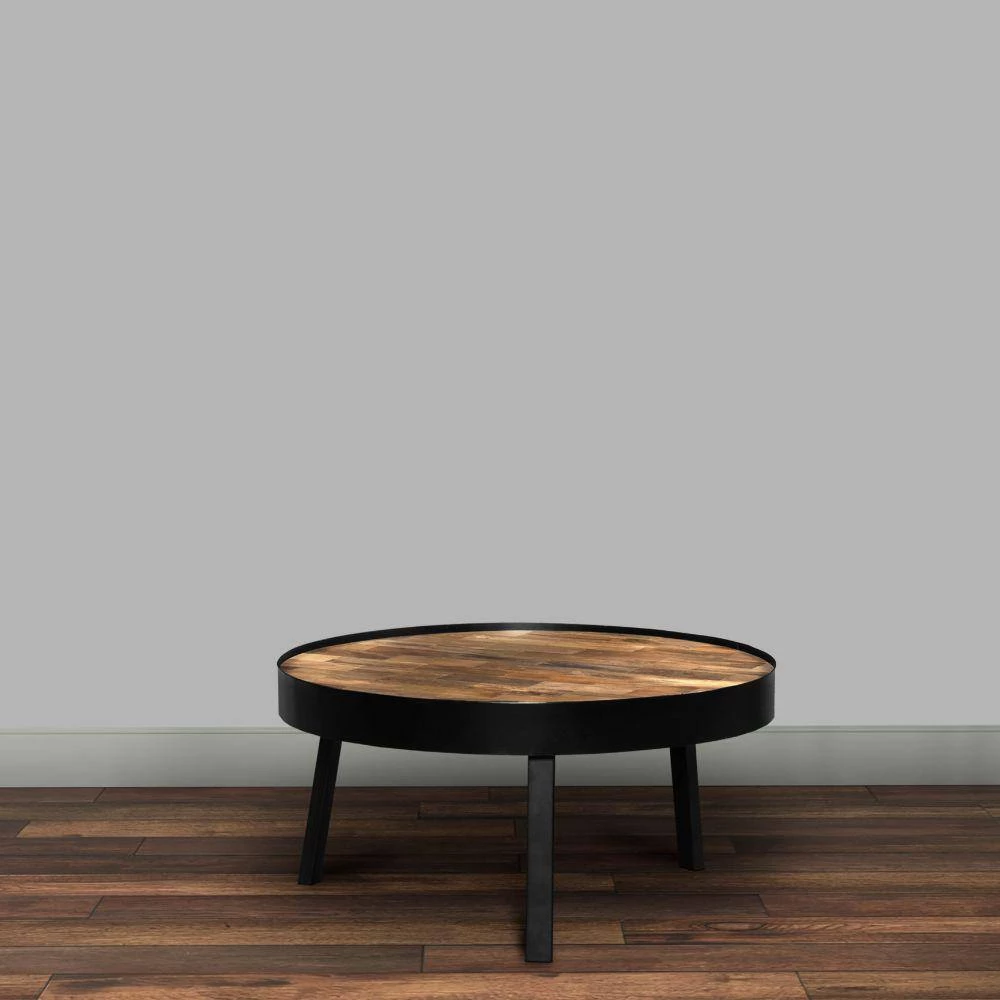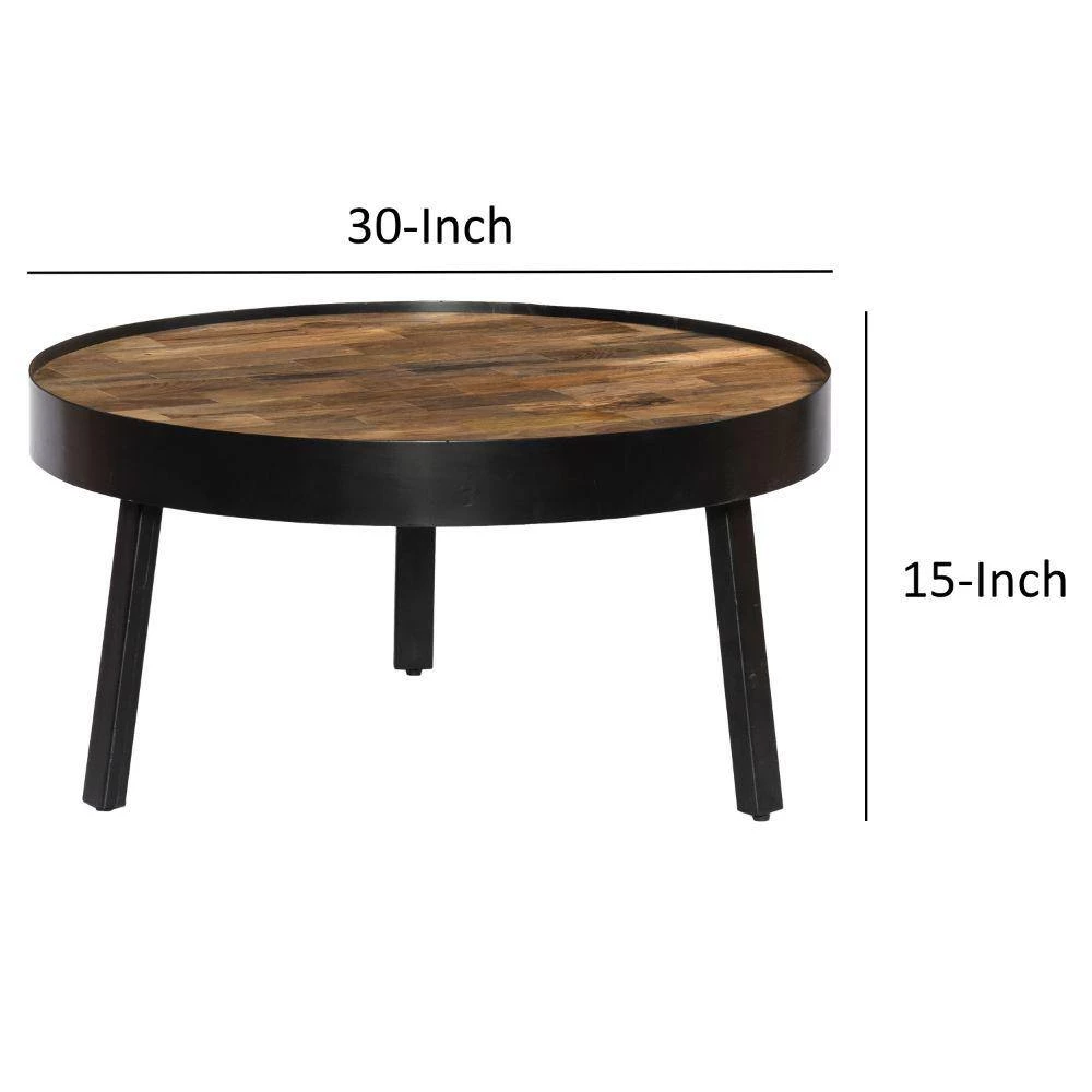 Simply amazing, this Coffee Table is sure to add a remarkable charm to the aesthetics of your living space. The wide round top exhibits replicated wood grain design for a captivating charm. Constructed sturdily from the combination of mango wood and Indian rosewood for a lasting durability, the banded metal frame conjoins the tripod base for utmost stability. The very attention to details on a minuscule level makes the onlooker awestruck. The dual tone finish in the hues of oak brown and striking black emanates an alluring appeal from it. A perfect center table for your interior, this sophisticated and stylish Coffee Table is itself an accent furniture. Enjoy your scrumptious snacks and beverages on this exquisitely crafted Coffee Table.