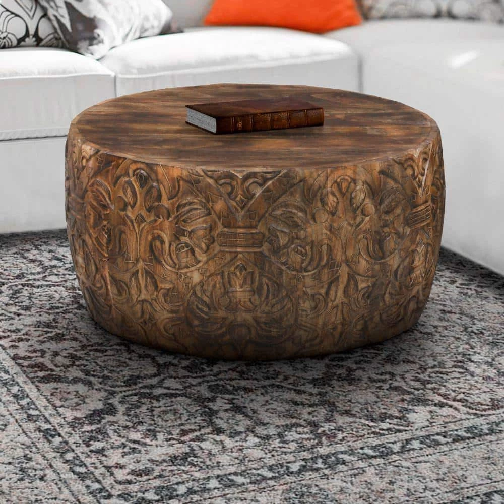 Traditional in style, this Wooden Coffee Table is the epitome of exquisite craftsmanship. Depicting elegant damask carving over the drum shape structure provides an aesthetic appeal to it. Featuring natural grain on a wide round tabletop add a nature inspired appeal to it. Sturdy construction from solid Mango wood for lasting durability, the walnut brown finish compliments its overall look.