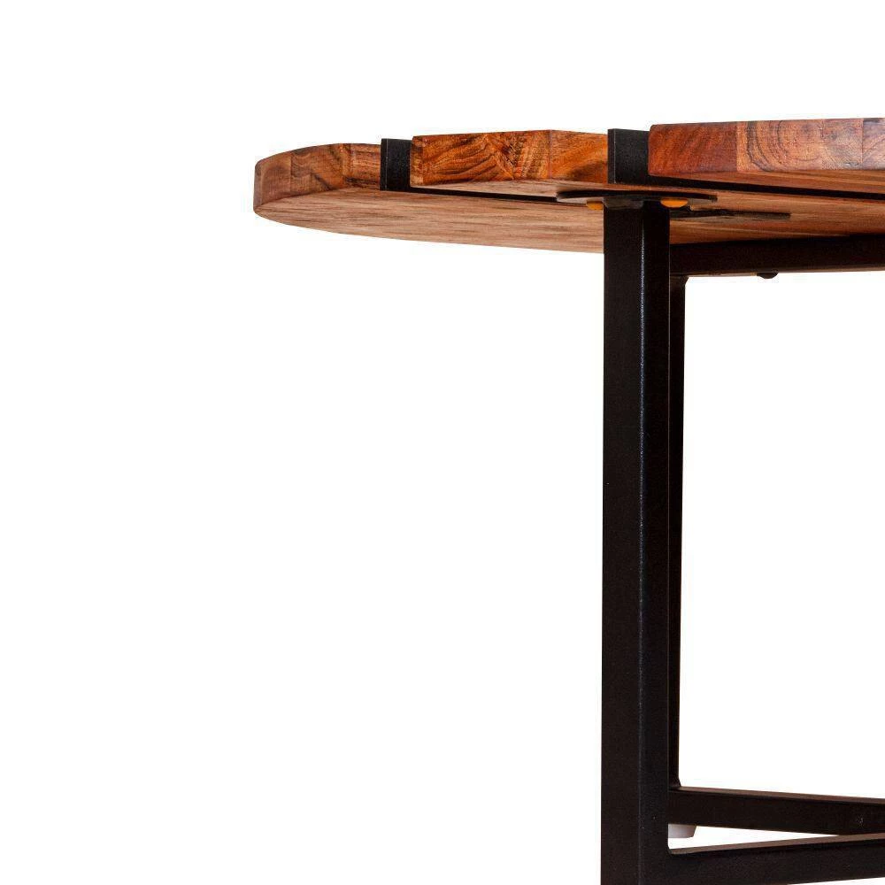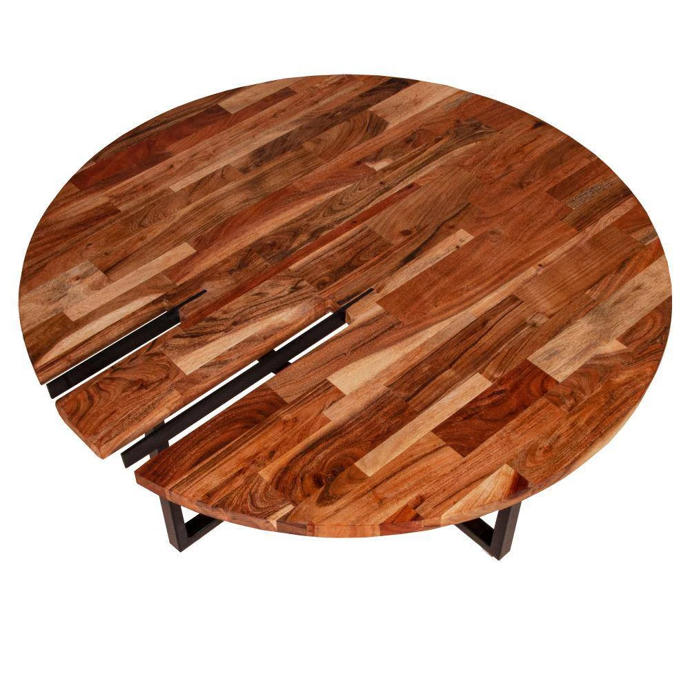 Fine craftsmanship meets contemporary industrial style with this expertly crafted coffee table from our best selling Peter collection. Featuring a round tabletop and subtle wood grain details for a natural flair, it is supported on sturdy and easy to knock down legs with a uniquely designed X shape base. The inlaid butcher block design imparts a unique character to the table. Fully handcrafted from water resistant acacia wood and a sturdy steel frame for lasting durability, the warm brown tabletop harmonizes with the black powder coated frame confidently. The built in metal flats make perfect racks for magazines or light books, offering a spacious tabletop for breakfast and lunch, coffee breaks, and reading or working on your laptop or tablet.