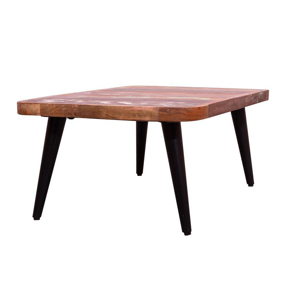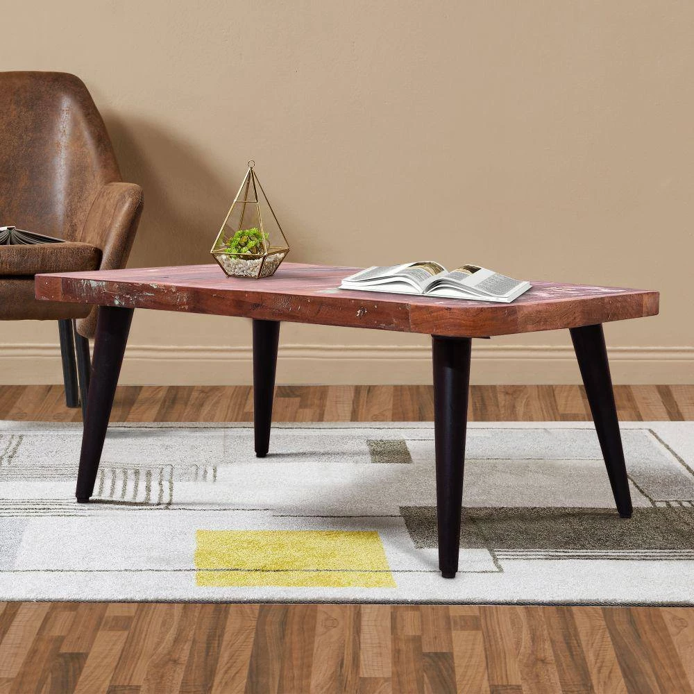 Add a splash of color to the aesthetics of your interior with the introduction of this contemporary style inspired Coffee Table. Incorporated with a rectangular tabletop and aesthetically visible grain details, it is supported sturdily on angled legs. Constructed sturdily from the combination of wood and metal for prolonged durability, the brown accented tabletop is complemented with a hint of teal green embellishment. The striking black tone finish legs grant an essence of sophistication to the overall design of the Coffee Table. The curved edges and the clean lined design allow it to intermingle with a variety of decor settings. Due to the handcrafted nature of the product, there may be variation in color, finish, wood grain and knots.