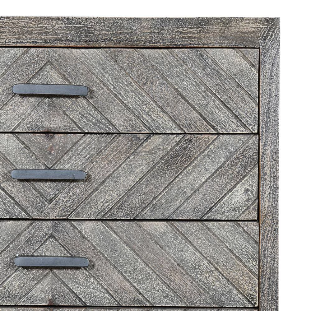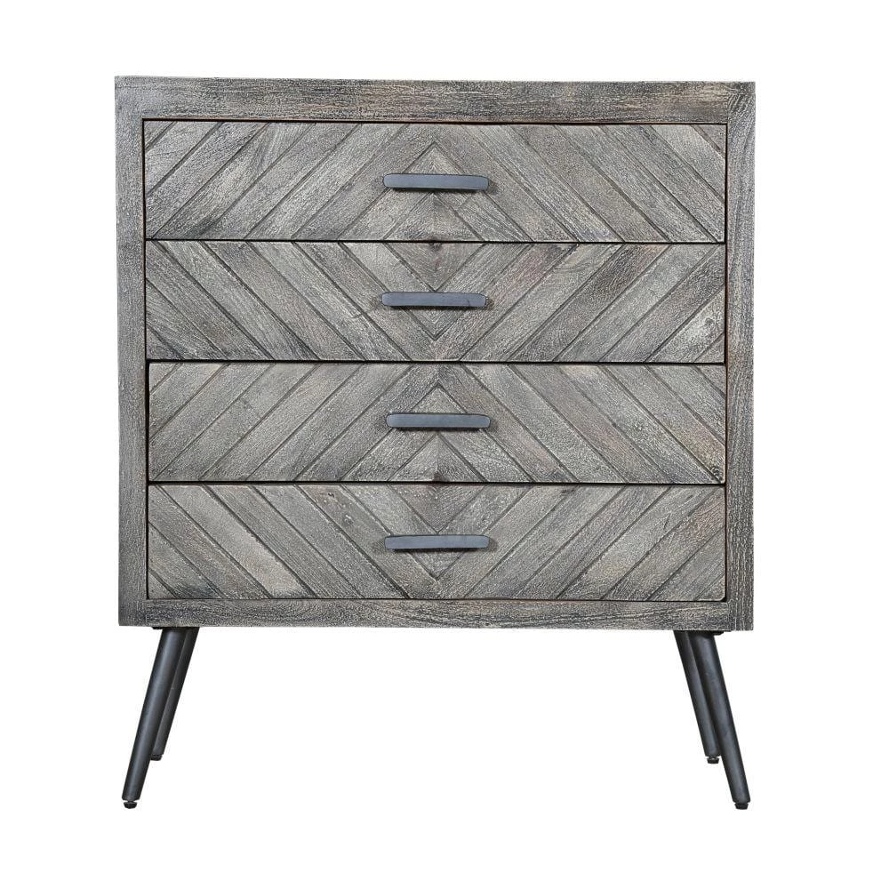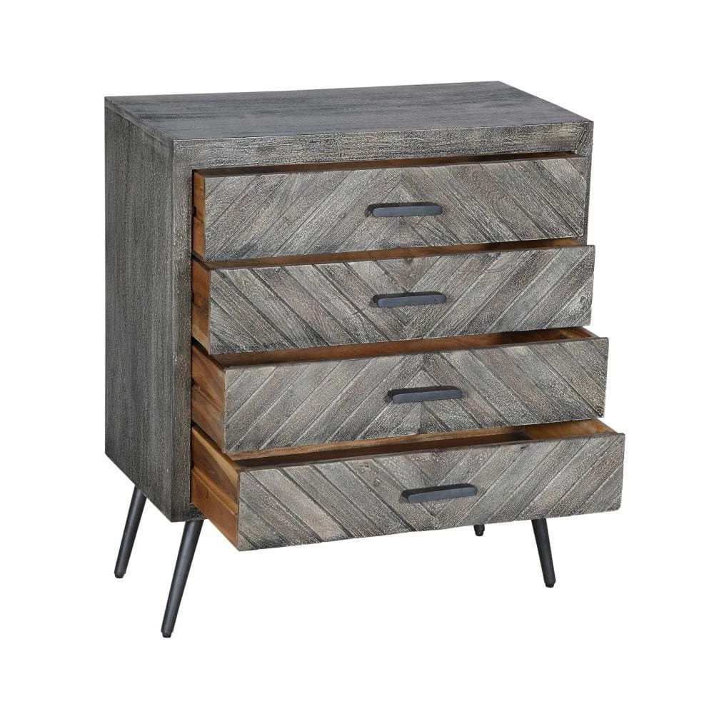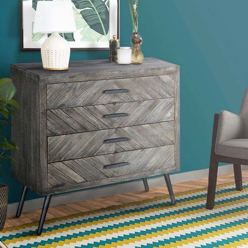 Quality craftsmanship blends with modern design to form this gorgeous transitional accent dresser. Featuring an elegantly carved chevron pattern on the front panel, it comes with four smooth gliding drawers for easy access to your personal storage. Made from a combination of mango wood and composite wood, the frame is supported on knock down tapered iron legs. Accented with an elegant gray color coating, the aesthetically visible grain details impart an enchanting vibe to the piece.