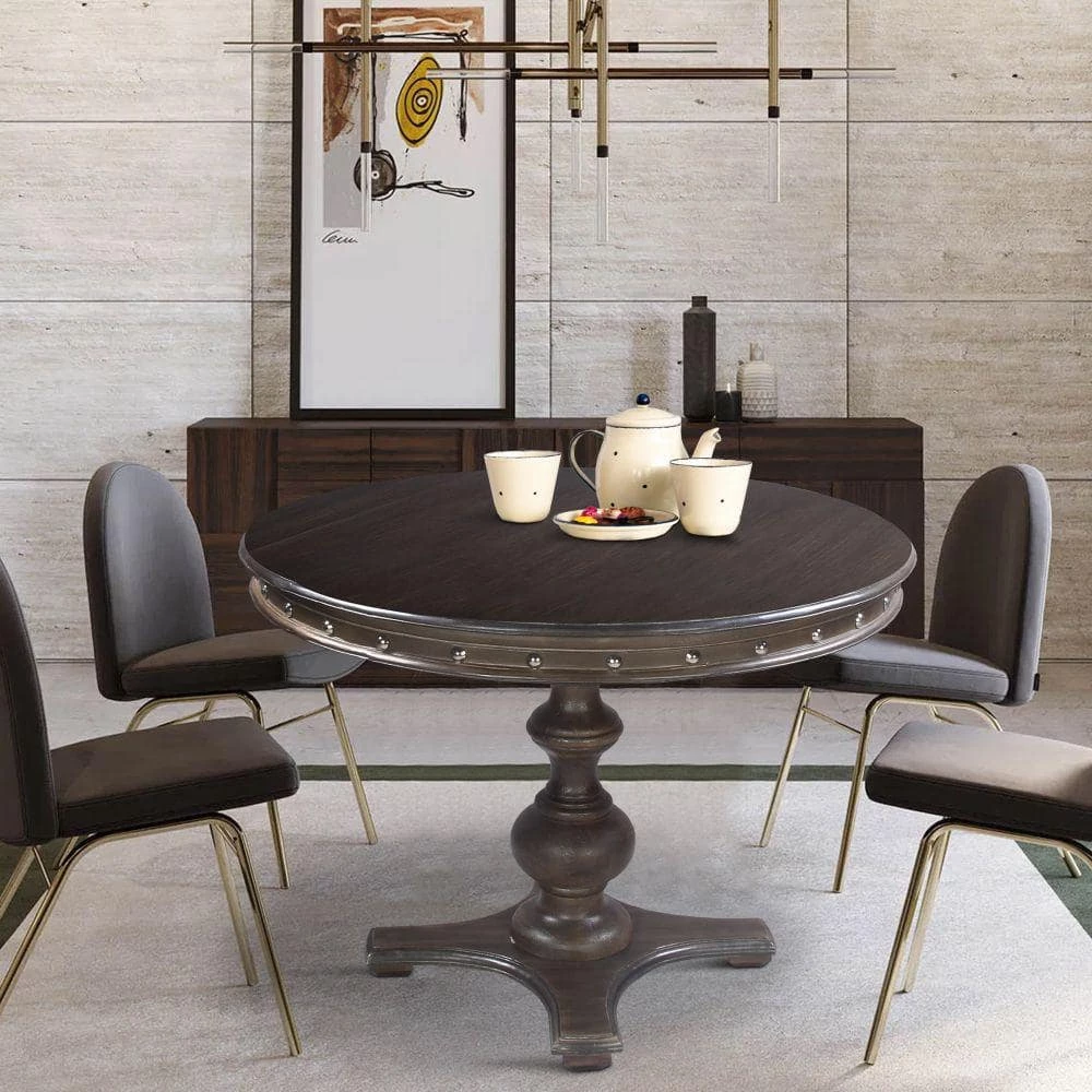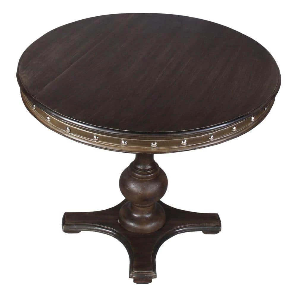 Expertly crafted with vintage inspiration, this heirloom style dining table is the epitome of quality craftsmanship, regal charm, and traditional, classic elegance. Featuring a clean lined round silhouette with subtle wood grain details, the chrome polished rivet accents along the molded edges impart a unique character to the piece. Handcrafted from a water resistant mango wood frame in dark brown finish, the turned pedestal base with four points enhances the stability and durability of this gorgeous centerpiece. A perfect fit for your dining space, this table harmonizes with a wide variety of decor styles.