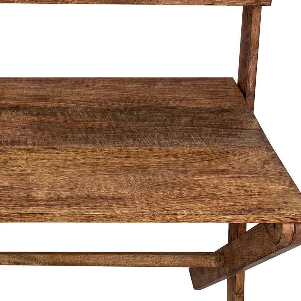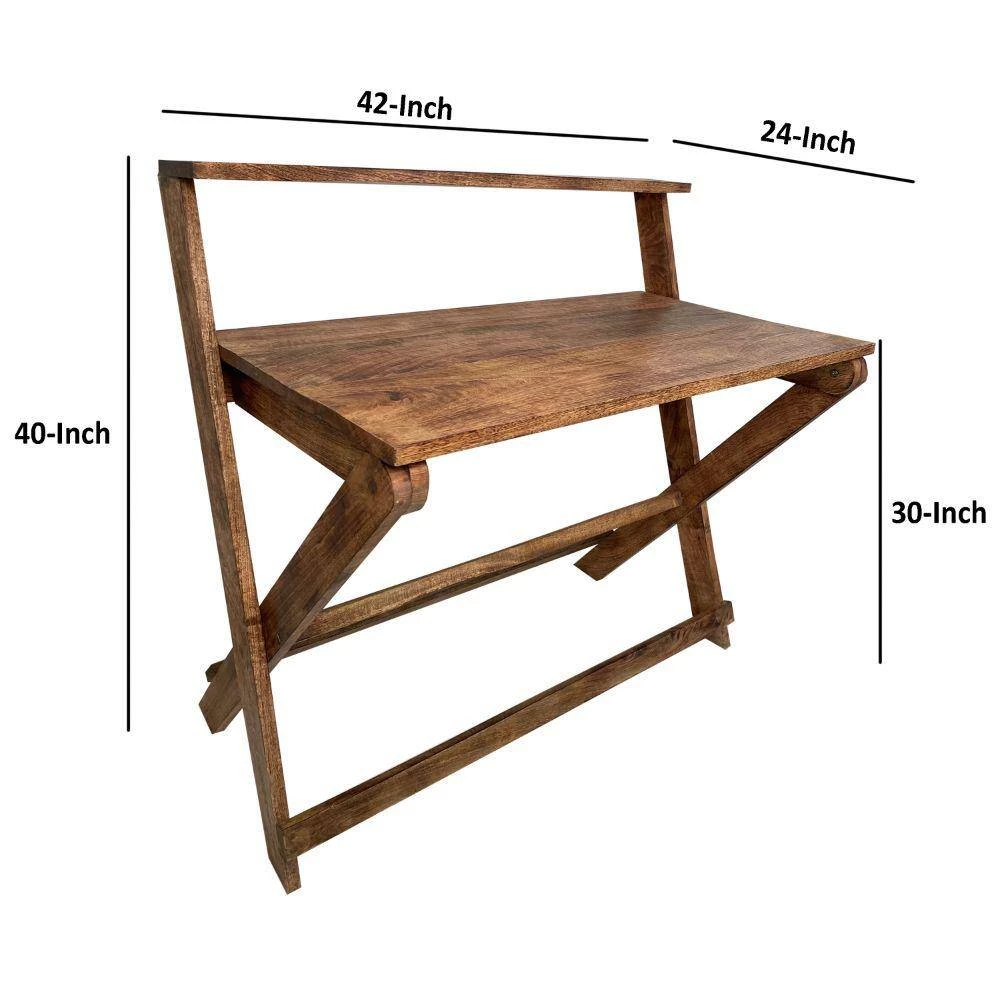 Convenient, portable, and highly functional, this foldable home office desk is sure to make a perfect fit for your home, office, or study space. Handcrafted from durable mango wood frame, the light oak brown finish and the subtle wood grain details impart a nature inspired appeal to it. The piece is incredibly balanced, supported on an X shaped frame with a folding mechanism that proves to be a fantastic space saver as needed. The top shelf can be used to keep books, lamps, and more. With a spacious rectangular workspace, the open style frame offers adequate leg room to stretch and relax during or after long working hours.