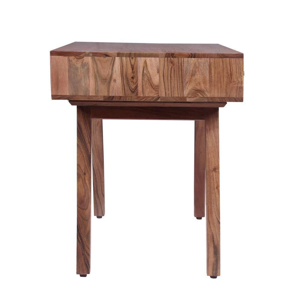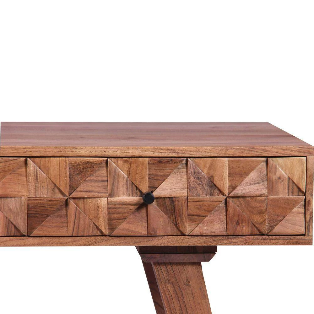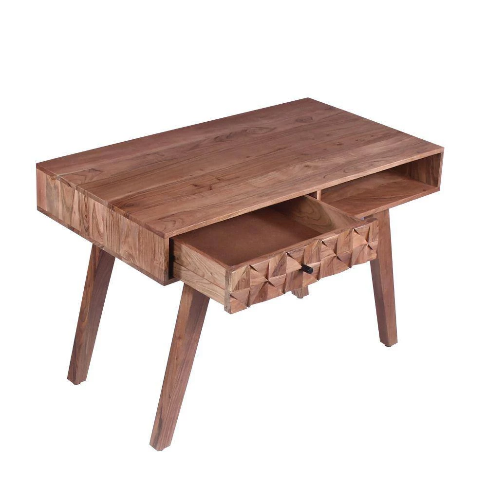 With its peg legs and linear profile, the Reed writing Desk is a mastery in mid-century minimalism. With the 3 Dimensional cutout design on the drawer, this look may be a high-end gallery design, but the price is beautifully down to earth. Bring a brand new aesthetic to your study space or home office with this handmade writing desk. Perfect for keeping distractions away, and beautifully matching with other decor in nearly any neutral wood tone, this piece features a smooth gliding drawer and an open cubby to keep your stationery or paperwork organized. Built from a solid acacia wood frame for lasting durability, the oak brown finish complements its appeal perfectly, while carved 3D texture work detailing on the drawer front brings a unique, artisinal style to the piece. Supported on modern angled legs and equipped with floor protectors to prevent any abrasion, this piece fits in with a variety of other decor settings.