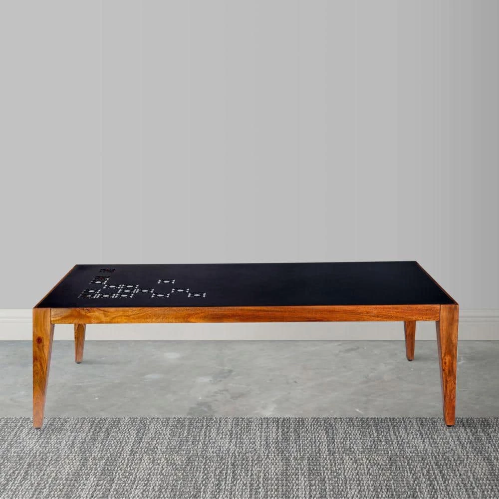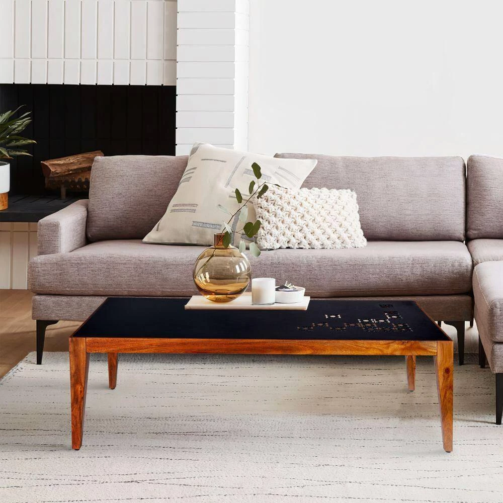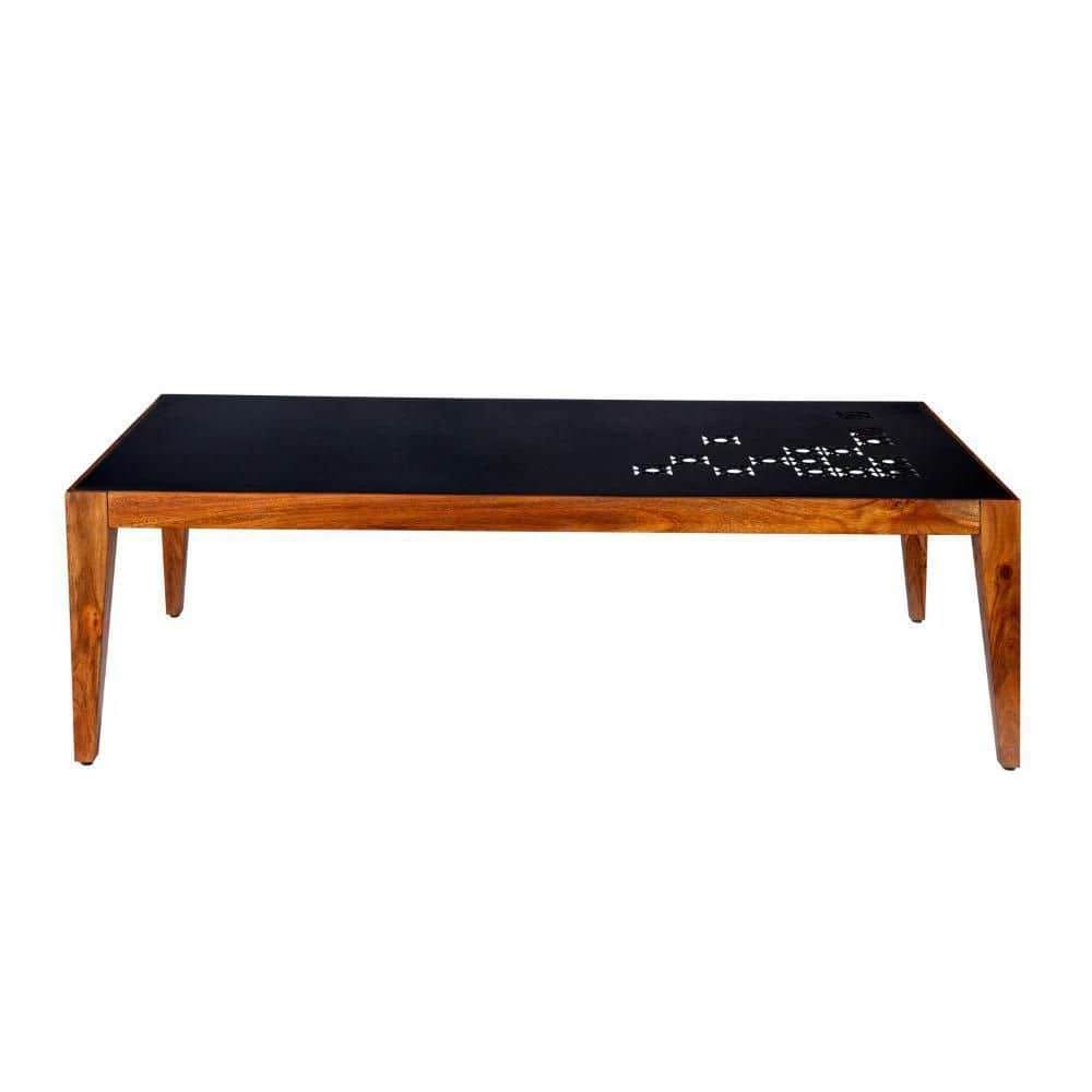 Contemporary design meets quality craftsmanship with this striking handcrafted metal coffee table from the Alba collection. The black powder coated metal top depicts a unique laser cut Celtic star design. Supported on knock down acacia wood legs with floor protectors to prevent abrasion, this piece is the perfect addition to your living room, den, or lounge area.