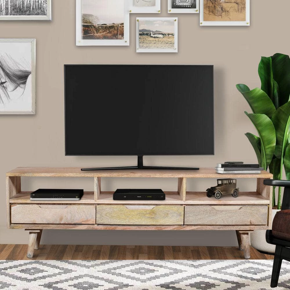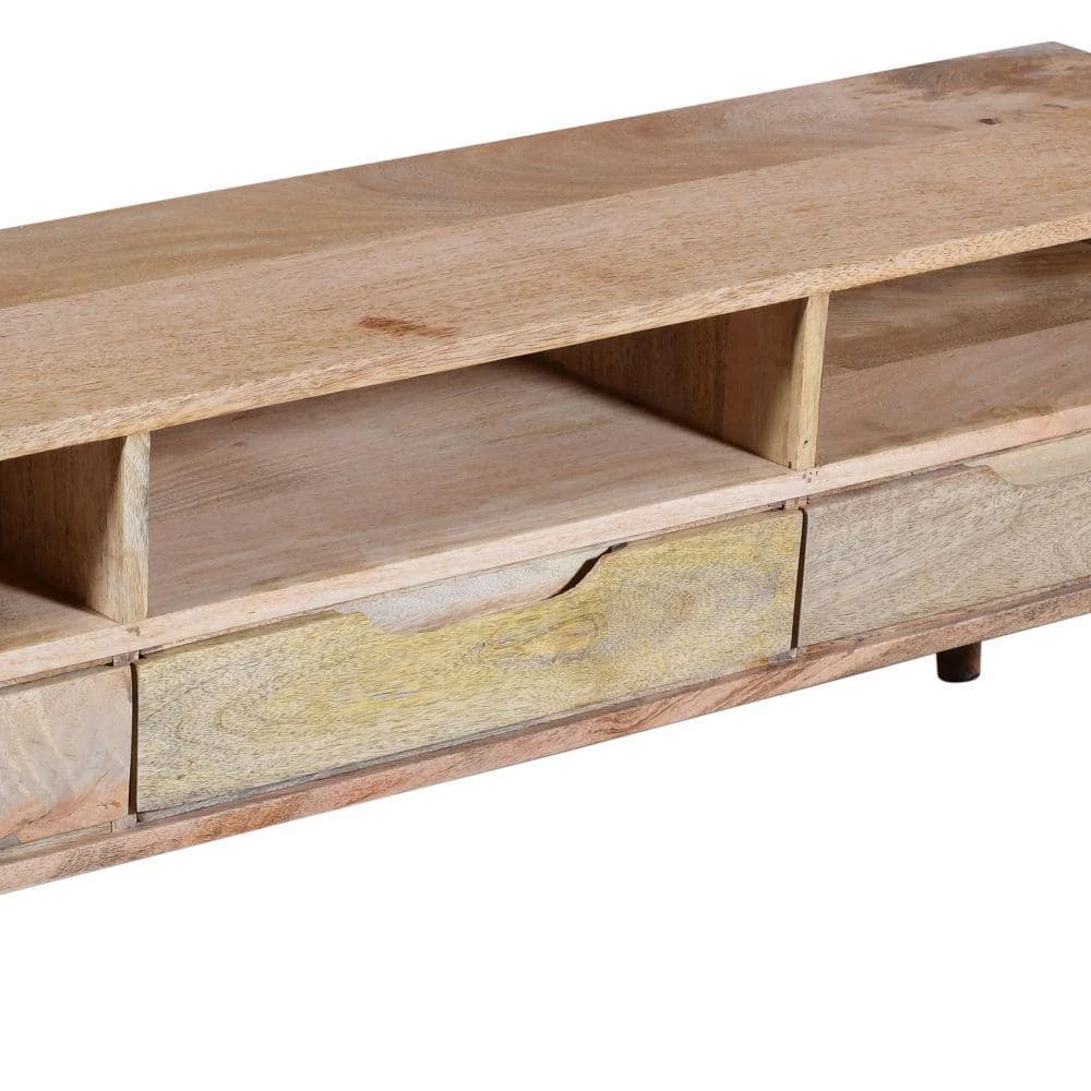Give a classic makeover to your living room, bedroom, or lounge with this farmhouse style inspired TV media entertainment center console. The three smooth gliding drawers and three open compartments help keep your space well organized, while an exquisitely handcrafted mango wood frame adds to the structural durability and stability of the piece. The soft oak brown finish and aesthetic wood grain details complement the overall rustic appeal of the piece. The surface comes with a raised tray edges, making it ideal for the bedroom, living room or den. Check out our Cyril collection for matching items.