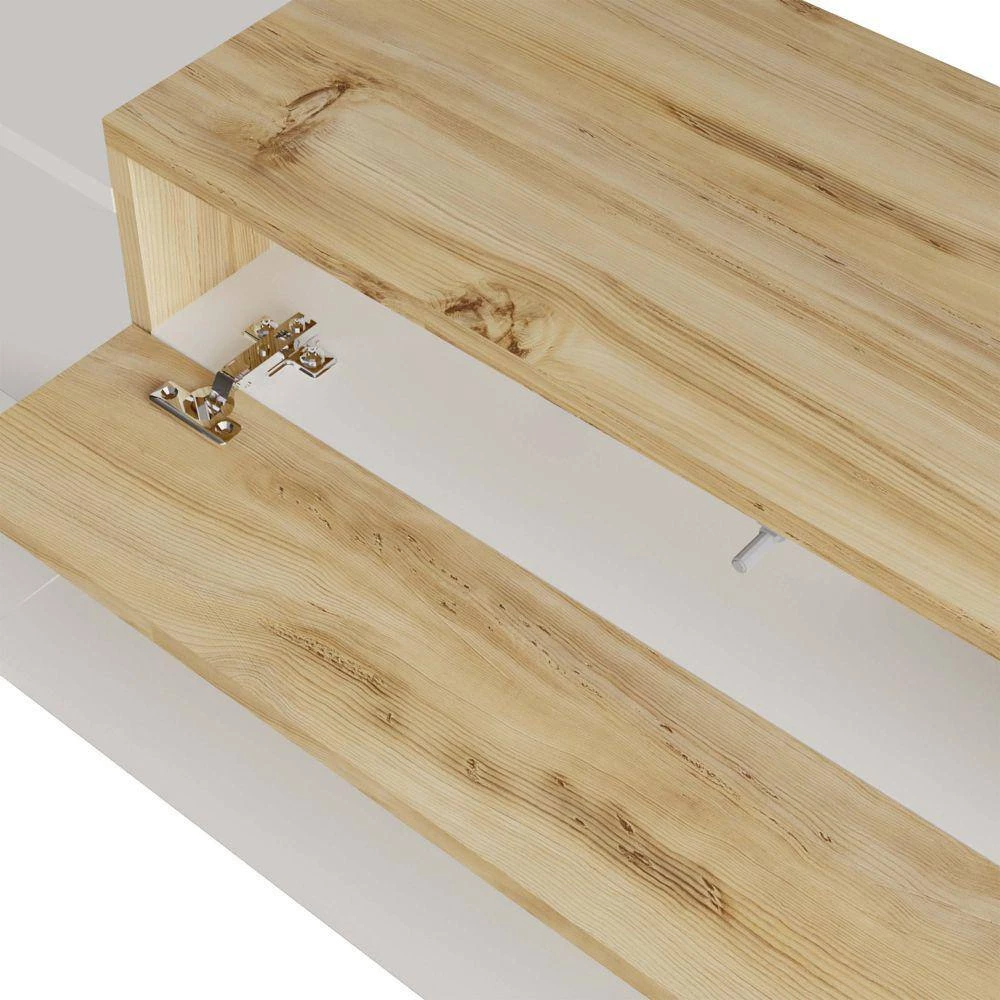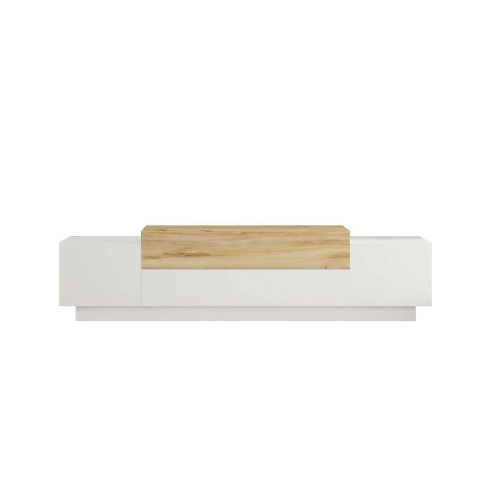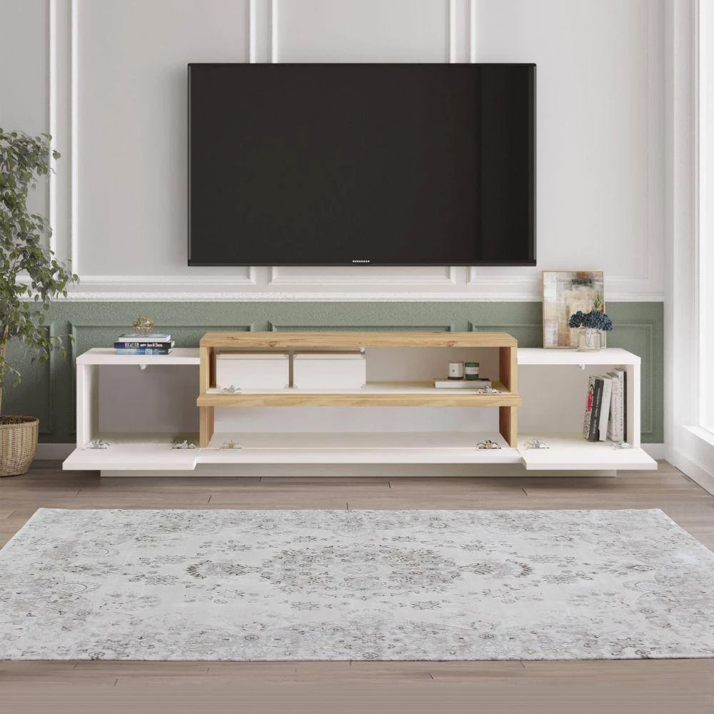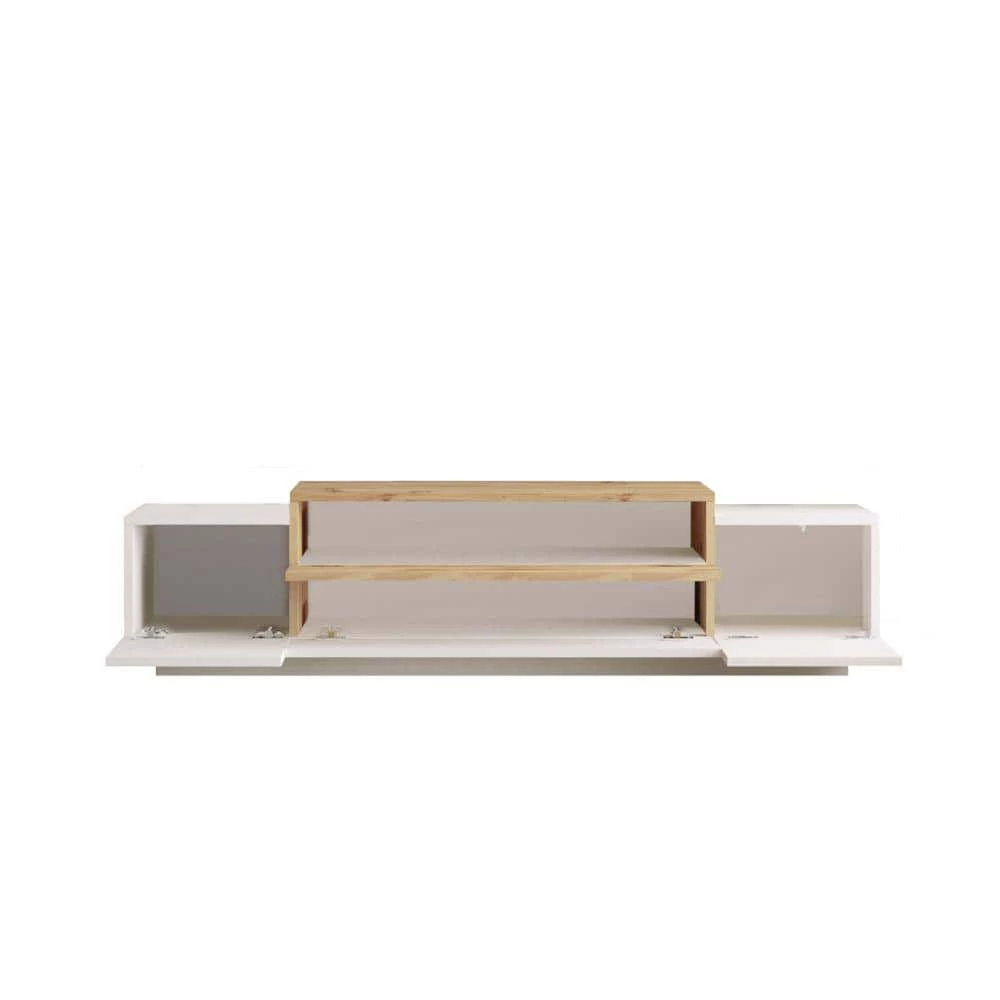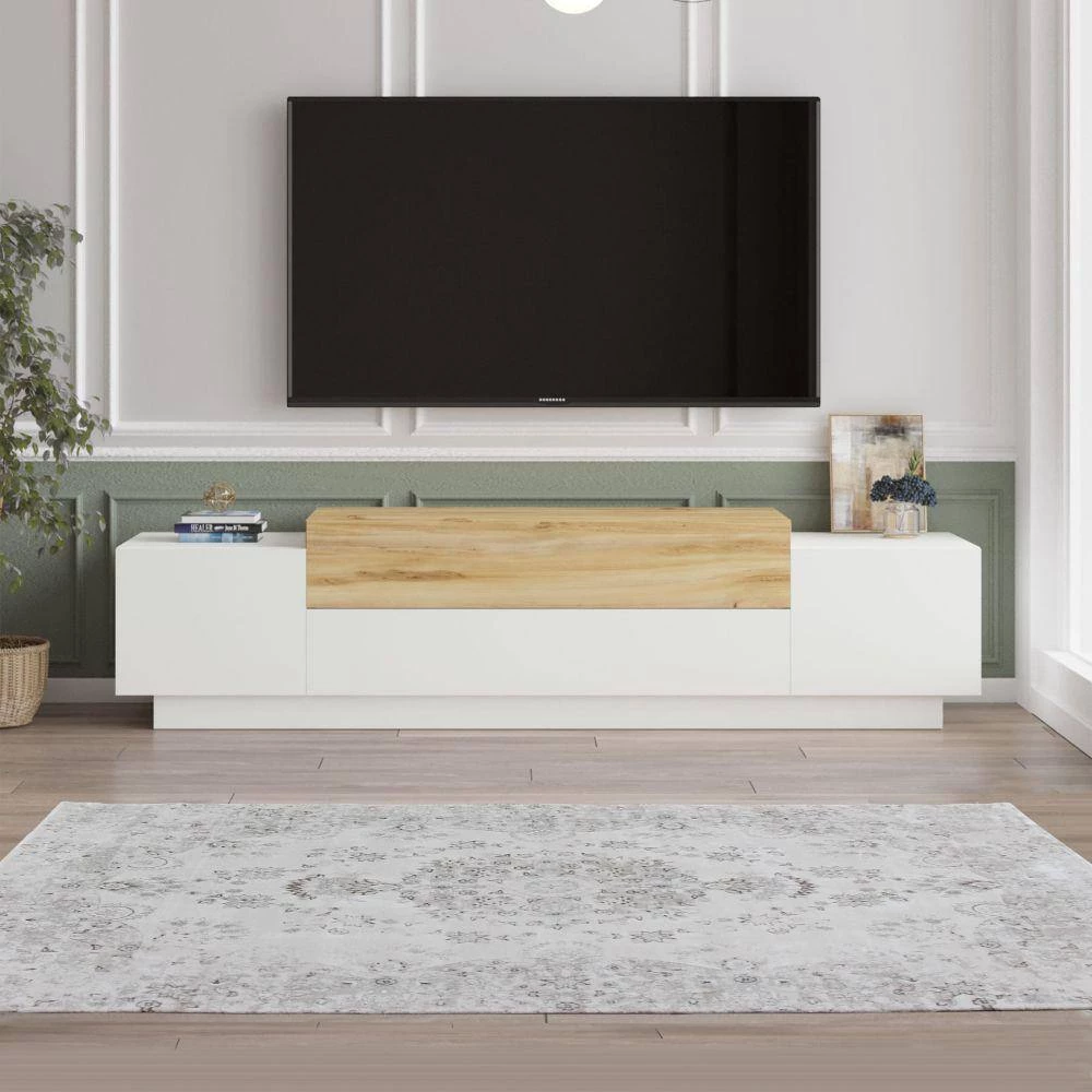 Bright, brilliant, and stylish, this minimalist style TV entertainment center is the epitome of quality craftsmanship. Featuring a simple rectangular silhouette with a clean lined design, this piece offers four subtle drop down cabinet doors for your living room storage necessities. Handcrafted from high quality particle board with melamine coating to enhance its durability, the top exhibits a subtly raised platform at the center, with stylish wood grain details in a natural brown finish which harmonizes beautifully with the glossy white primary coating. Supported on a floating plinth platform base, this TV console makes a subtle yet bold addition to your current interior aesthetic. Be it transitional, modern, coastal or Scandinavian style, this piece harmonizes with a variety of decor stylings. With a simple, geometric construction, this piece provides open shelf space for your beautifully curated decor. Check out some of the other fantastic options from our premier Belle collection.