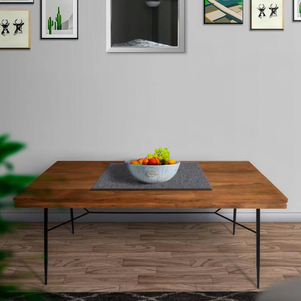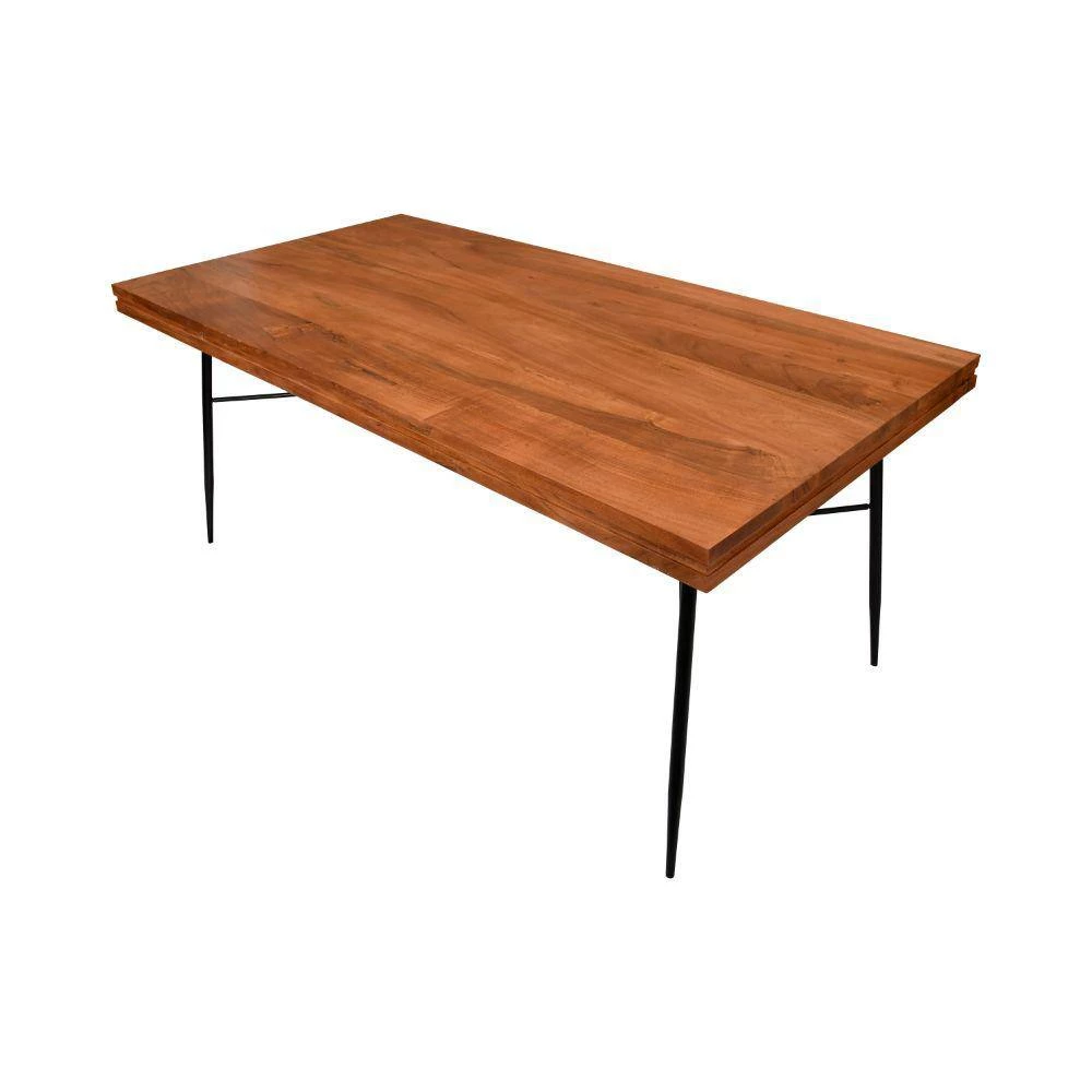 Tie together your dining ensemble with this beautifully handcrafted dining table. Exhibiting industrial style appeal with modern elegance, the table blends in with various decor settings easily. Featuring a spacious rectangular tabletop with a distressed finish in natural brown, the table exudes a minimalistic charm. Made from solid acacia wood, it is supported on sleek metal legs in a contrasting black finish that adds a modern look to the piece. Due to the handcrafted nature of the product, there may be a slight variation in color, finish, wood grain and knots.