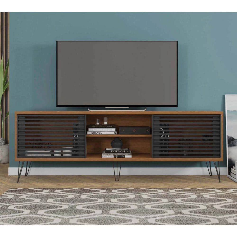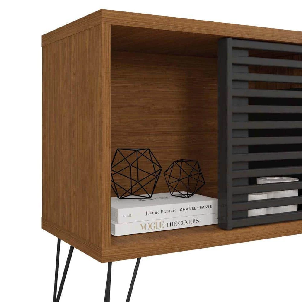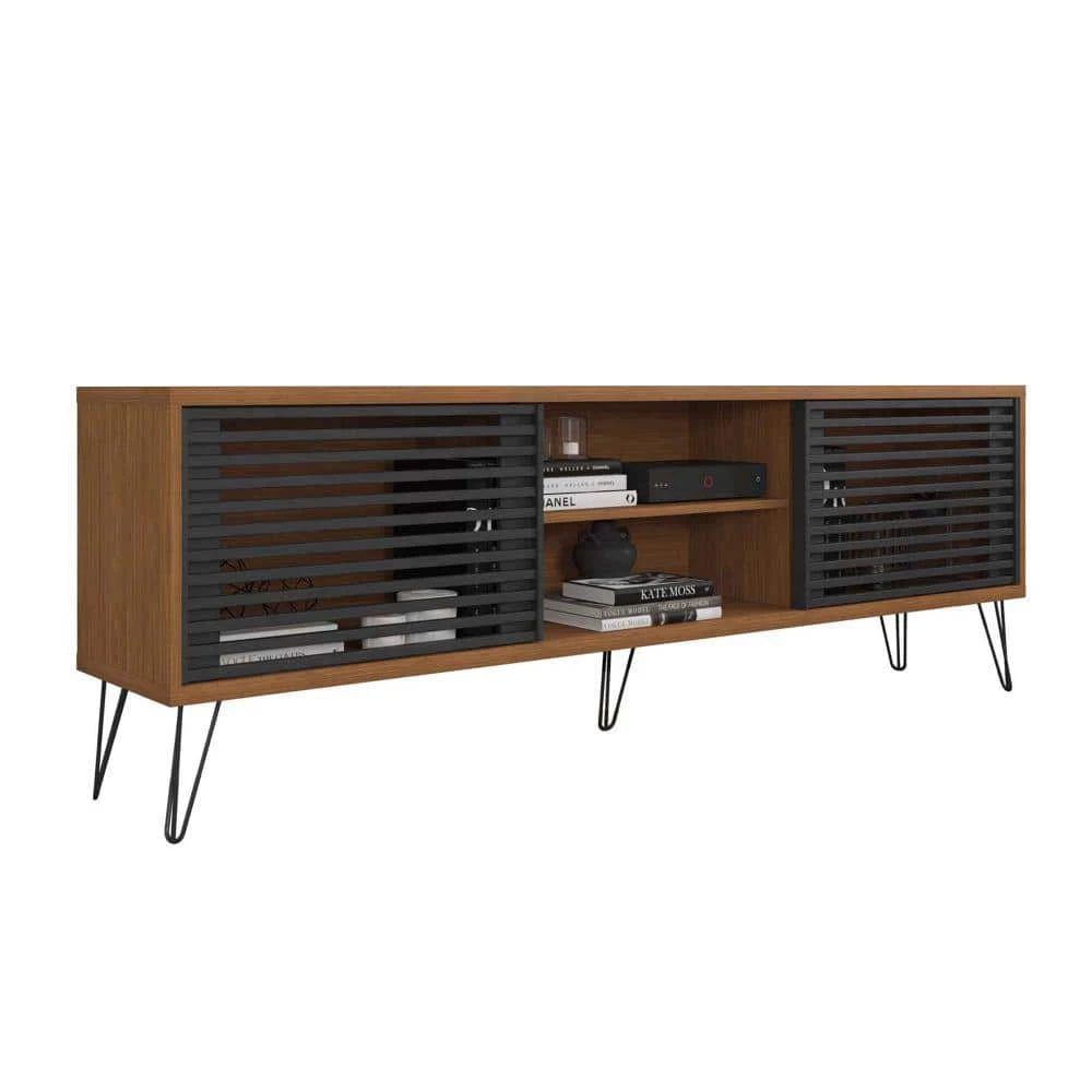 A perfect blend of mid century modern and barn style construction, this TV Stand from the Arthur collection blends in to become an integral part of any decor setting. Featuring 2 slatted sliding doors and 2 open compartments to keep your media gadgets organized, the clean lined design accentuates its overall appeal. Sturdy MDF and MDP construction provides it with lasting durability. Supported on five hairpin Iron legs for utmost stability, the dark walnut brown and striking black tone complements its overall look. An ideal addition to your living space, this TV Stand not only offers a sophisticated abode to your media accessories but at the same time adds a riveting character to your interior.