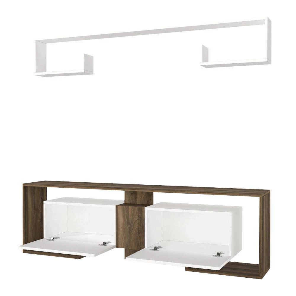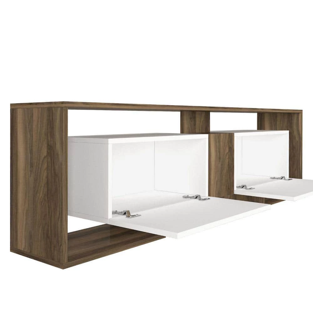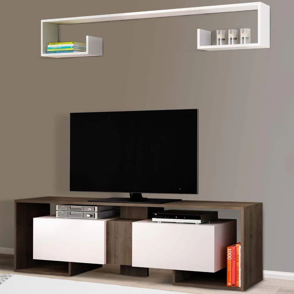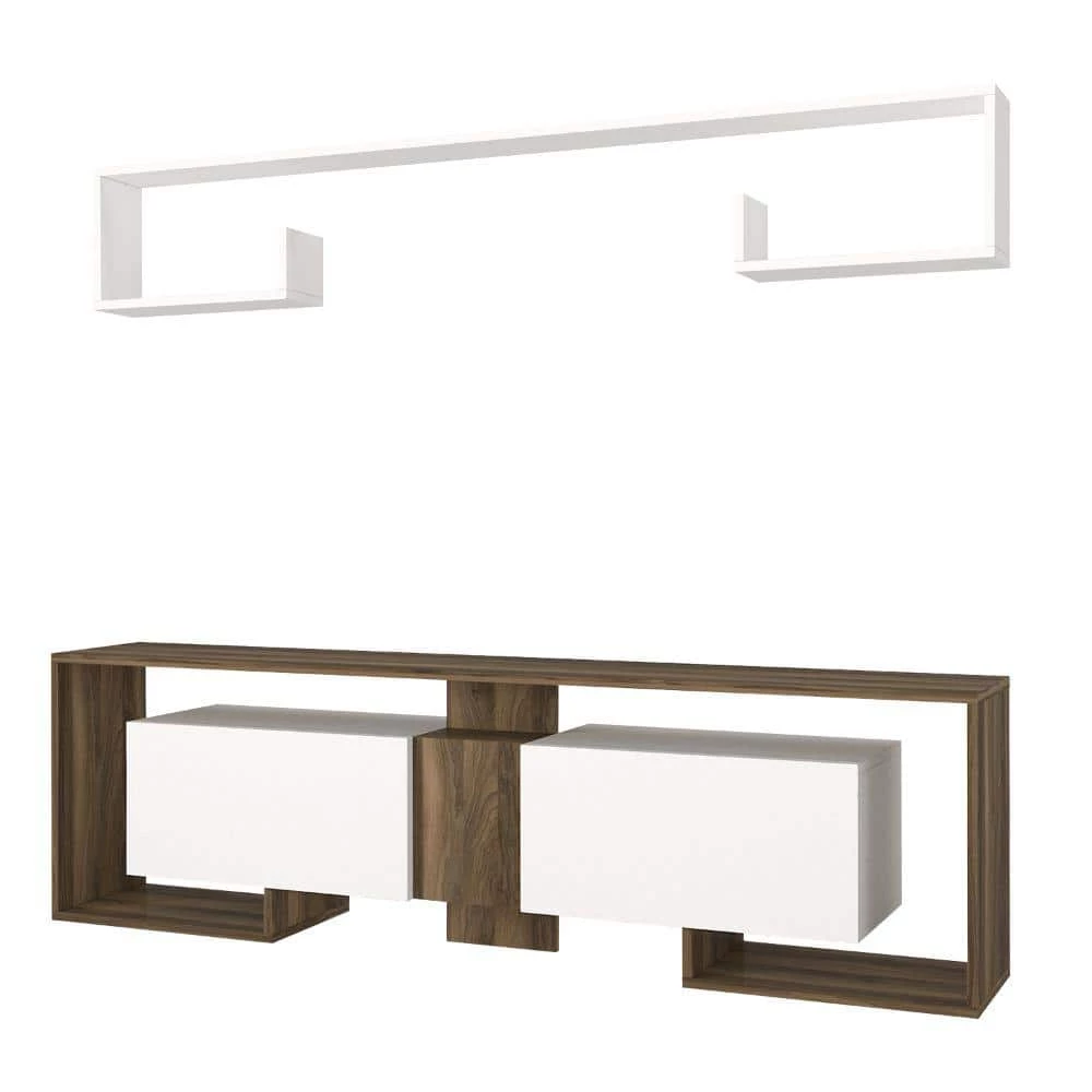 Make a fantastic style statement by bringing home. this clean lined, artisanal designed TV stand storage and entertainment center that comes with a gorgeous, eye catching floating wall shelf. Featuring plenty of storage space in a unique and intricate style, the TV stand itself offers multiple open compartments and 2-drop down cabinet doors to keep your media devices and electronics perfectly organized. The meandering style wall shelf replicates the ancient Greek fret design with a modern twist, and offers a striking display space to show off collectibles, showpieces, photos, or other decor. Handcrafted from high quality particle board, the set is coated with a melamine solution. The natural brown accented TV console unit compliments the glossy white coated doors and accent wall shelf. With a simple, geometric construction, this set will continue to provide open shelf space for your beautifully curated decor for years to come.