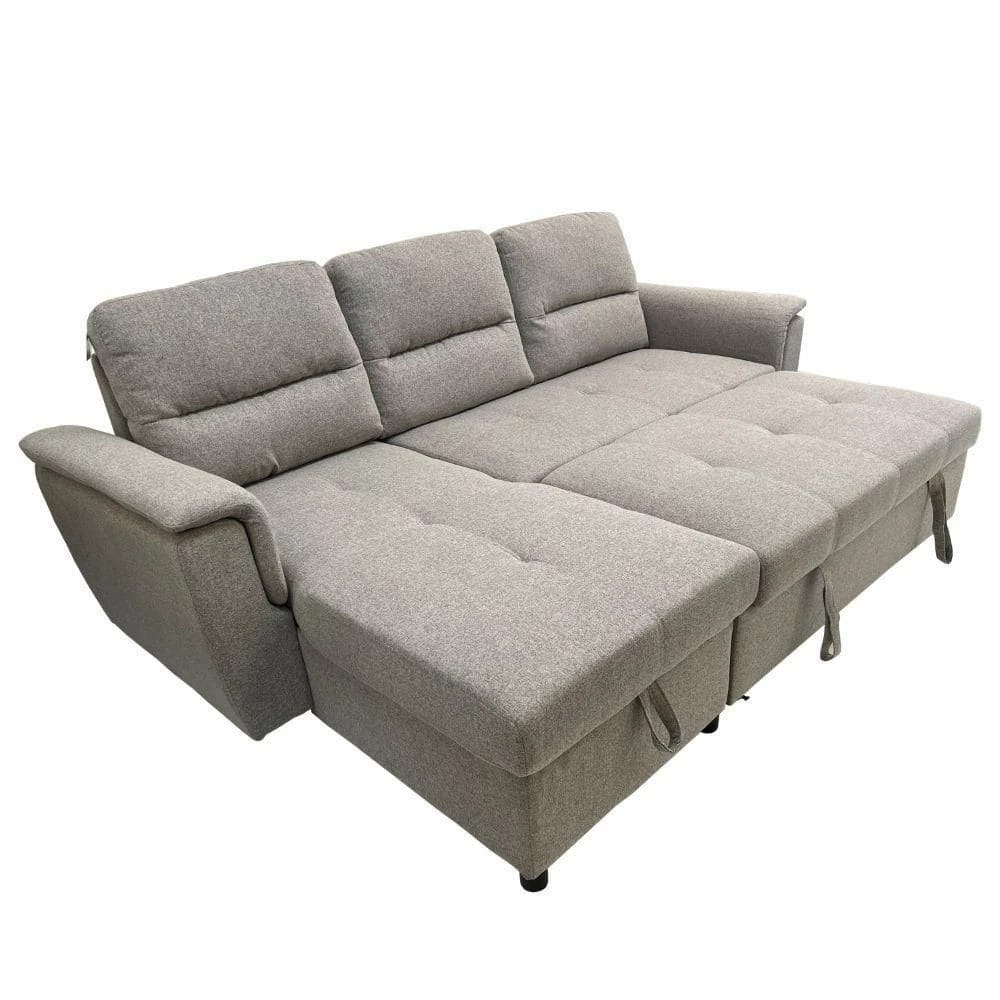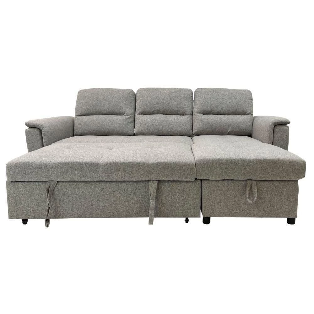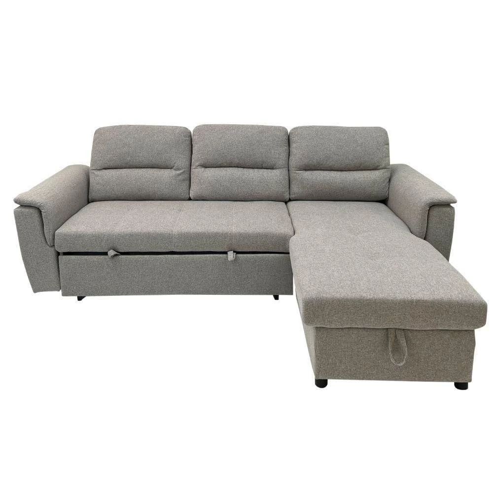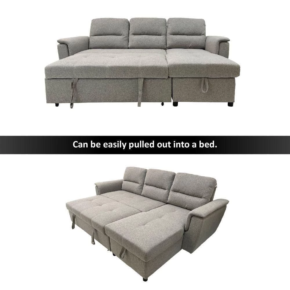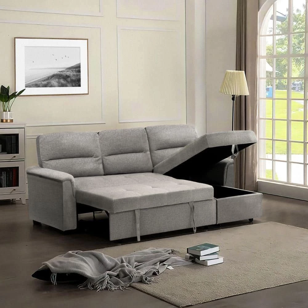 A unique blend of contemporary elegance and timeless comfort, this two piece sofa set is a perfect fit for your living room, lounge, or den. Featuring a pull out sofa that can easily be transformed into a bed to host overnight guests, this set also includes a lift top storage chaise that offers plenty of space to hide clutter and keep pillows and blankets. Each piece is handcrafted from durable wood and a sturdy metal frame for lasting stability and quality. The clean and simple light gray upholstery allows the set to harmonize with a variety of interior decor.
