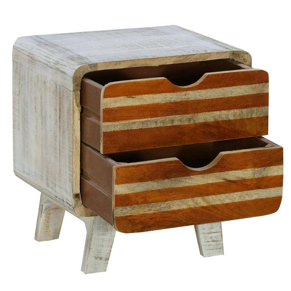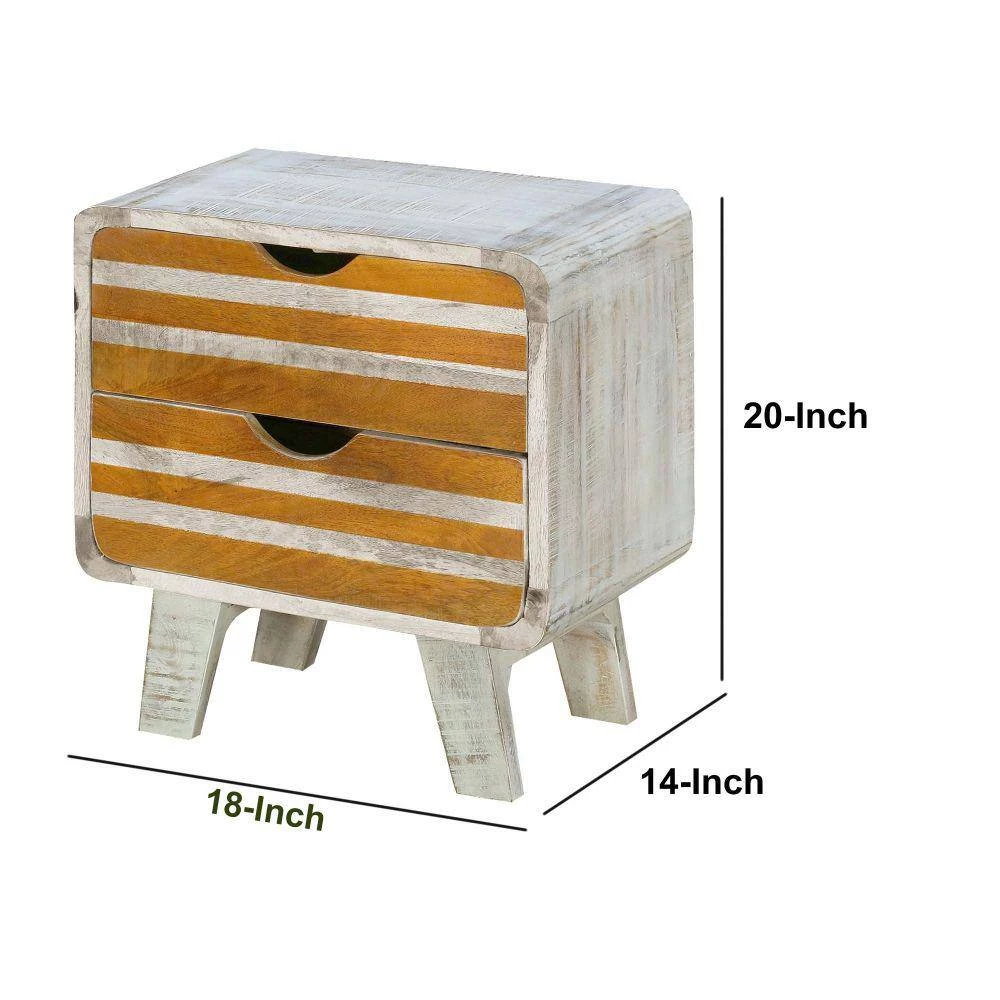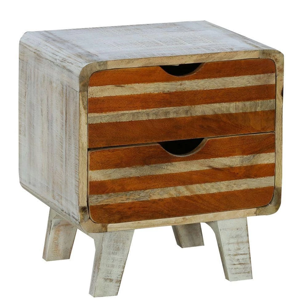 Give a quick makeover to a room with this classic rustic style side table that can also be used as a nightstand. Featuring 2 smooth gliding drawers to keep your essentials handy and organized, the spacious rectangular top offers plenty of surface area for your table lamp or bedside books. Made of solid mango wood frame for lasting durability, the neutral brown and antique white front panel showcases a striped design against the antique white frame. Supported on stylish angled legs for stability, the aesthetically pleasing grain details give the piece a naturalistic charm. The perfect blend of style and sophistication, this fun piece of furniture is sure to add a captivating charm to any kind of interior decor. Check out our Wilma collection for matching pieces.