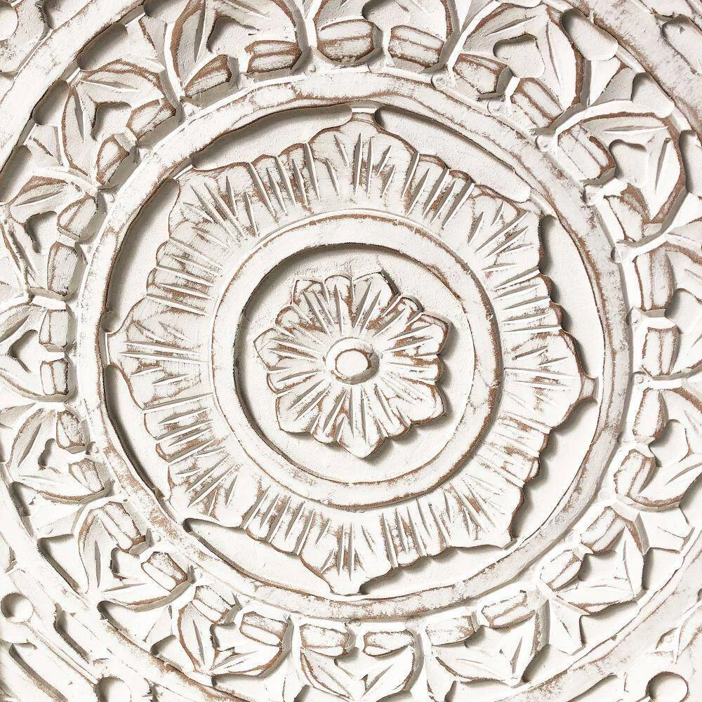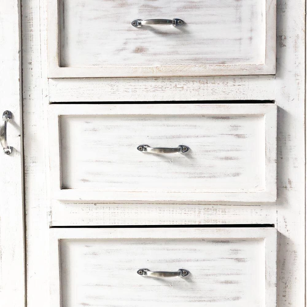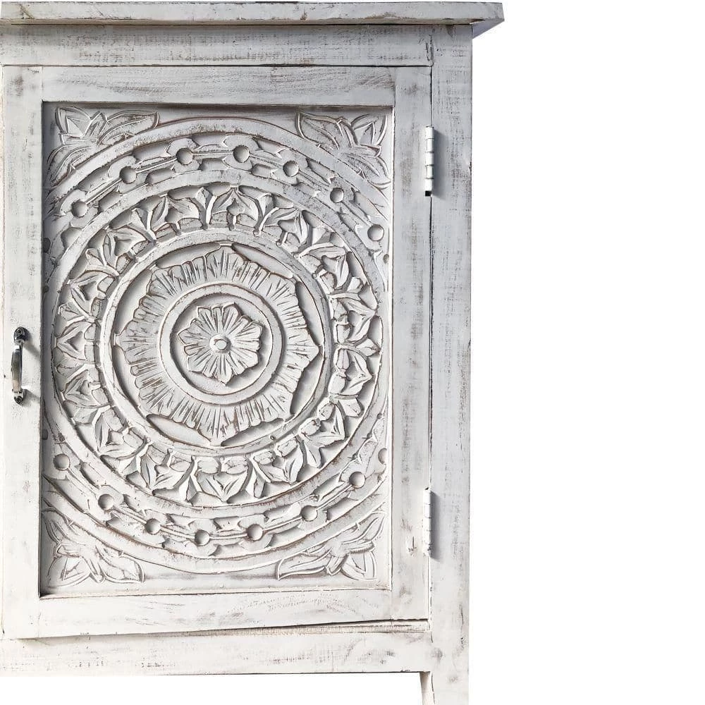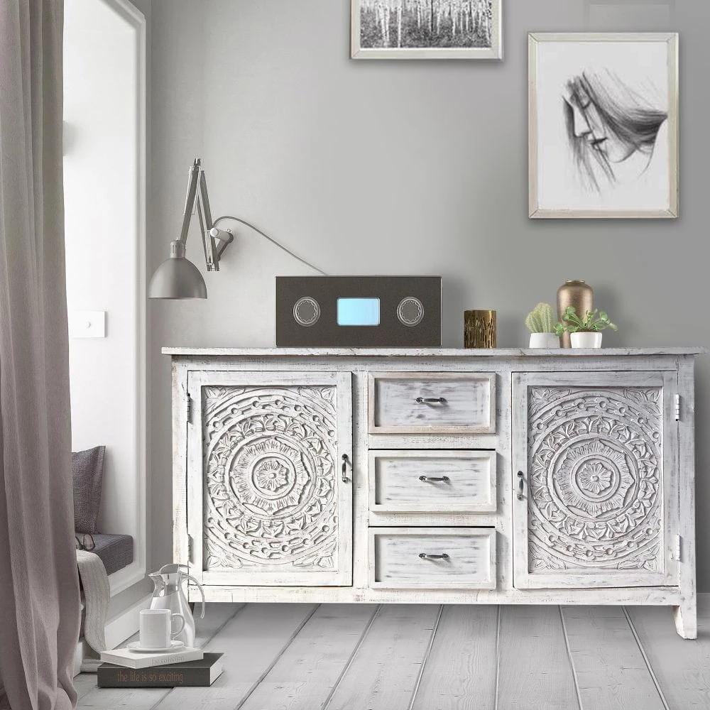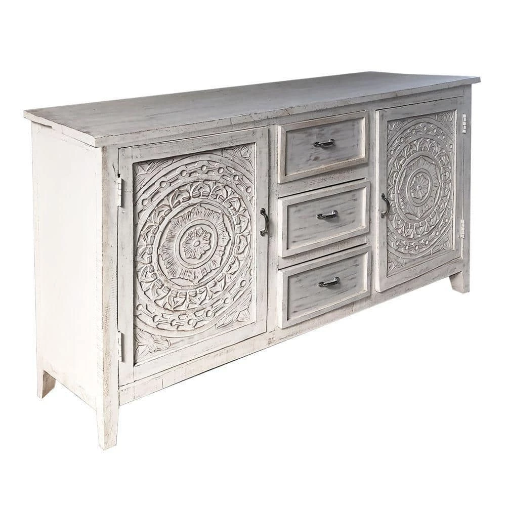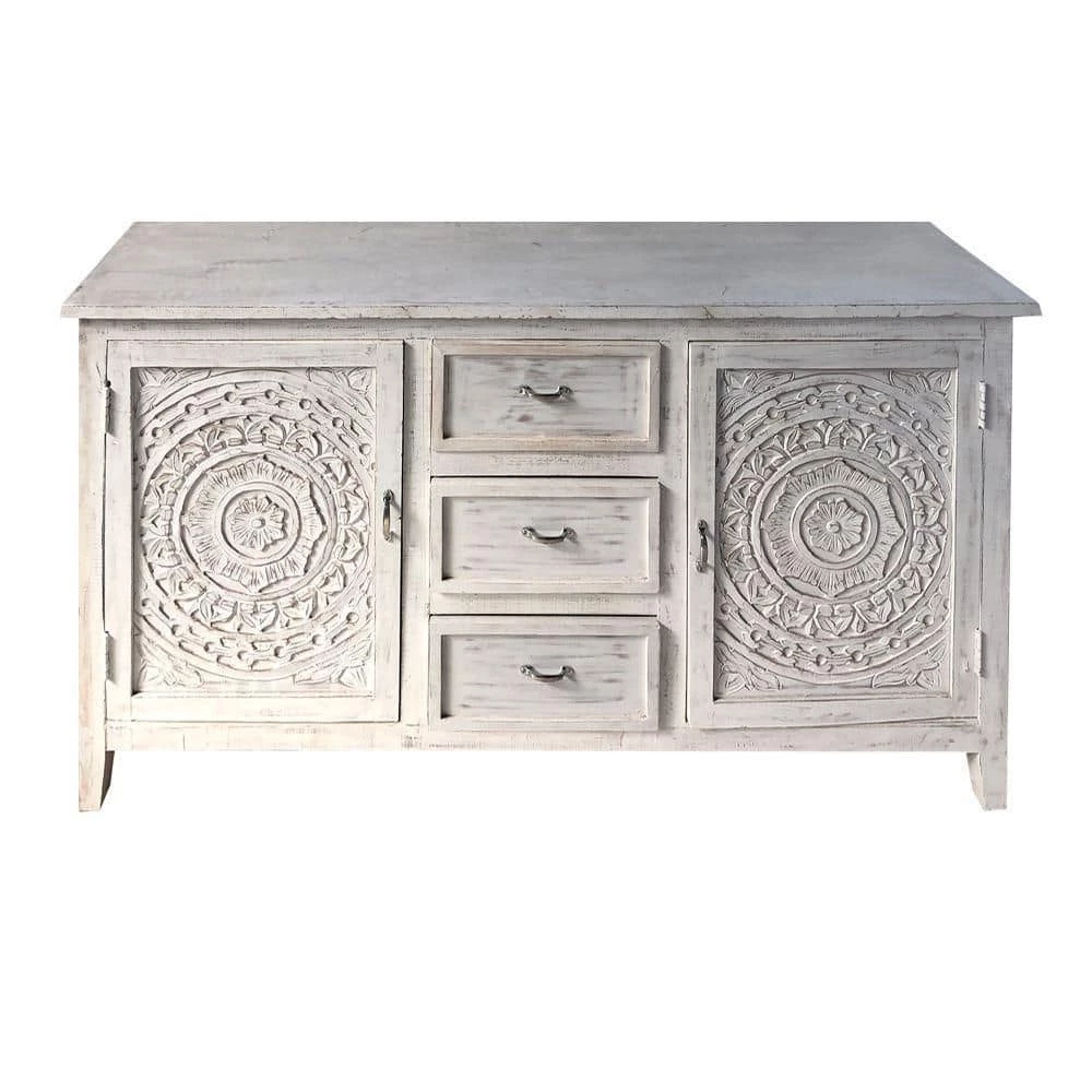 Give your dining space a makeover with this sophisticated, stylish sideboard console buffet. It has three smooth gliding drawers and two cabinets, perfect for storage. This piece is handcrafted from mango wood for lasting durability, accented with an antique white finish, and decorated with gorgeous and intricate floral cut out pattern. The brushed steel handles facilitate easy access to the storage space and the grain details add a subtle, homespun charm to it. The spacious rectangular top offers plenty of room to display decorations and collections alike. Check out our Olta collection for matching and coordinating pieces.