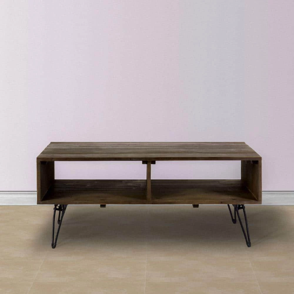 With the world going green, we have the perfect piece of living room furniture to complement your interior decor. This farmhouse coffee table with storage from our best selling Betsy collection is environmentally friendly, as it is handcrafted completely from solid reclaimed fir wood. Featuring a rectangular silhouette, it has two storage compartments to keep magazines, books, vases, and much more. The natural brown wood harmonizes with the black powder coated legs, adding a pleasing appeal to your living room, lounge or den. Supported on sturdy wrought iron hairpin legs, the subtle wood grain details goes perfectly well with a variety of decor settings. This coffee table has a spacious tabletop for coffee breaks, and free time for reading or working on your laptop or tablet.