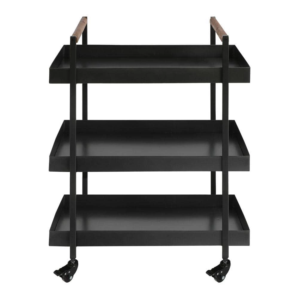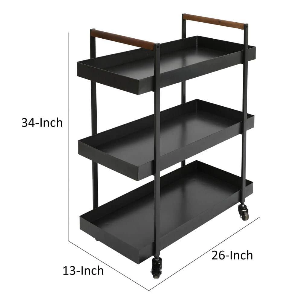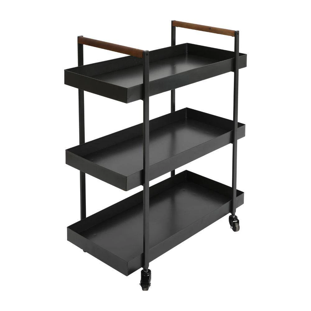 Bring elegant and simplistic style to your Bar, kitchen and dining space with this convenient rolling bar cart, offering plenty of space with its three tier storage. With rectangular shelves that have tray like raised edges, the piece is made from a durable solid metal frame in black finish with natural wood handles for lasting durability and a bold character. The extended frame conveniently forms into two side handles to facilitate movement and offer a space for hand towels. Equipped with sturdy casters for better mobility, this piece is incredibly versatile in its utility throughout the house. Sure, it can be used as a bar or tea cart for serving drinks, glassware, silverware, ingredients, and condiments, but it can also be used in the bathroom for your toiletries, soaps, oils, and balms, or even in your laundry room as a convenient way to transport clothes and linens. This beautiful and well crafted piece will accompany you for various household needs for years to come.