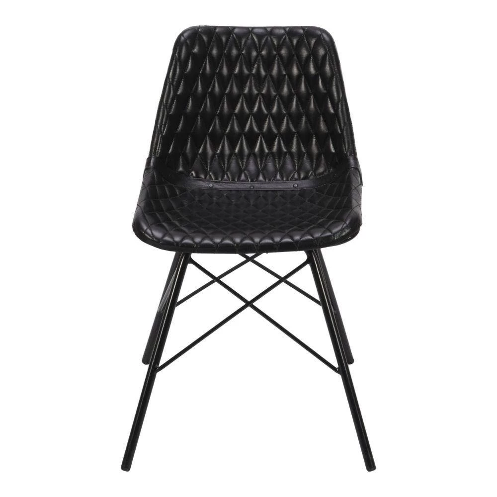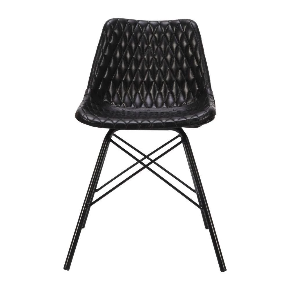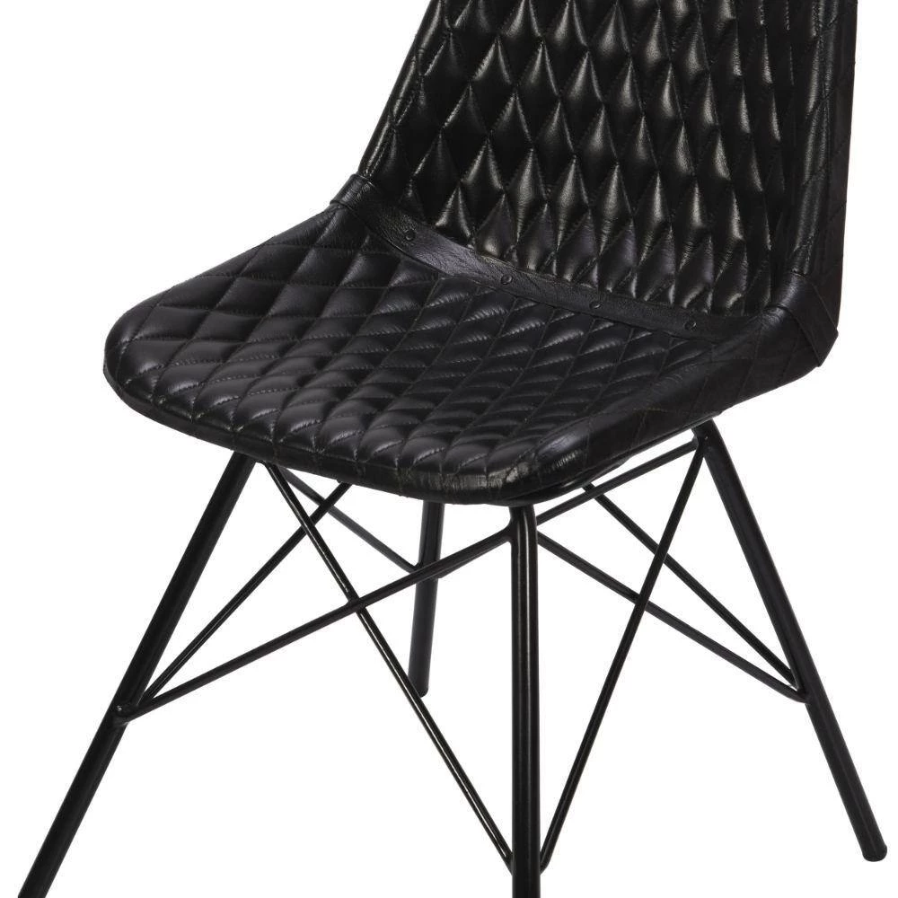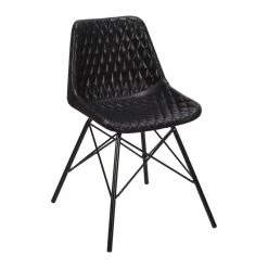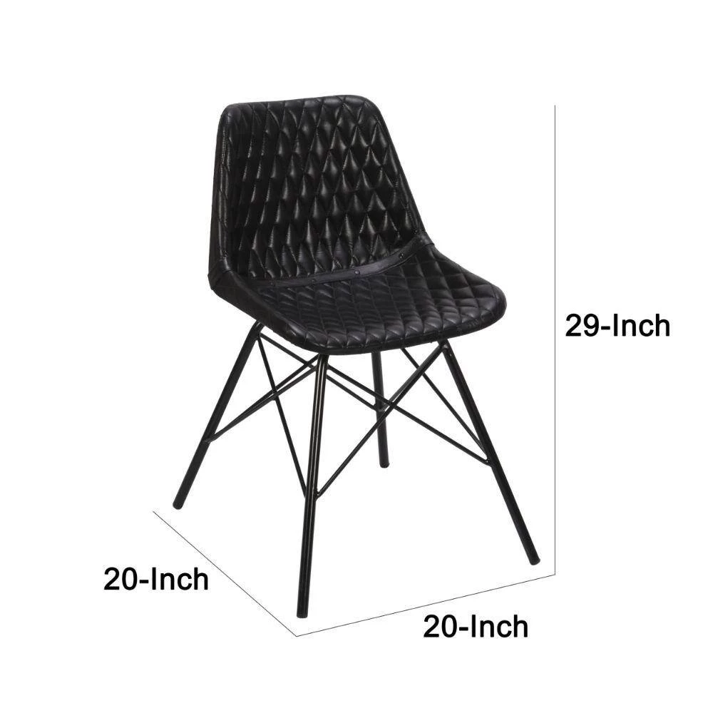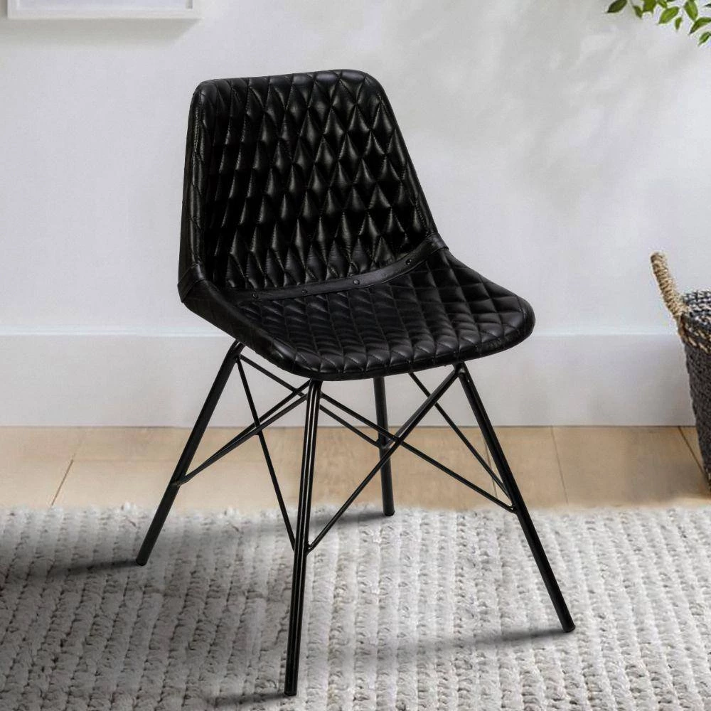 Vibrant midnight black finish meets a modern sophistication with this expertly designed leather accent chair. With a hand stitched diamond pattern, the chair offers a bucket style seat with foam padded seat cushions for supreme comfort and a reliable sitting experience any time of the day. Handcrafted from a lightweight yet sturdy iron frame in black finish, it is upholstered in pure genuine leather for long lasting durability and style. The angled legs are bolstered with reinforced support braces that also ensure the longevity of this piece, while the black rivet accents on the seat impart a uniquely elegant flair to the chair. This piece also features a perfectly low profile backrest that promotes good posture and provides comfort while eating or conversing. A perfect chair for any interior decor style, it makes a grand fit for your bedroom, den, living room, lounge, or dining space.