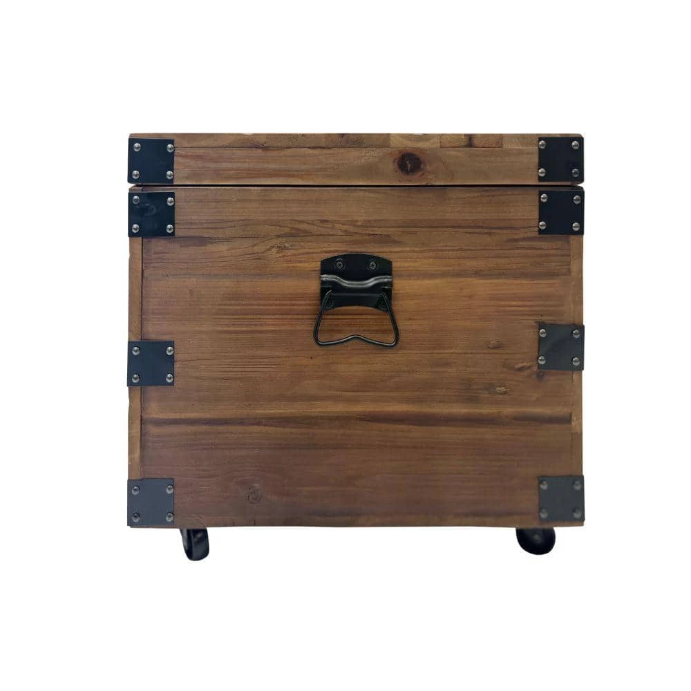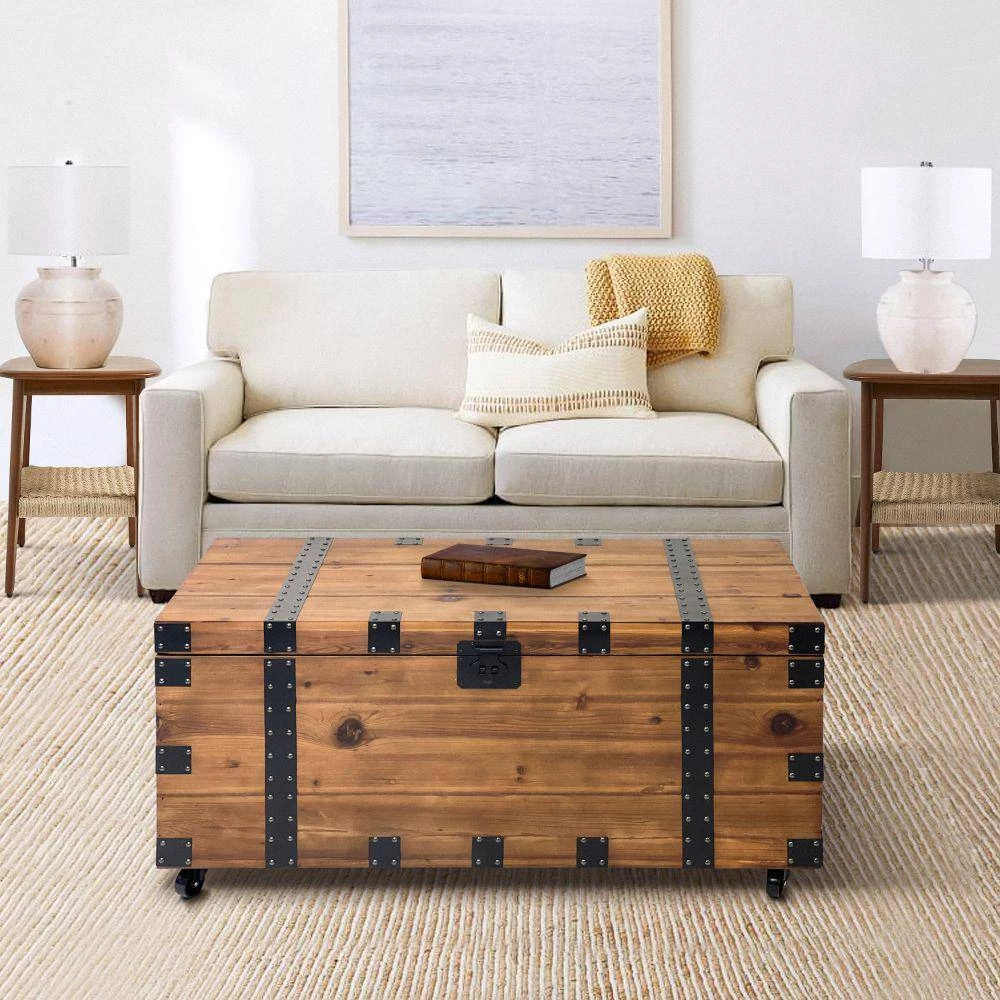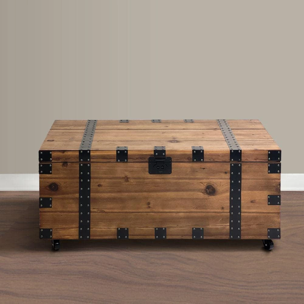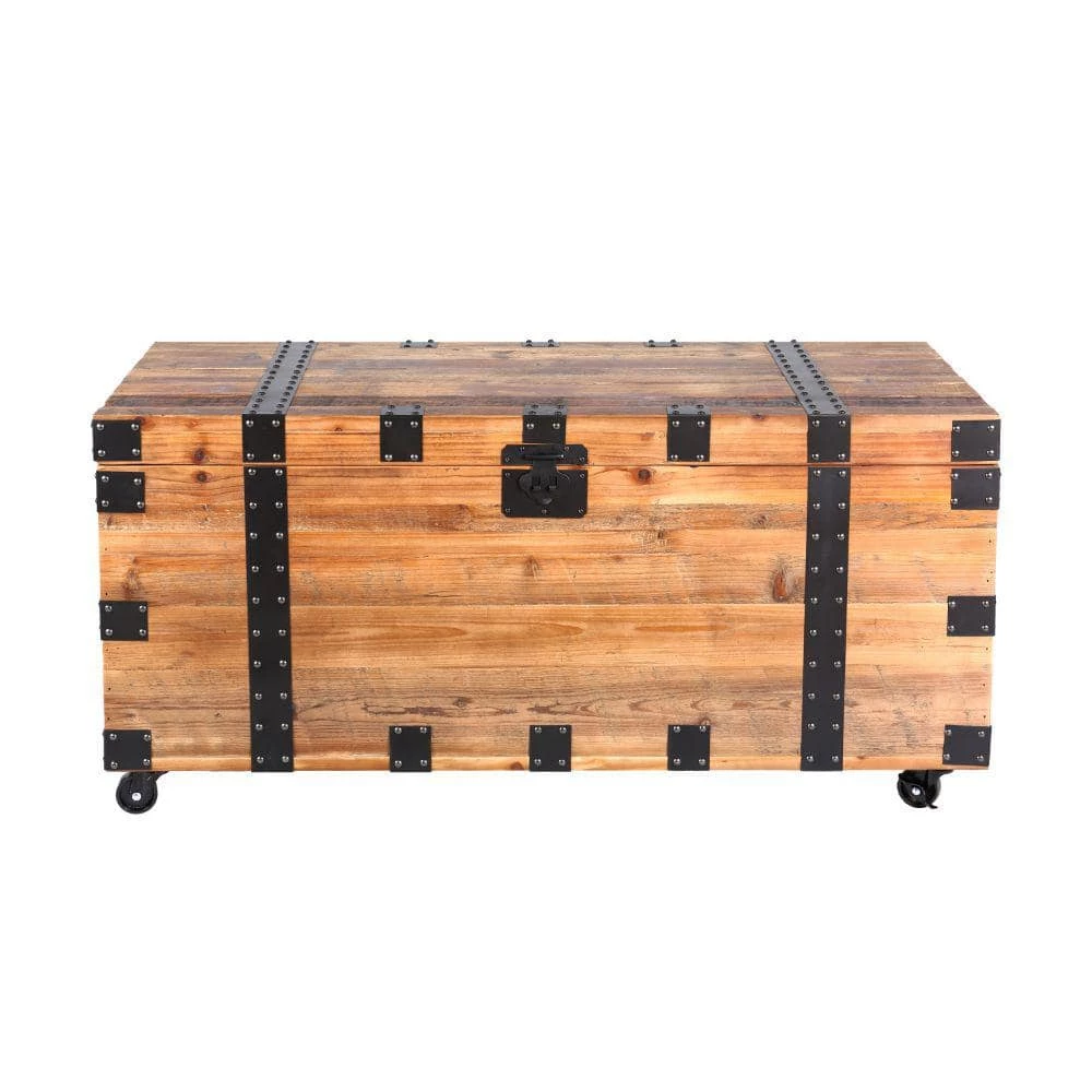 Eclectic design meets industrial style and expert craftsmanship in this wooden coffee table, that doubles as a trunk from our best-selling Blake collection. With a classic rectangular silhouette, it is handcrafted from an environment-friendly solid reclaimed fir wood frame with wrought iron banded embellishments, corner accents, and rivets for a distinct appeal. Supported on caster wheels for easy mobility, the natural brown wood finish harmonizes with the black coated iron accents. Featuring a lift top storage space to keep accent pillows, throw blankets, and living room essentials, this coffee table is the perfect addition for your living room, entertainment space, lobby area, or den. This table offers a sophisticated and spacious tabletop for coffee breaks, breakfast, and leisure time such as reading or working on your laptop or tablet.