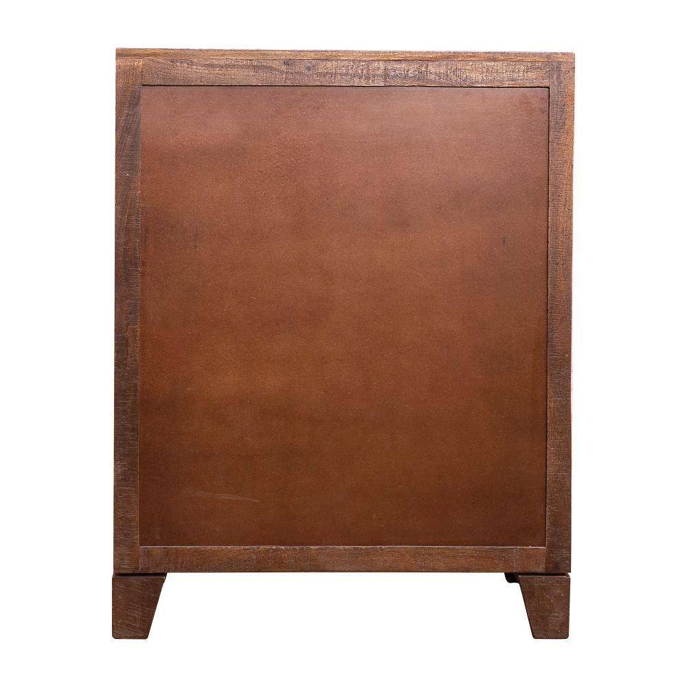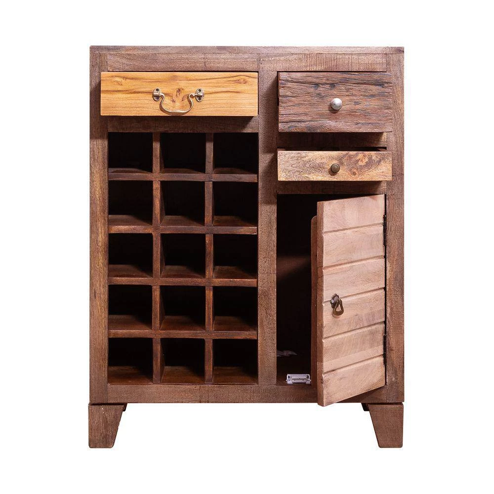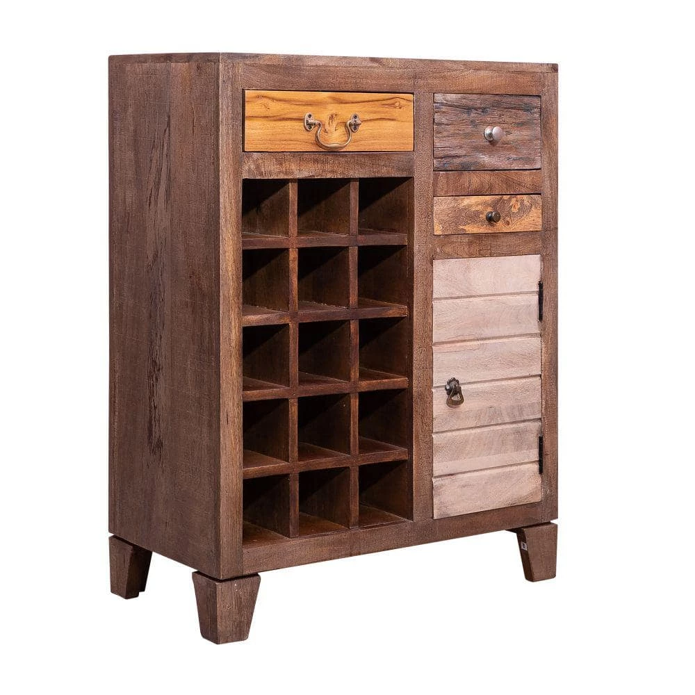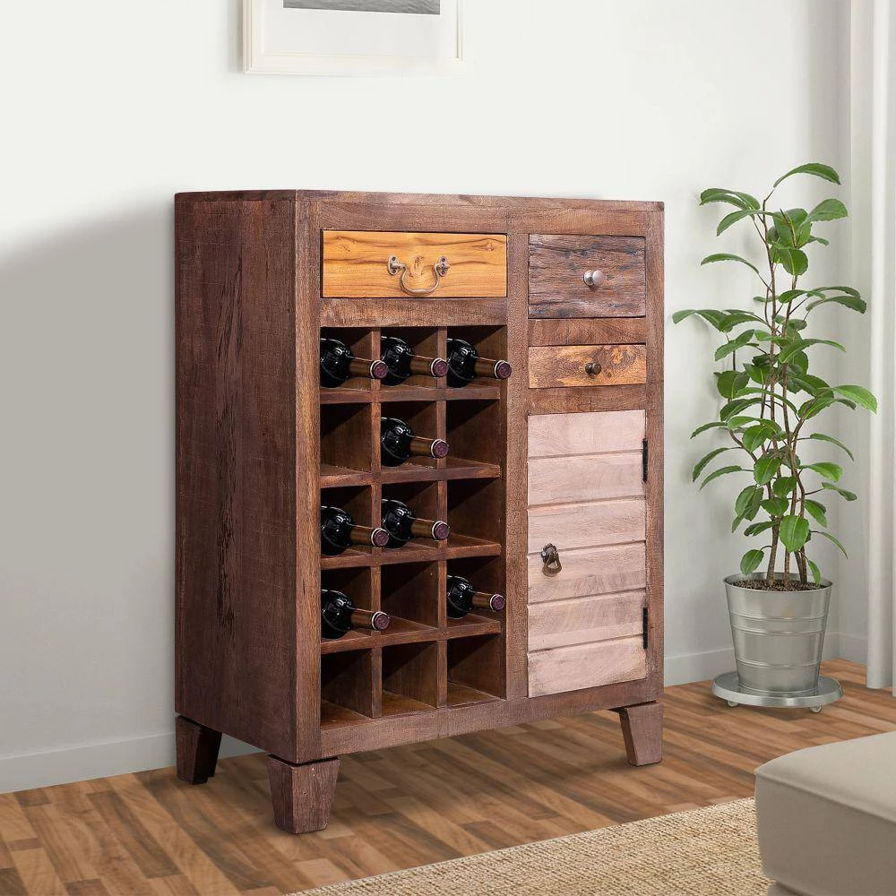 Designed with the consideration of convenient storage in mind, this Wine Cabinet is sure to accentuate the aesthetics of your interior by its mere presence. Incorporated with 3 smooth gliding drawers and 1 door, it comes with a bottle holding capacity of fifteen. Constructed sturdily from the wood frame for prolonged durability, the aesthetically visible grain details complement the multi shade brown finish all over the frame. The chamfered legs offer sturdiness to the overall structure while the clean lined design allows it to readily blend with a variety of decor settings. Inspired by transitional style, the drawers are equipped with pull handles to offer quick accessibility to the storage space. Due to the handcrafted nature of the product, there may be variation in color, finish, wood grain and knots.