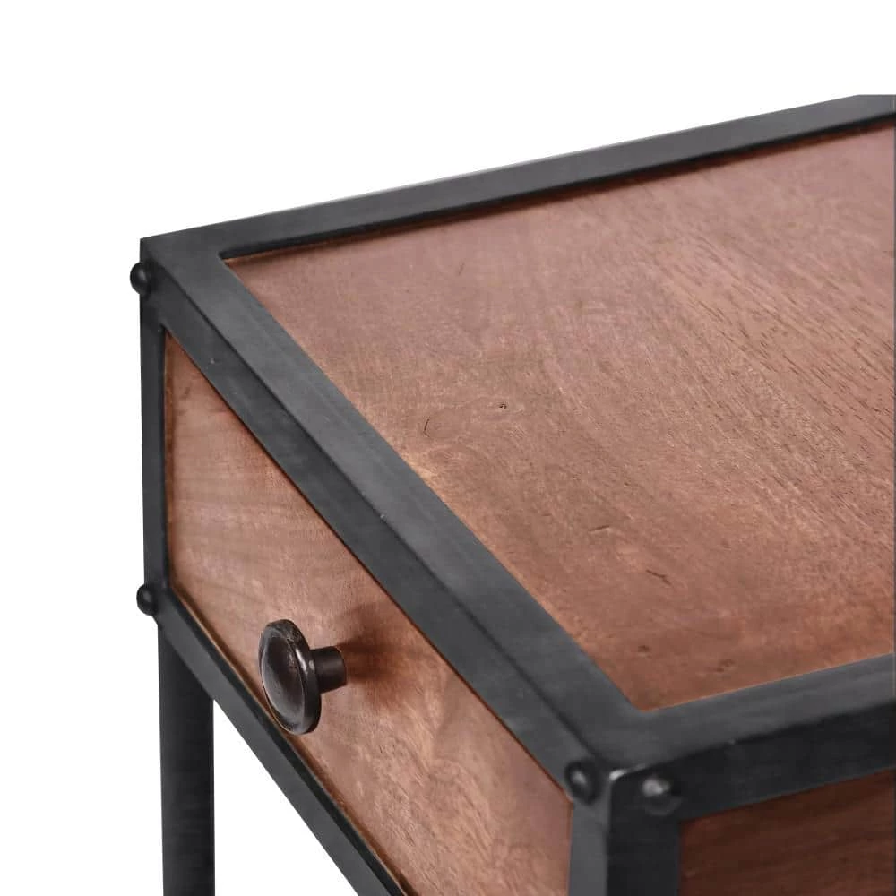 Perfectly wedged between living room furniture or filling the corner wall space, this clean lined end table is designed with precision. Bringing the transitional style, its black metal framing contrasts crisply with the brown finish mango wood in order to pair well with decor styles. This end table is accented with rivet details at its corners and feature one small drawer with metal knob handle that providing easy opening along with an open bottom shelve for hiding and displaying purpose. Its sturdy construction can easily handle a weight of about 50 lbs.