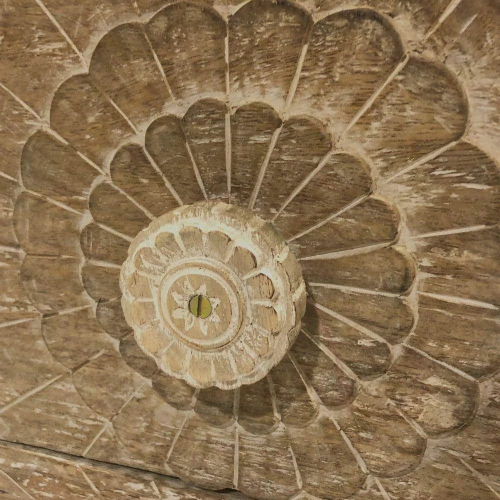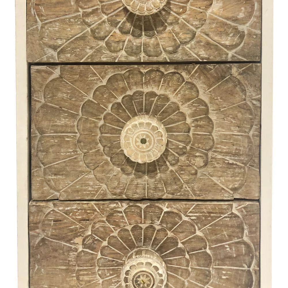 Upgrade your living space with the inclusion of this farmhouse style Accent Storage Cabinet, featuring handcrafted mango wood structure in dual tone finish. Features 3-smooth gliding drawers with floral engraved drawer fronts, offering spacious storage to keep your belongings safe while the sunburst design knob pulls offer easy accessibility. Rectangular silhouetted smooth top is perfect for display decorative while the tapered legs offer stability.