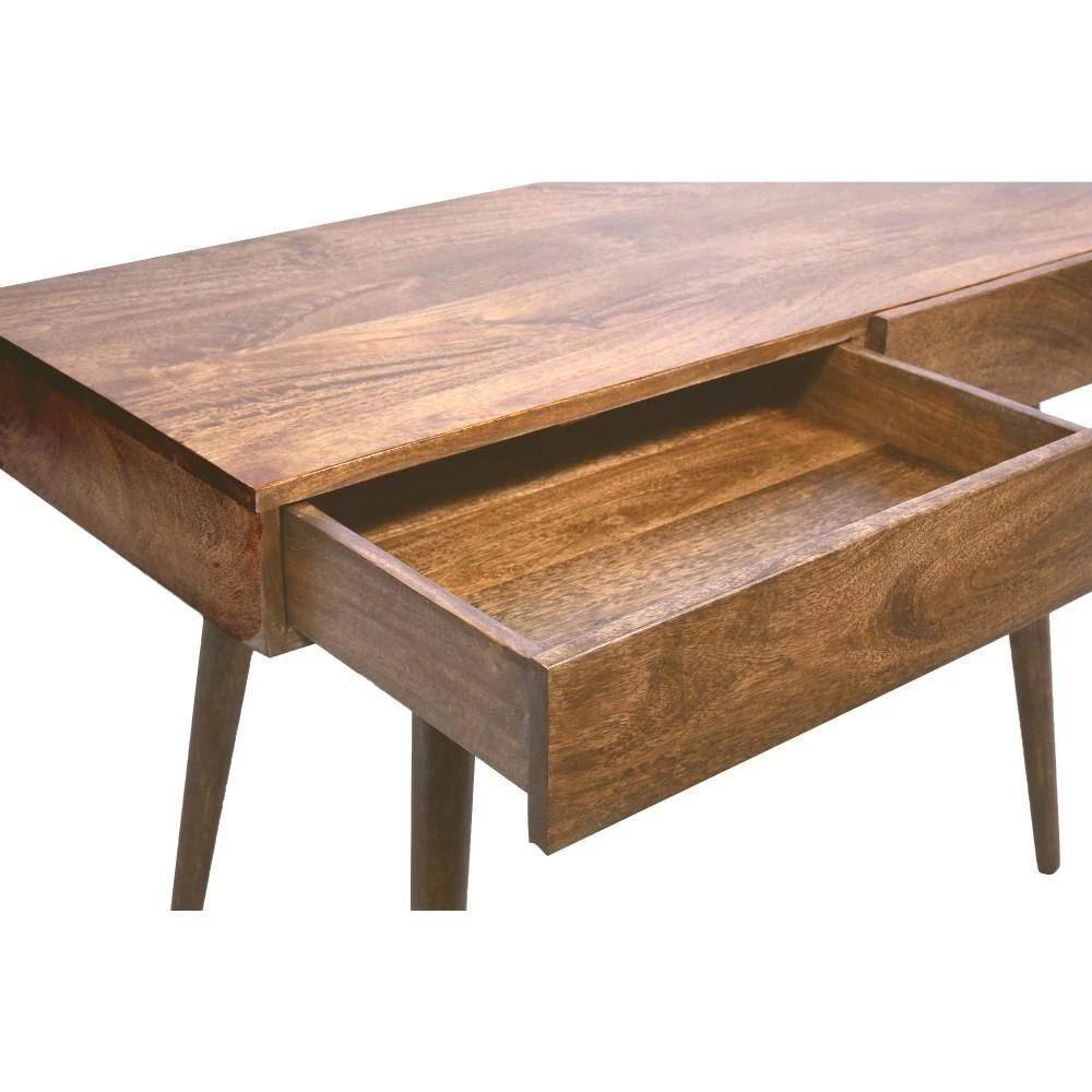Introduce a touch of mid century style to your ensemble with this writing desk in brown finish. It is constructed from mango wood and features two equally sized drawers, supported by diagonally tapered legs. Minimal in design, it comes with aesthetically visible wood grain details that accentuates its overall look. This writing desk provides a perfect placement in your home office and study room while the smooth rectangular is spacious enough to offer a proper arrangement of your laptop, stationary and decorative items.