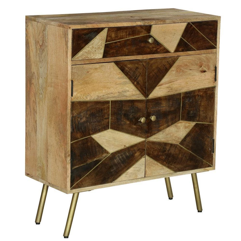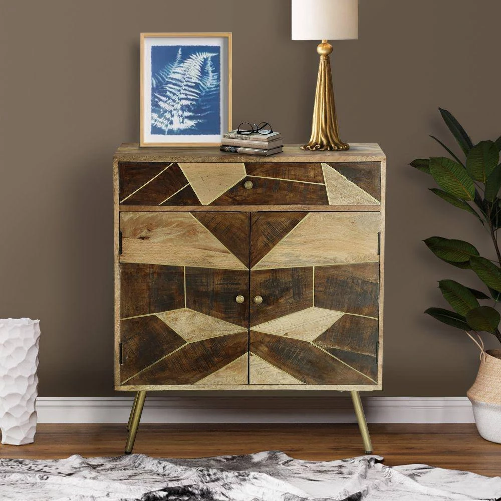 Sophistication meets geometric inlaid design with this incredible storage cabinet. Featuring two soft closing doors to keep clutter out of sight, this piece is handcrafted from mango wood for lasting durability, and the dual shades of brown give it a distinct sense of contrast and beauty. With aesthetically pleasing grain details all over the frame, and round knobs facilitating easy access to storage space, this piece is as gorgeous as it is convenient and functional. Check out our Brita collection for coordinating pieces.