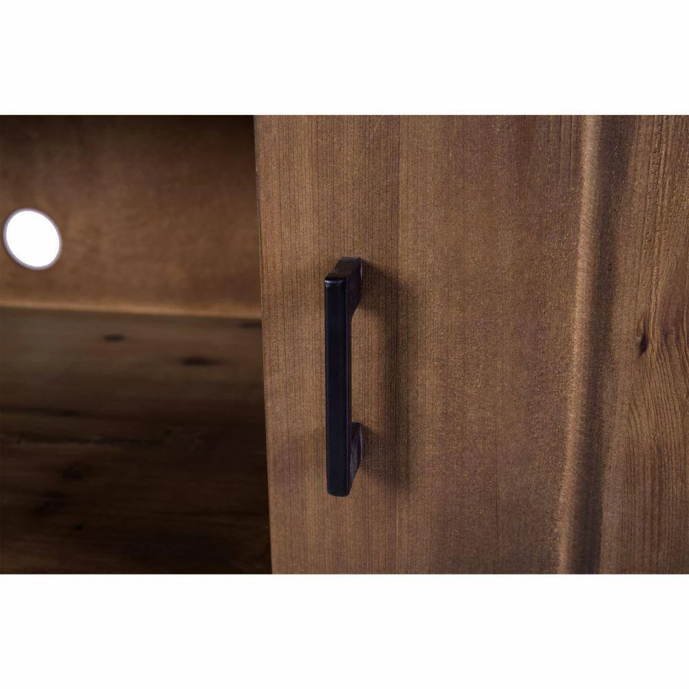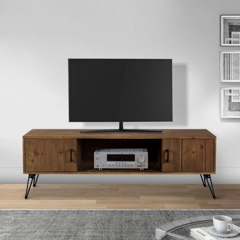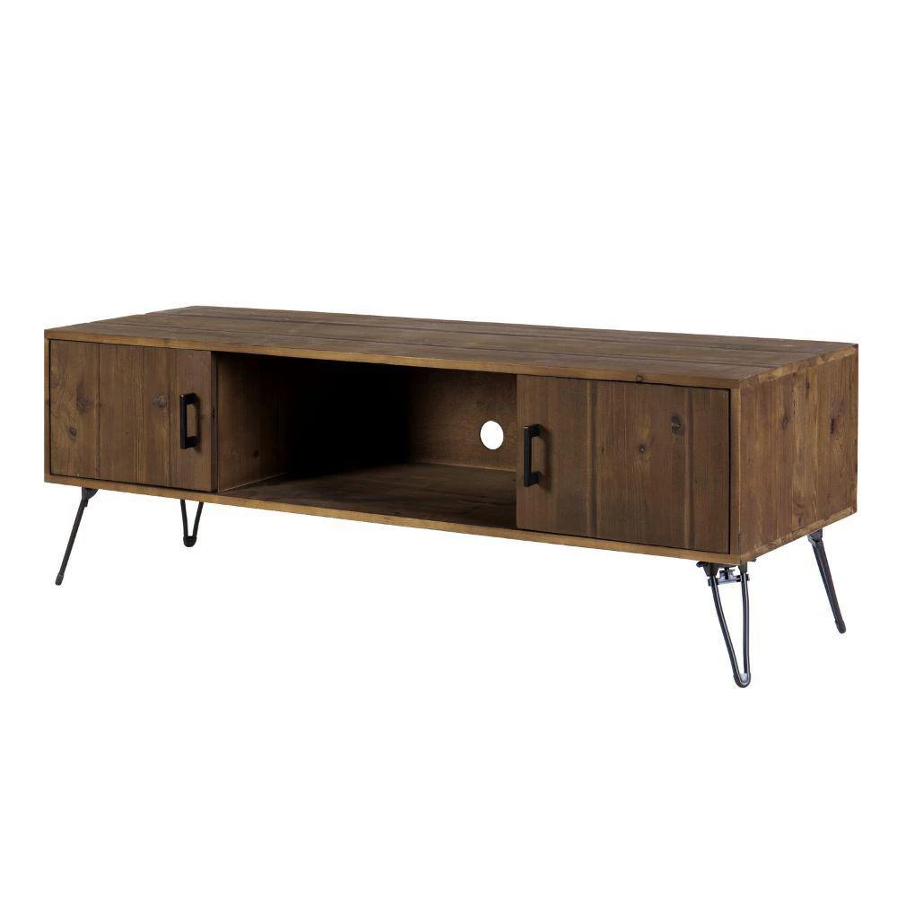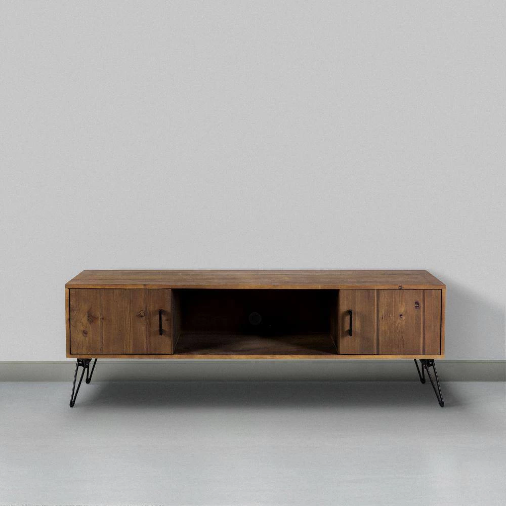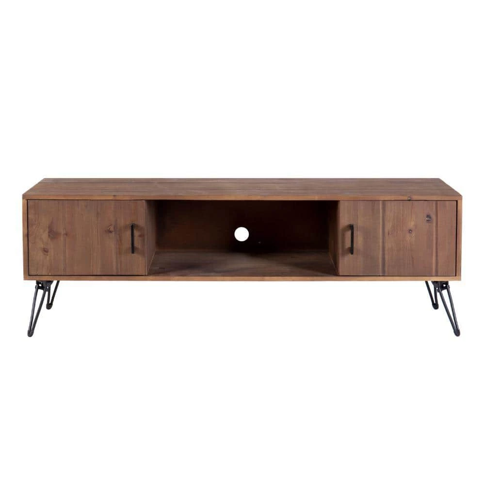 Emanating a bold, rustic flair, this wooden TV and media entertainment center console from our best selling Clive collection is the perfect fit for your entertainment space, living room, or den. Featuring two cabinets and a center compartment with a cut out hole for easy wire management, the TV stand exhibits subtle wood grain details for a nature inspired appeal. It is completely handcrafted from environmentally friendly solid reclaimed fir wood and supported on sturdy wrought iron hairpin design legs. The legs include floor protectors to prevent abrasions or scratches on your floor. The natural brown tone wood compliments the black powder coated legs and door handles. With plenty of space to keep your media devices organized, this TV stand goes perfectly well with nearly any interior decor setting, whether it is traditional, transitional, industrial, modern, Scandinavian, or contemporary.